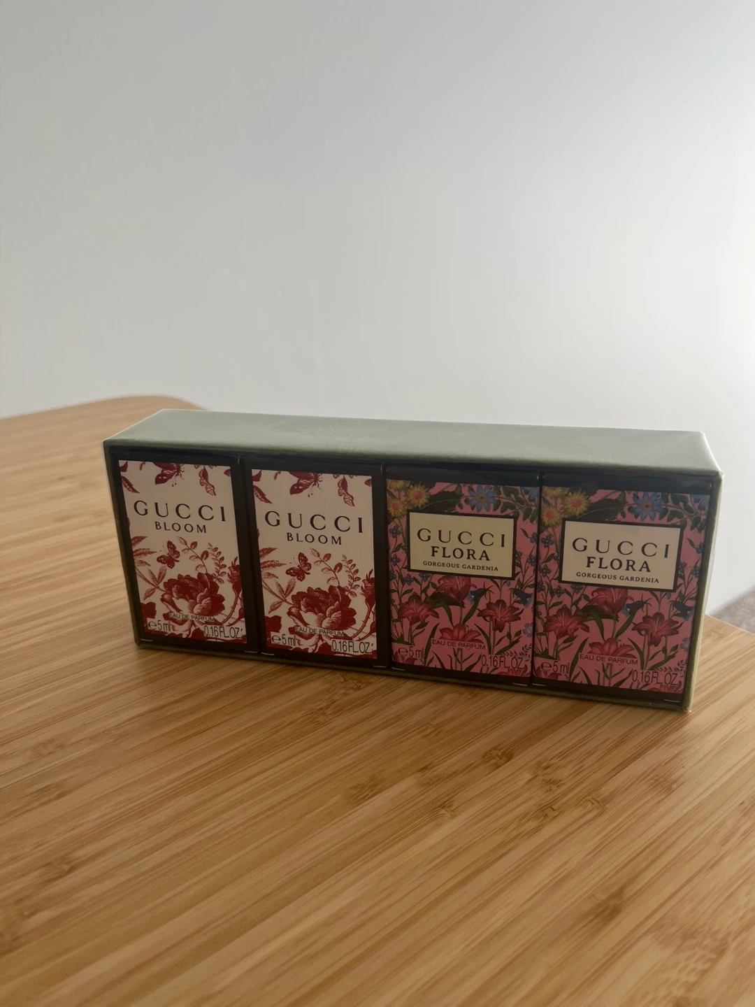 65Selling a set of Gucci perfumes! It was Bought when traveling last month. Completely new with package unopened. This set includes Gucci Bloom and Gucci Flora Gorgeous Gardenia. Each bottle contains 5ml (0.16 fl oz) of eau de parfum. Perfect for trying out these lovely scents!