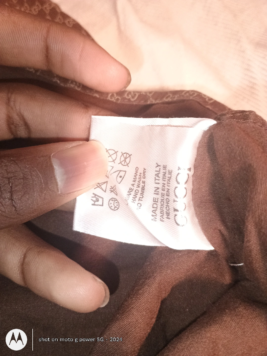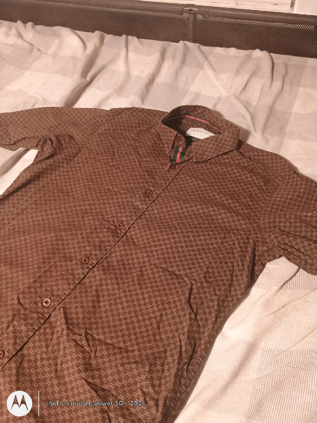 This is a Gucci shirt made in Italy. It's a stylish brown colour with a repeating pattern. The shirt is made of 100% cotton, making it comfortable to wear. It's in great condition and ready for a new home