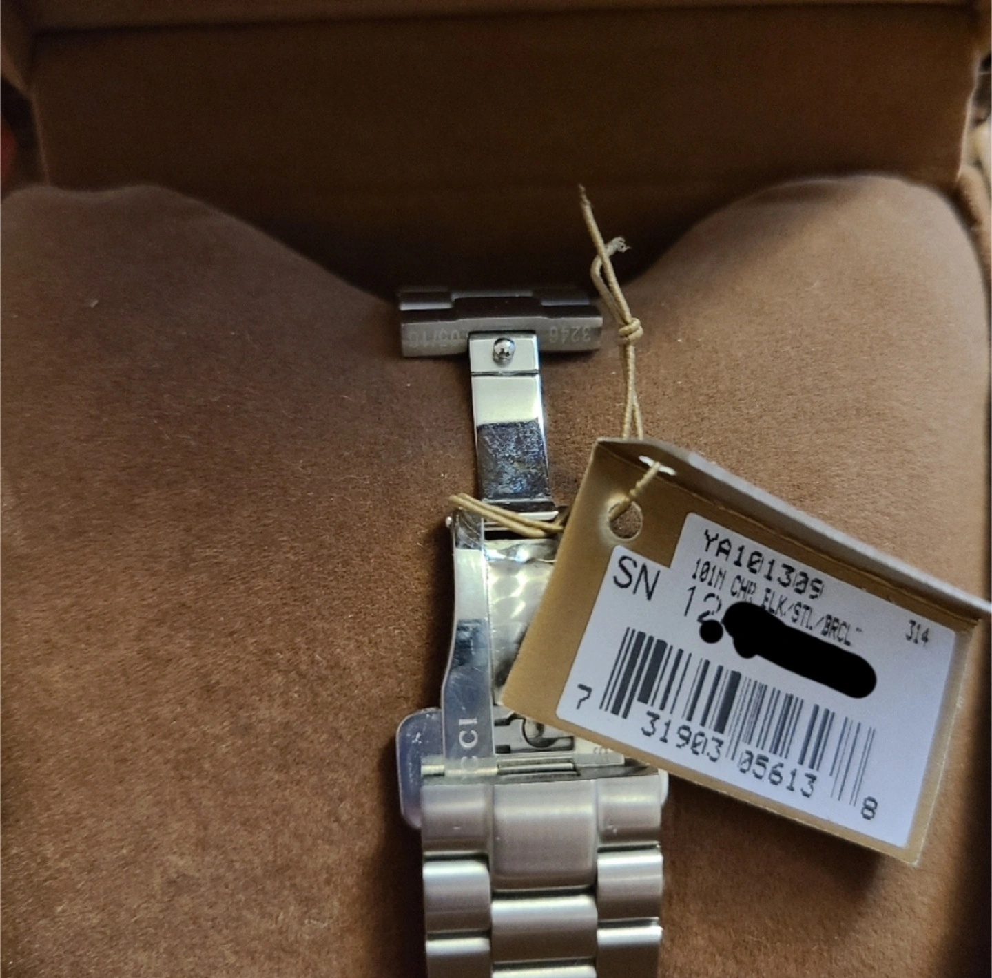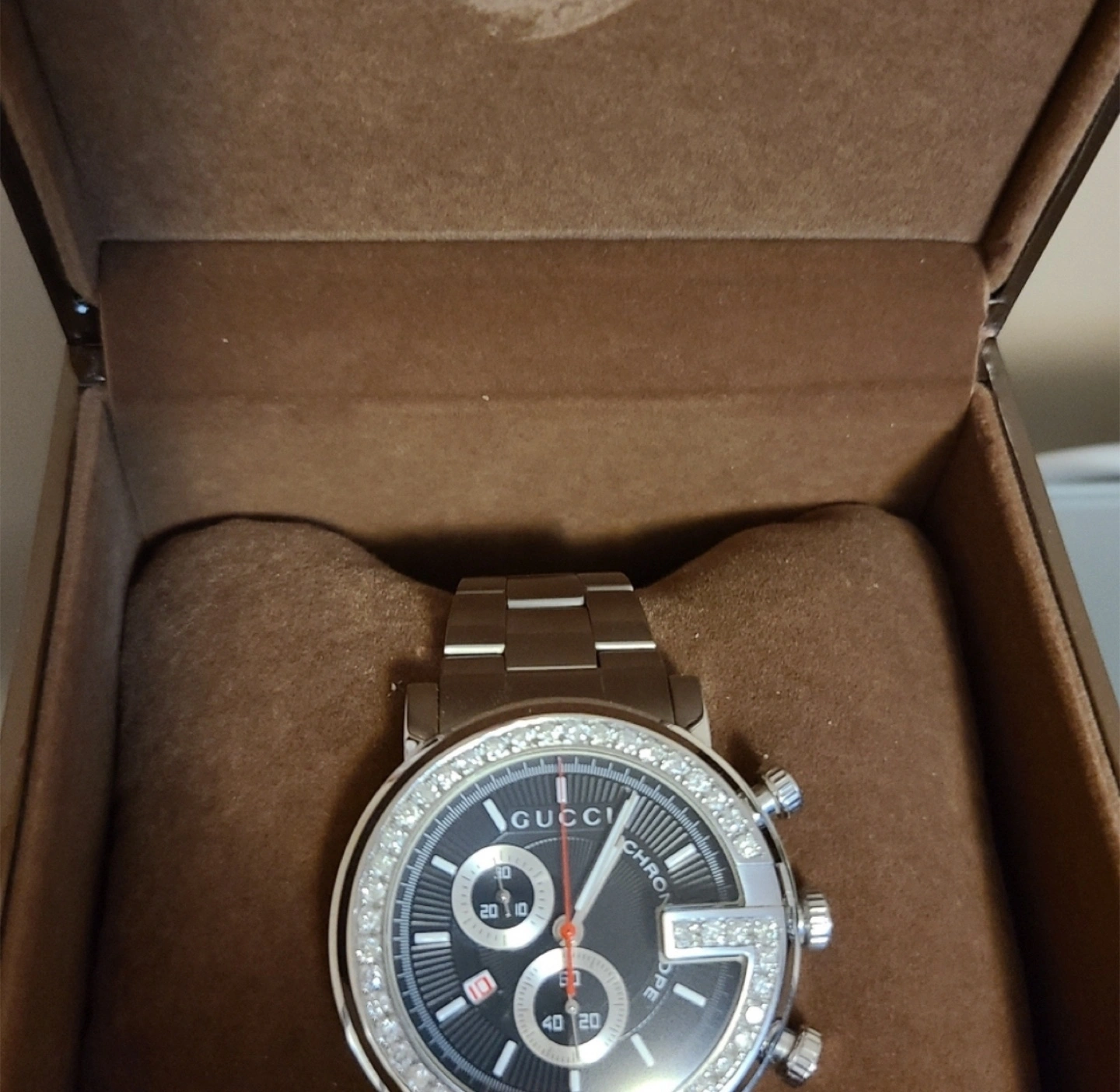 Gucci chronograph watch. Stainless steel bracelet. Diamond bezel. Black face. Comes with original box and tag.