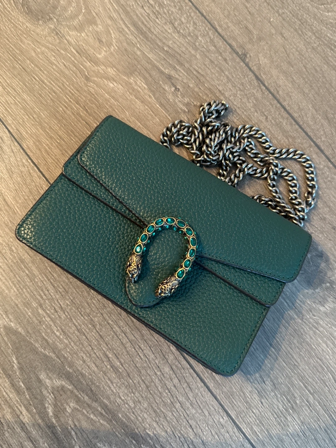 Selling a beautiful Gucci Dionysus chain wallet in green leather. It's in great condition and perfect for carrying your essentials in style. The chain adds a touch of elegance, and the iconic Dionysus closure makes it a real statement piece
