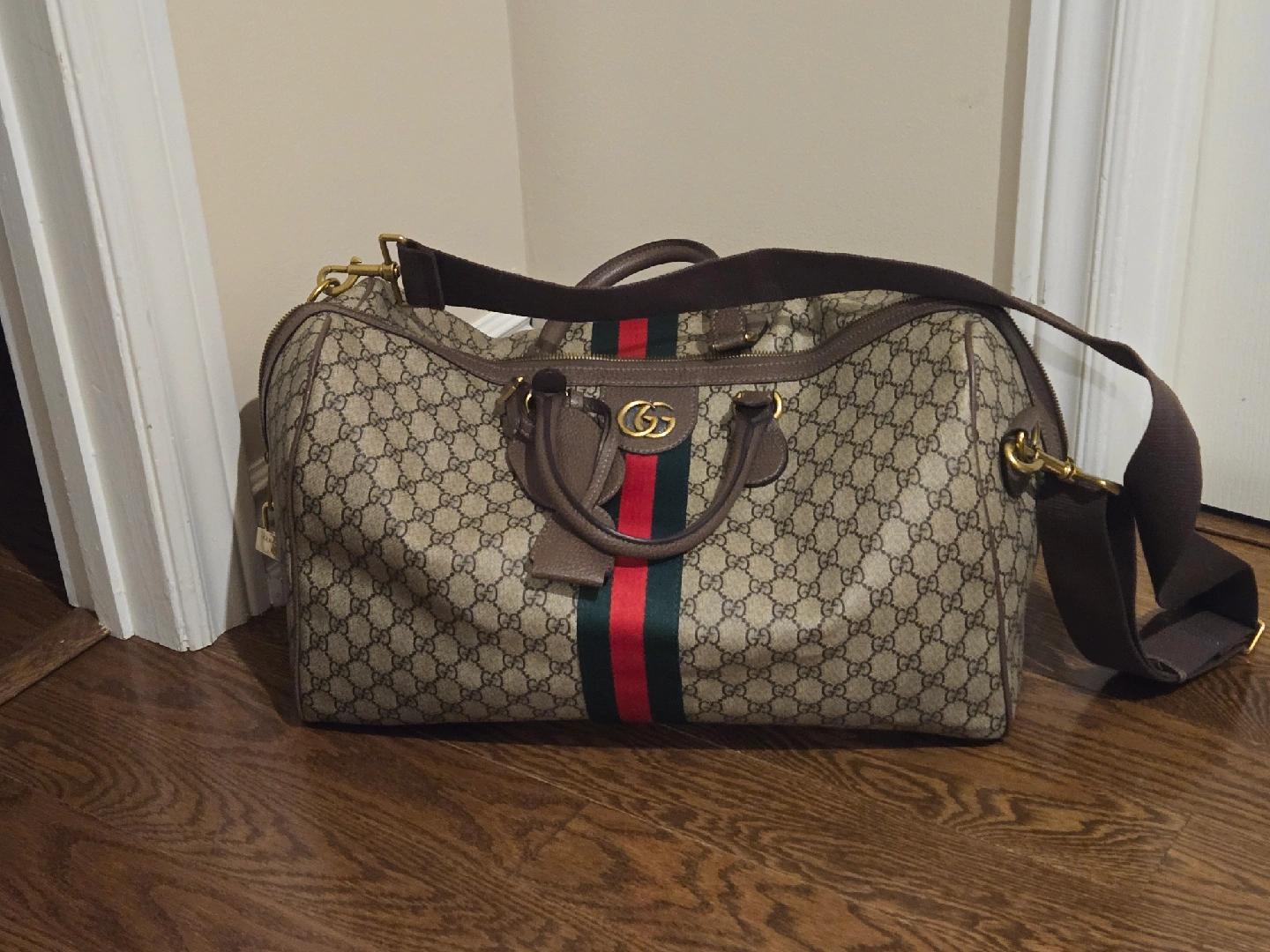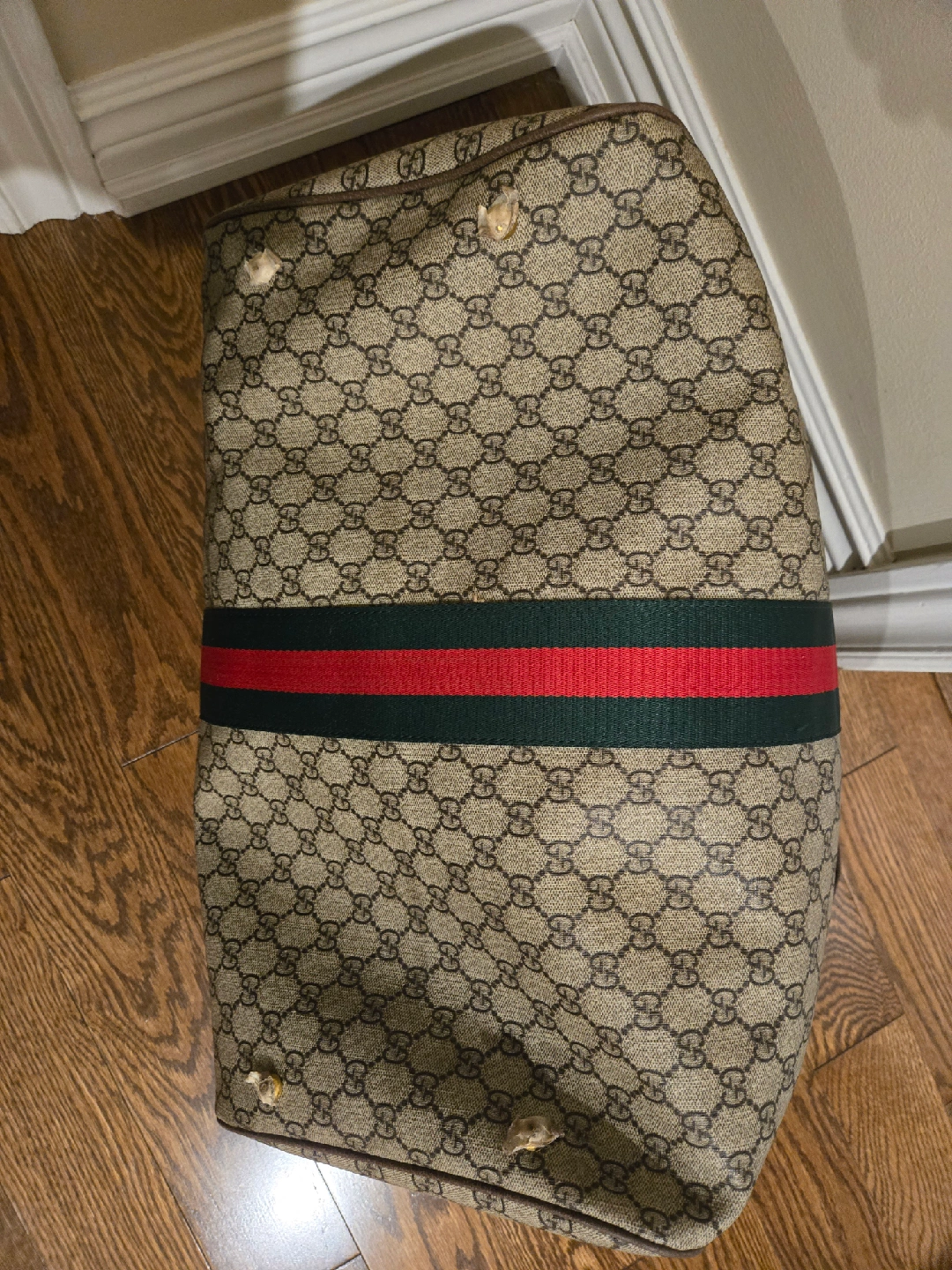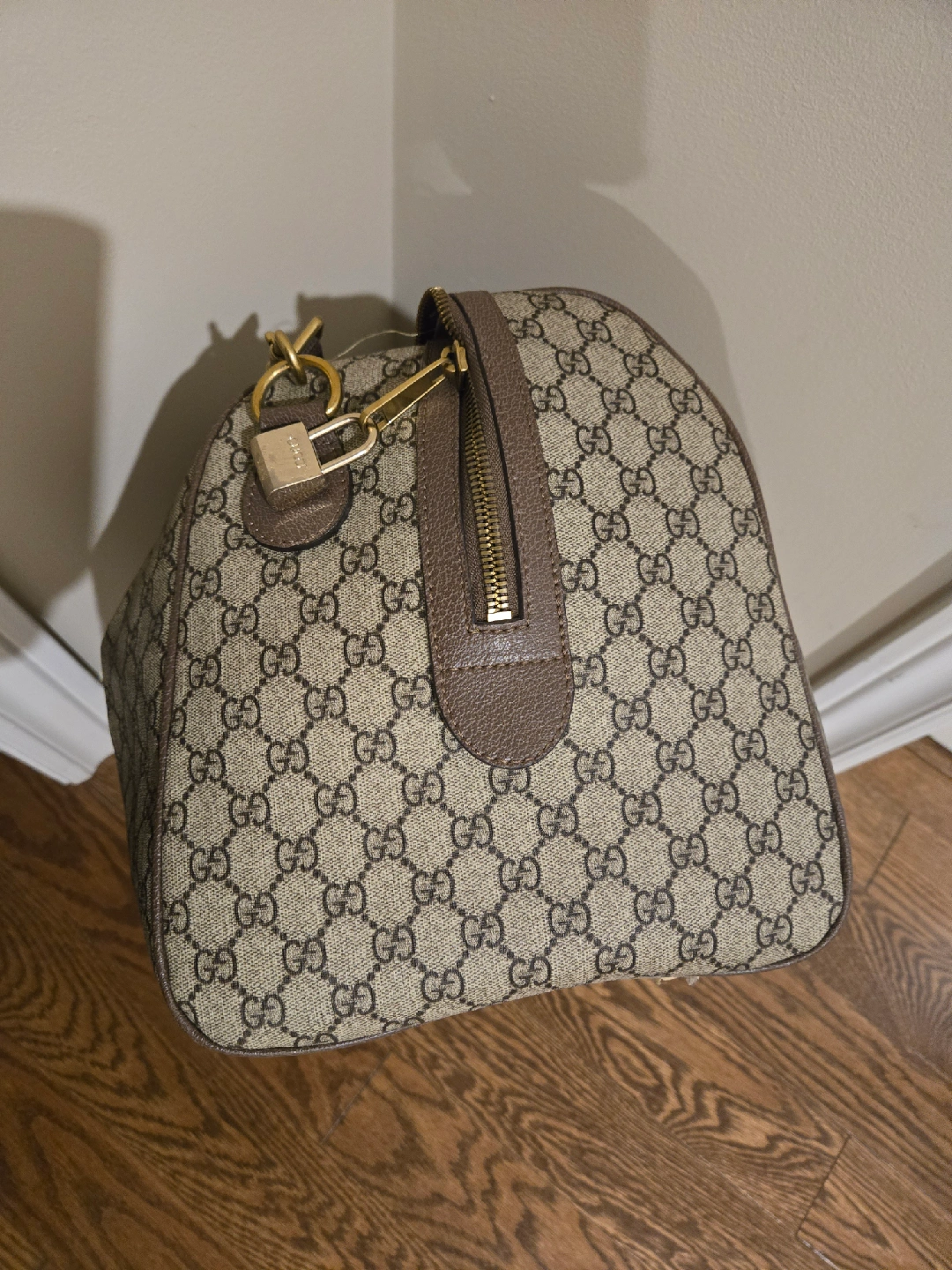 Selling a Gucci duffle bag. It's in good condition and has the classic Gucci monogram pattern. Perfect for travel or everyday use! I've got arthritis now and can't carry a duffel bag. Good news for you!