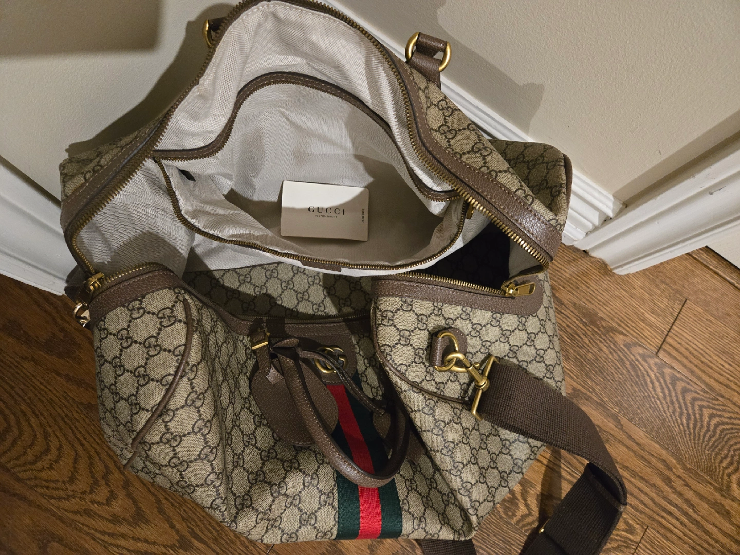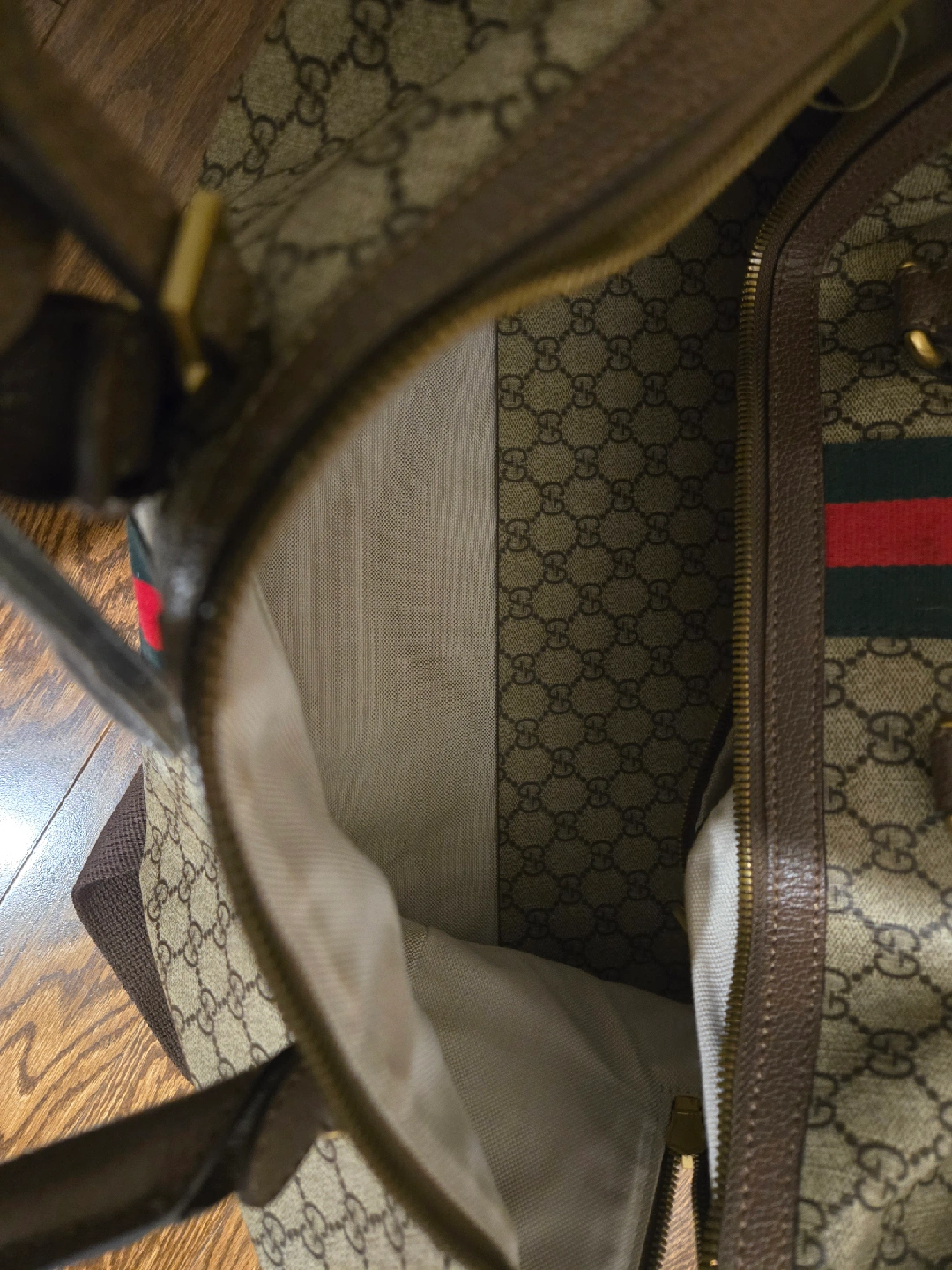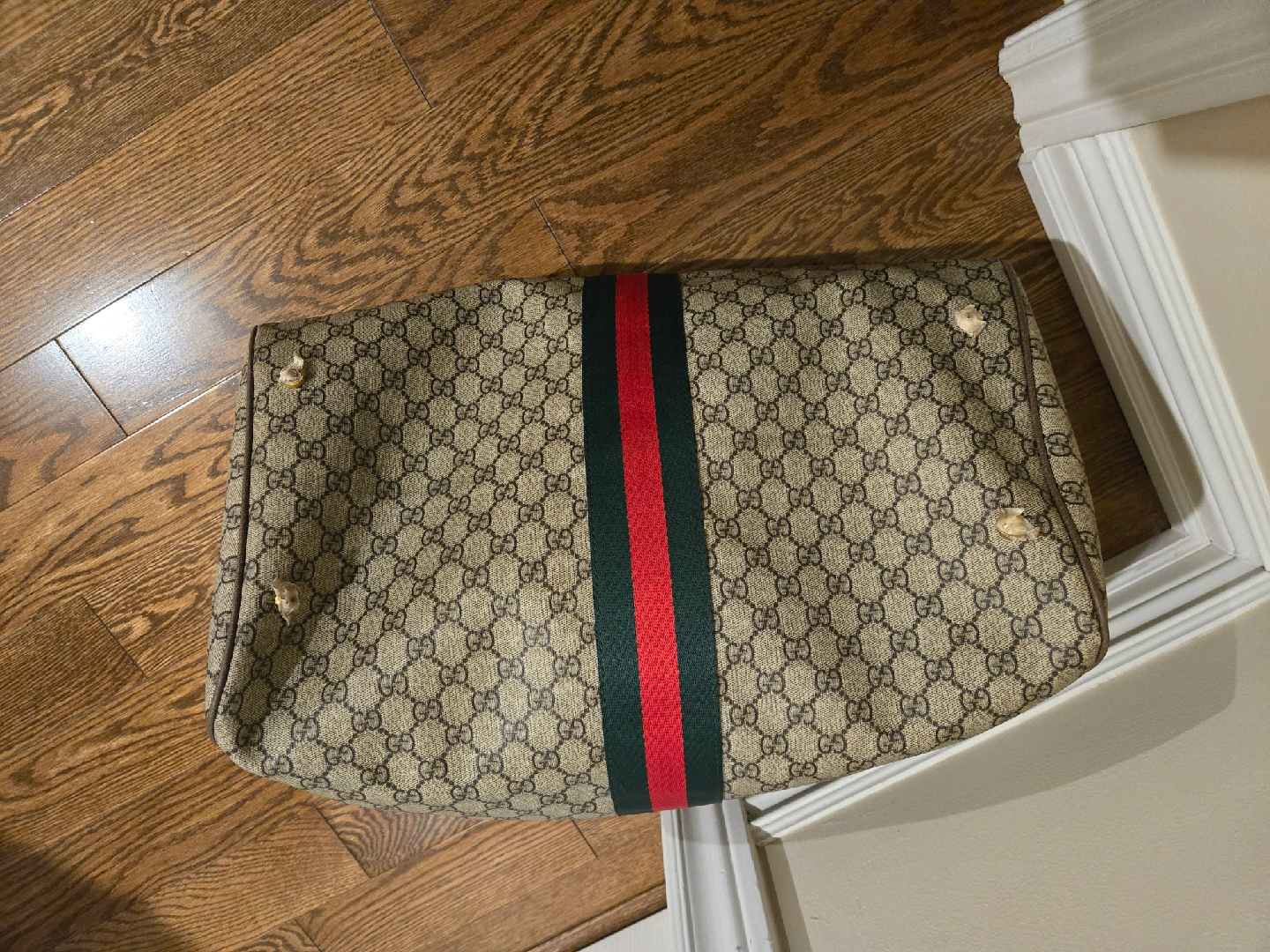 Selling a Gucci duffle bag. It's in good condition and has the classic Gucci monogram pattern. Perfect for travel or everyday use! I've got arthritis now and can't carry a duffel bag. Good news for you!