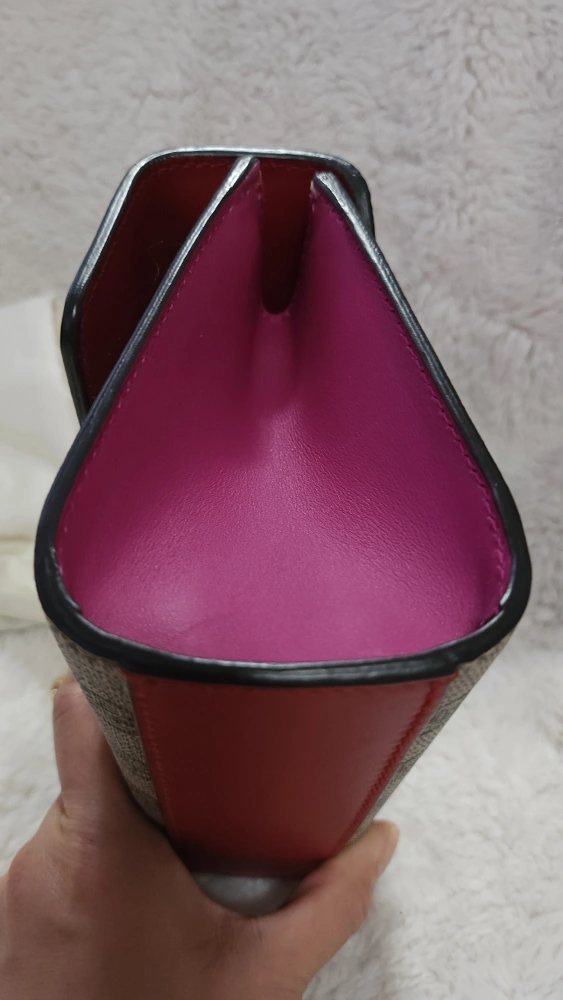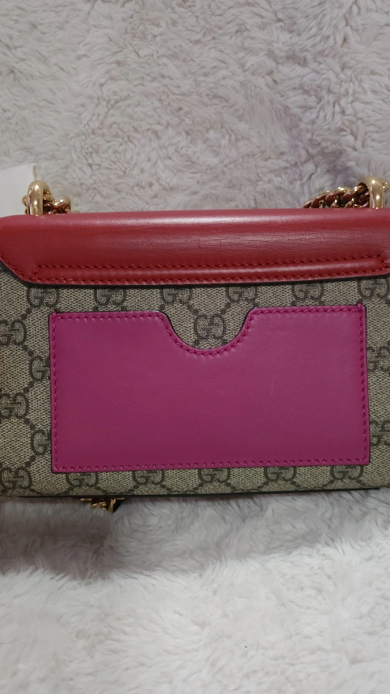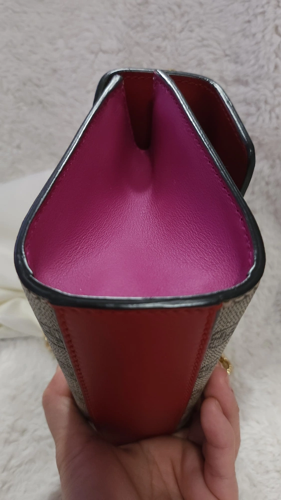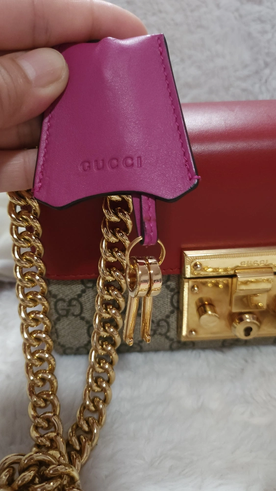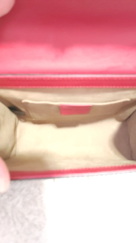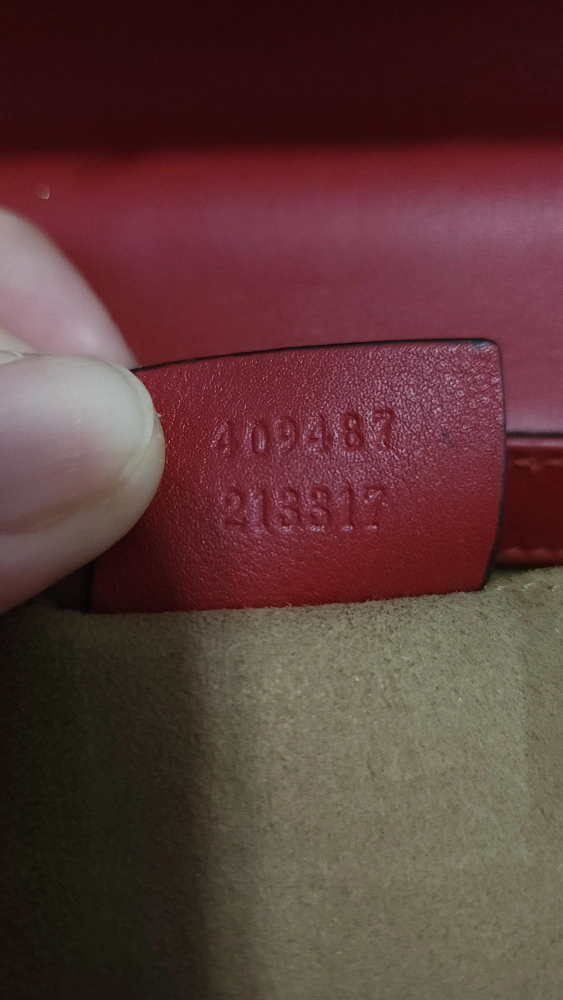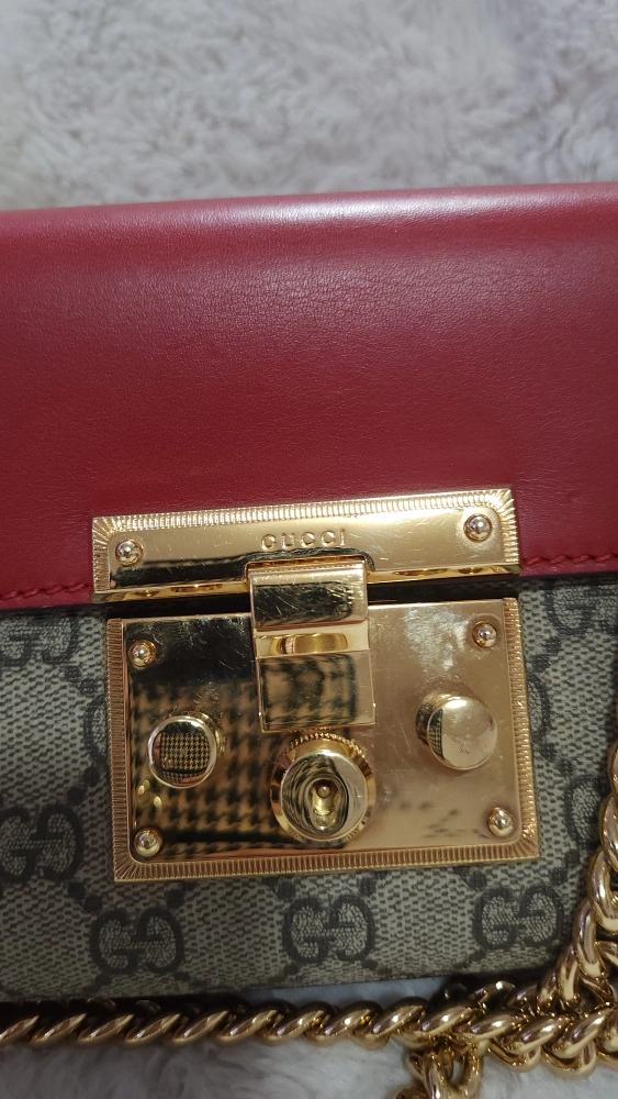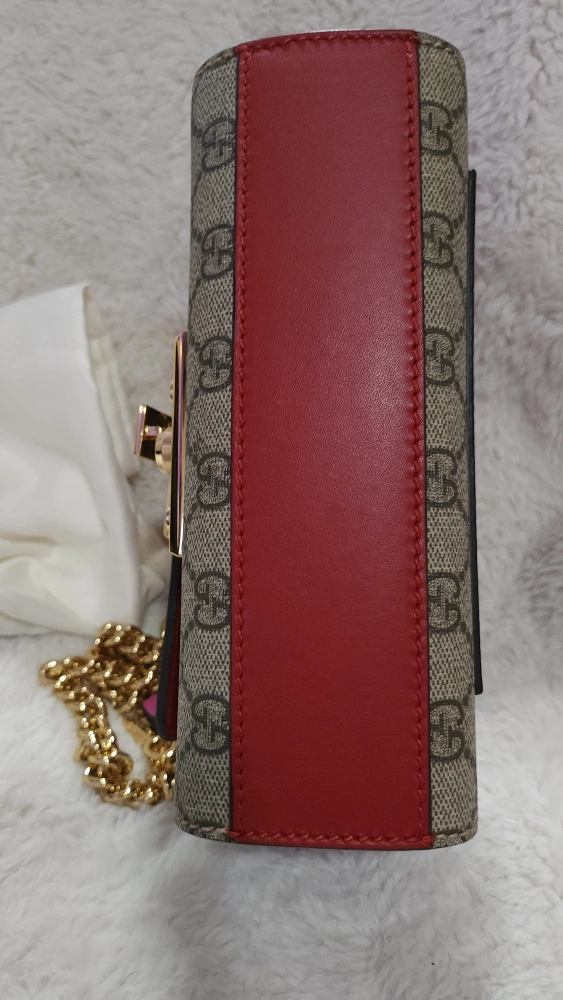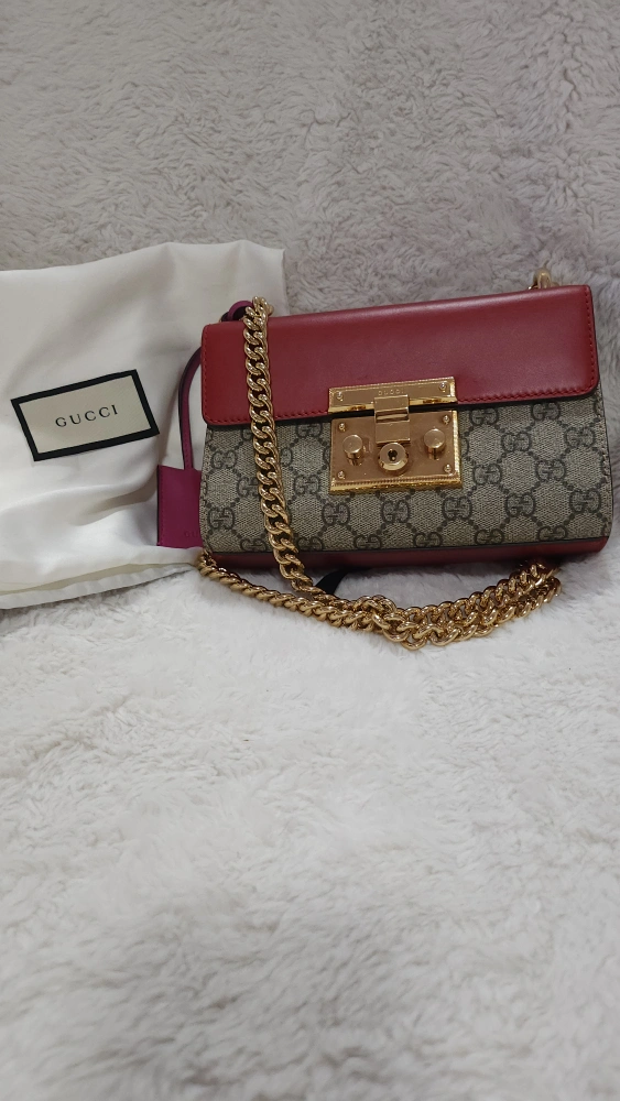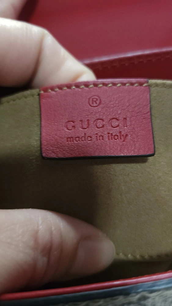 Authentic Gucci GG Marmont mini bag. Features a red leather flap, beige GG canvas, gold-toned hardware, and chain strap. Includes dust bag. Made in Italy.