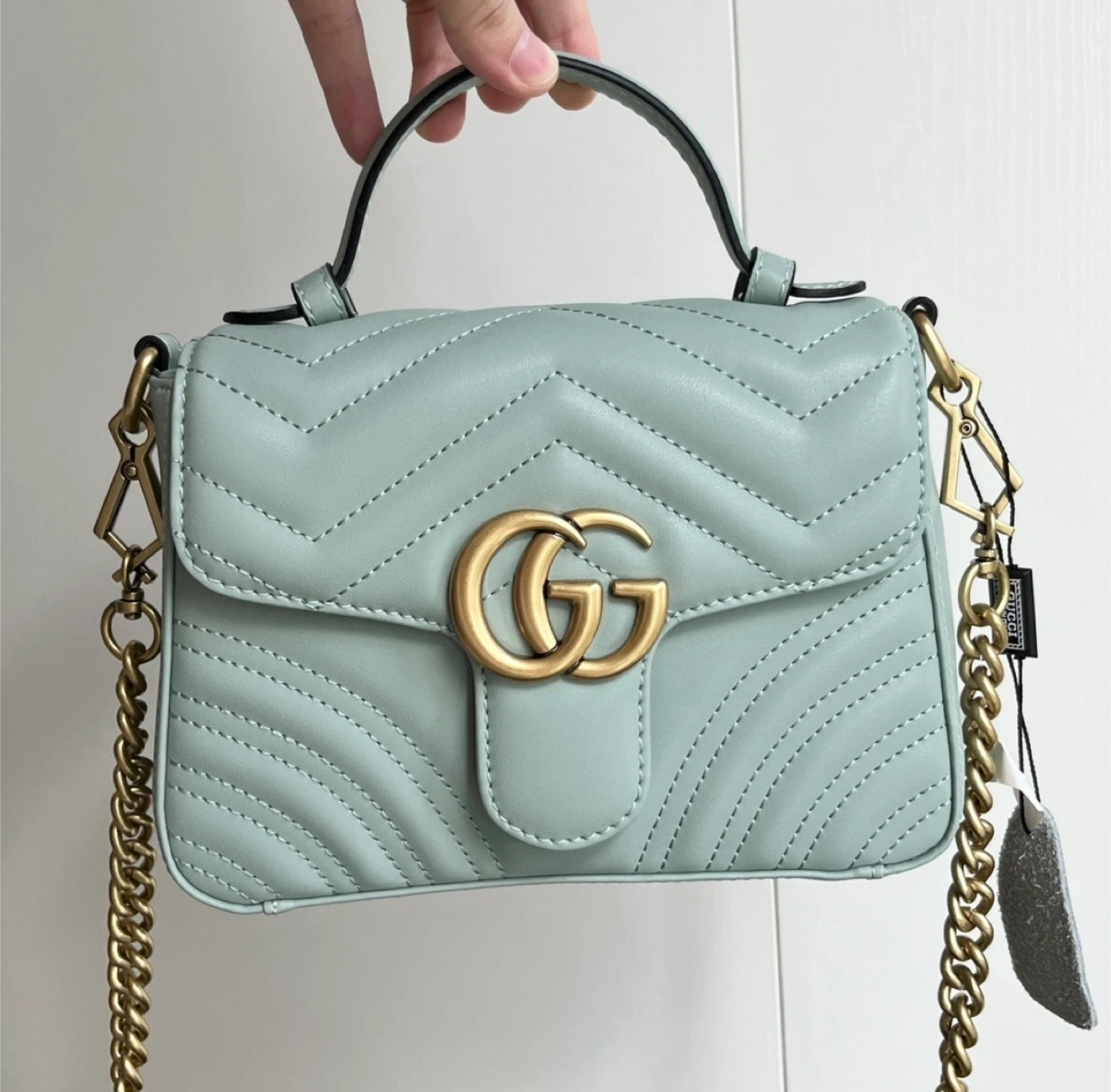 29Selling a beautiful Gucci GG Marmont mini top handle bag in a lovely light blue colour! This stylish bag features the iconic GG logo and a chic chain strap. Perfect for adding a touch of luxury to any outfit!