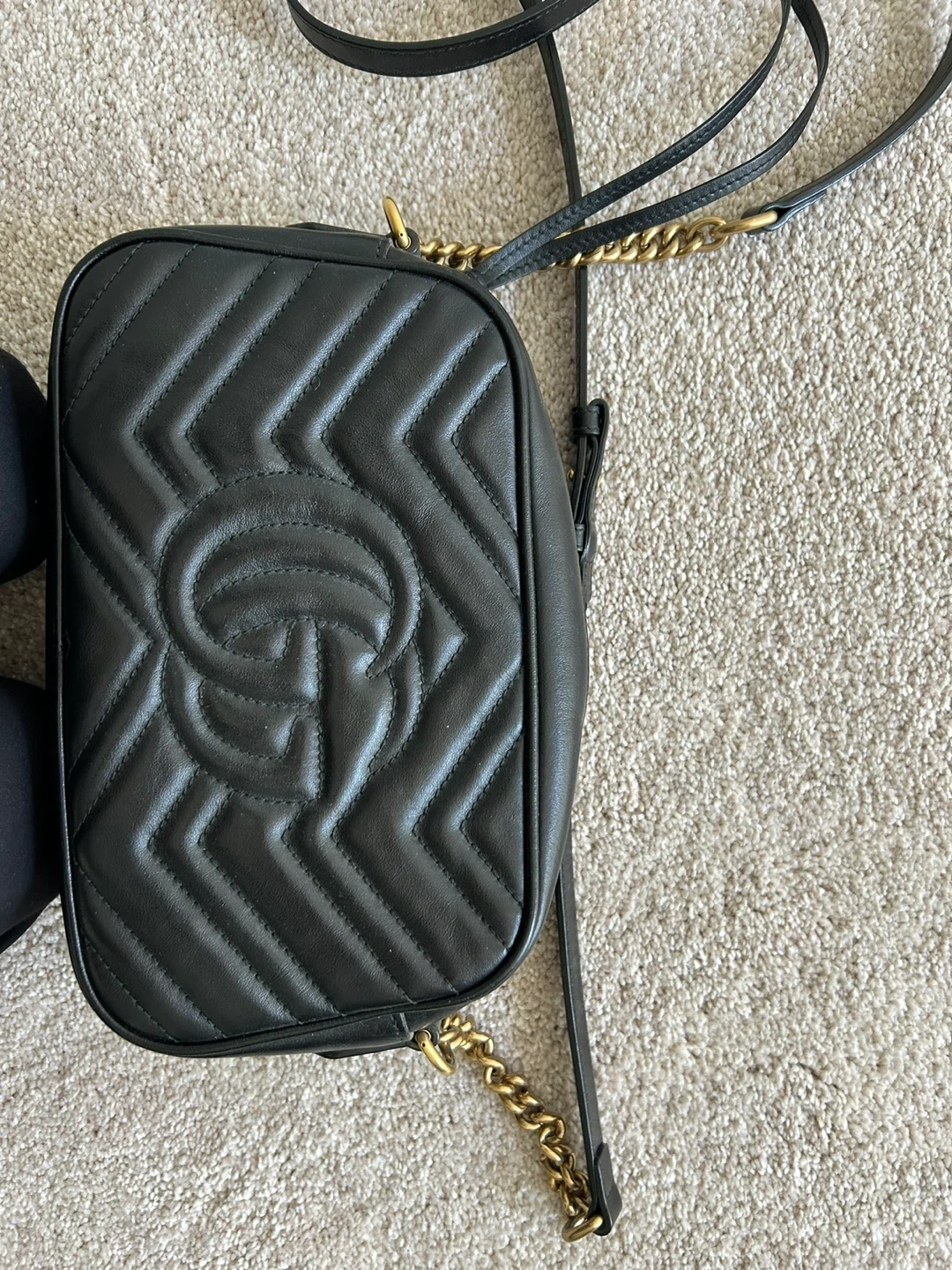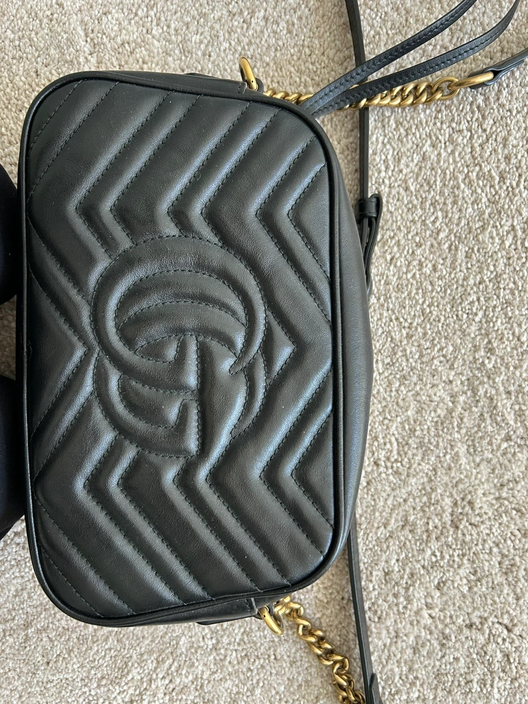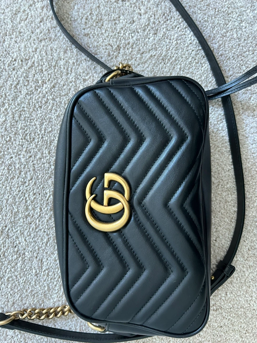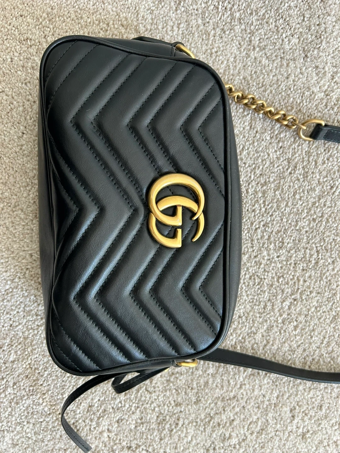 10Selling a gently used Gucci GG Marmont small shoulder bag. It's in great condition and features the iconic GG logo on black chevron-quilted leather with a gold-tone chain strap. Perfect for adding a touch of luxury to any outfit.