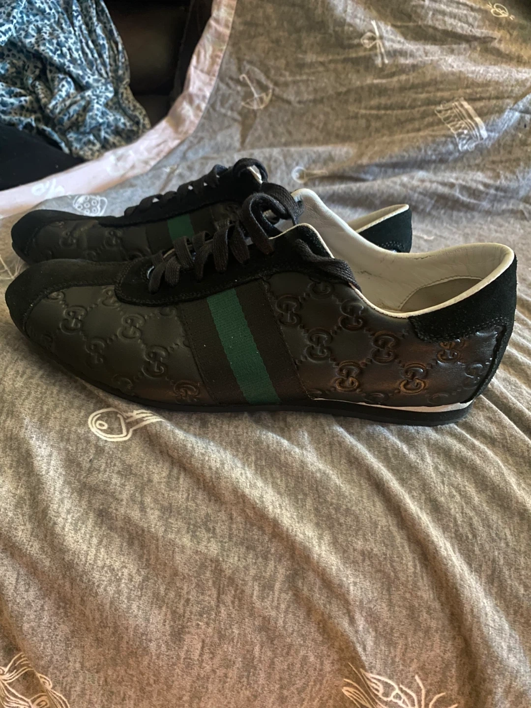 65Selling a pair of Real Gucci sneakers in size 42. Size 10 men. These sneakers are black leather with a green stripe and Gucci logo pattern. They are in good condition.