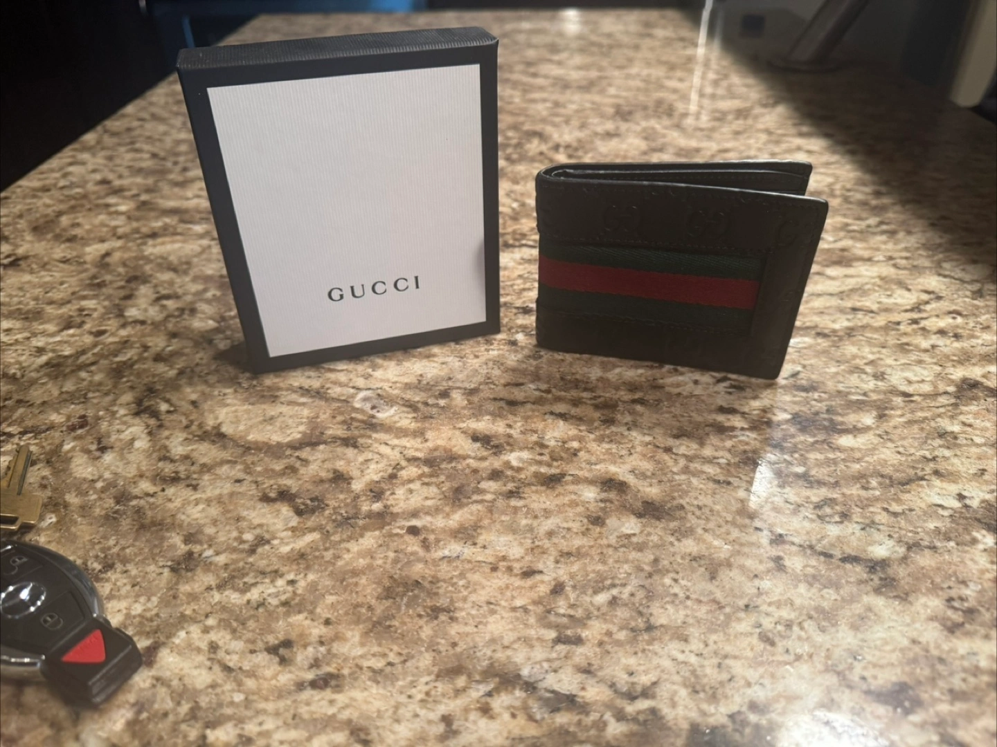 Selling a stylish Gucci men's wallet in black leather. It features the iconic Gucci pattern and the signature green and red stripe. The wallet comes with its original box, perfect for gifting or keeping it protected. It's in new pristine condition and ready for a new home!