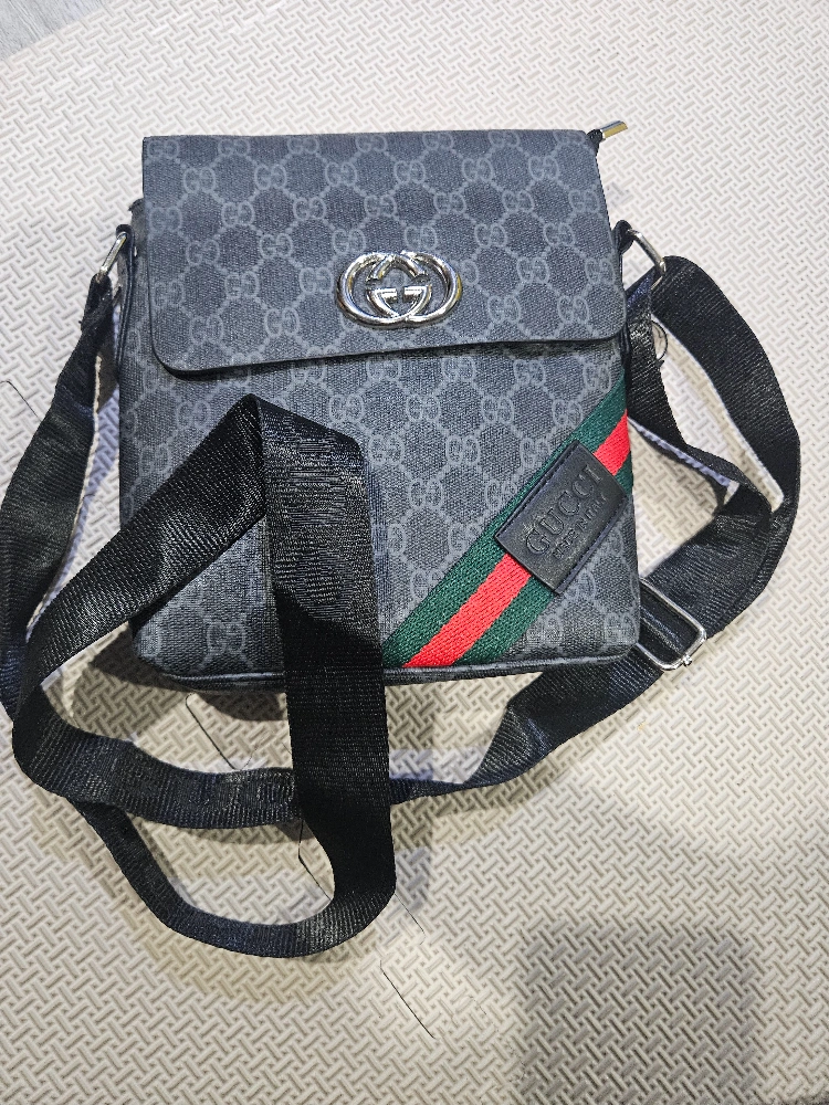 55Stylish Gucci messenger bag with the iconic GG pattern. It features a black strap and the classic green and red stripe detail. Perfect for everyday use and carrying your essentials in style