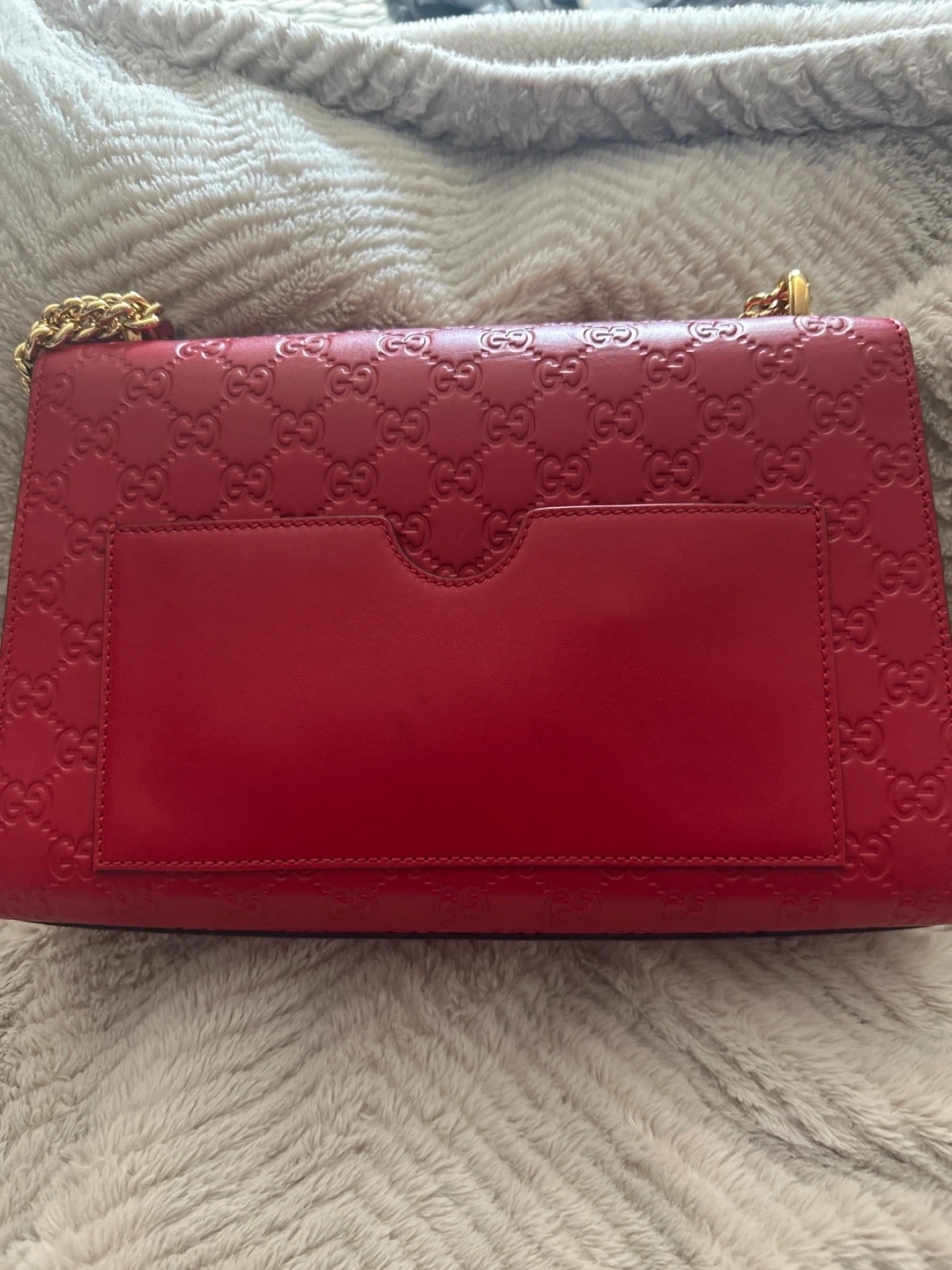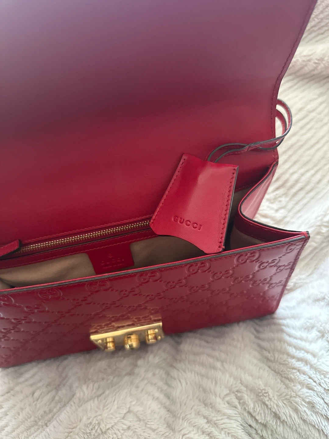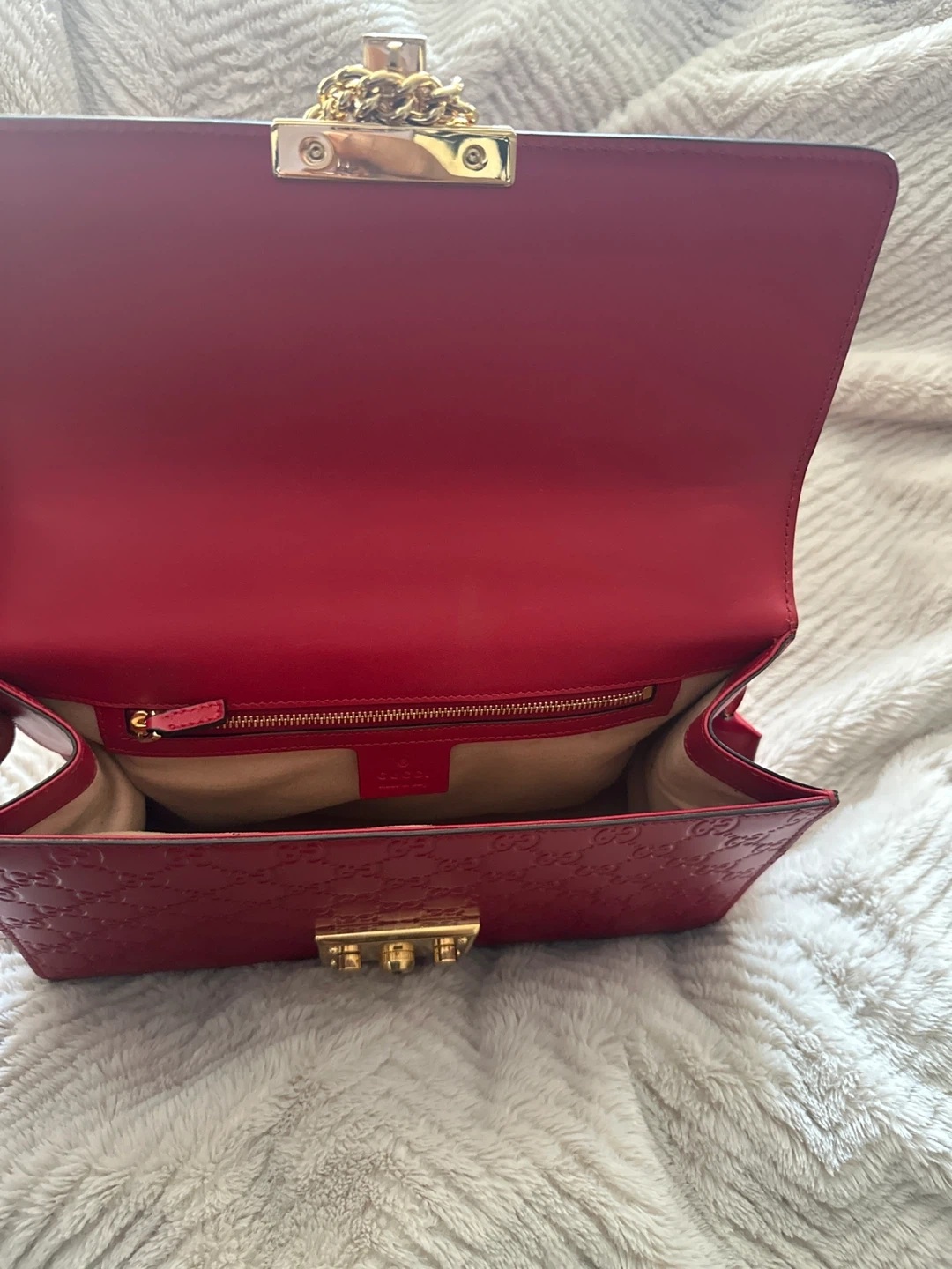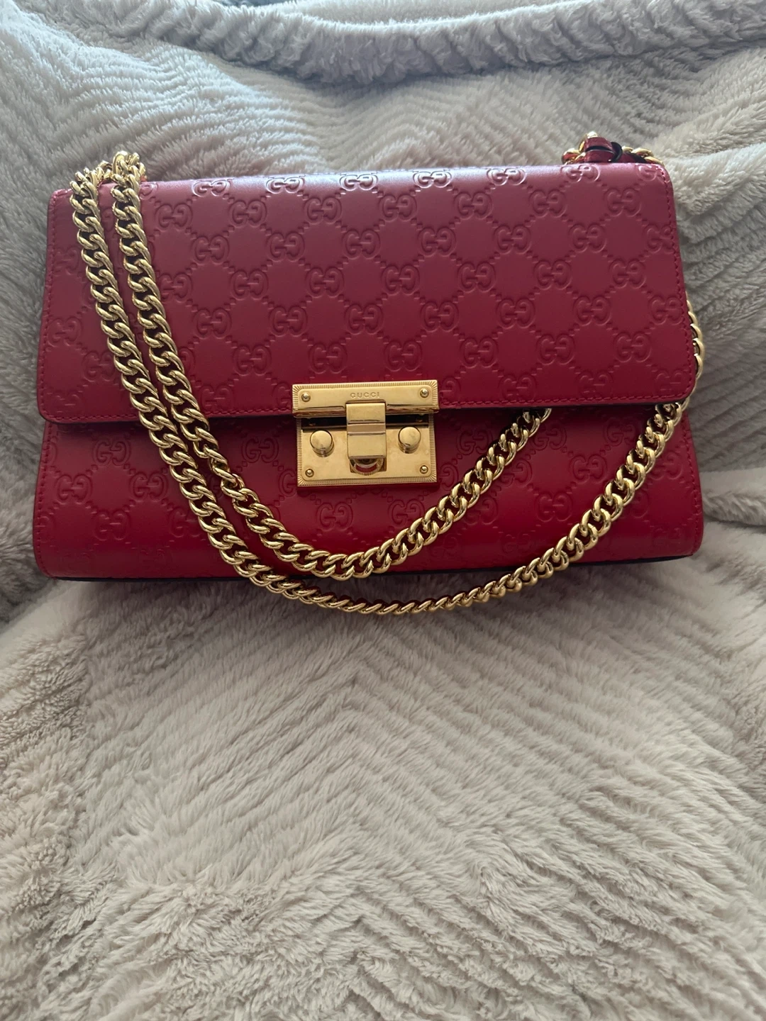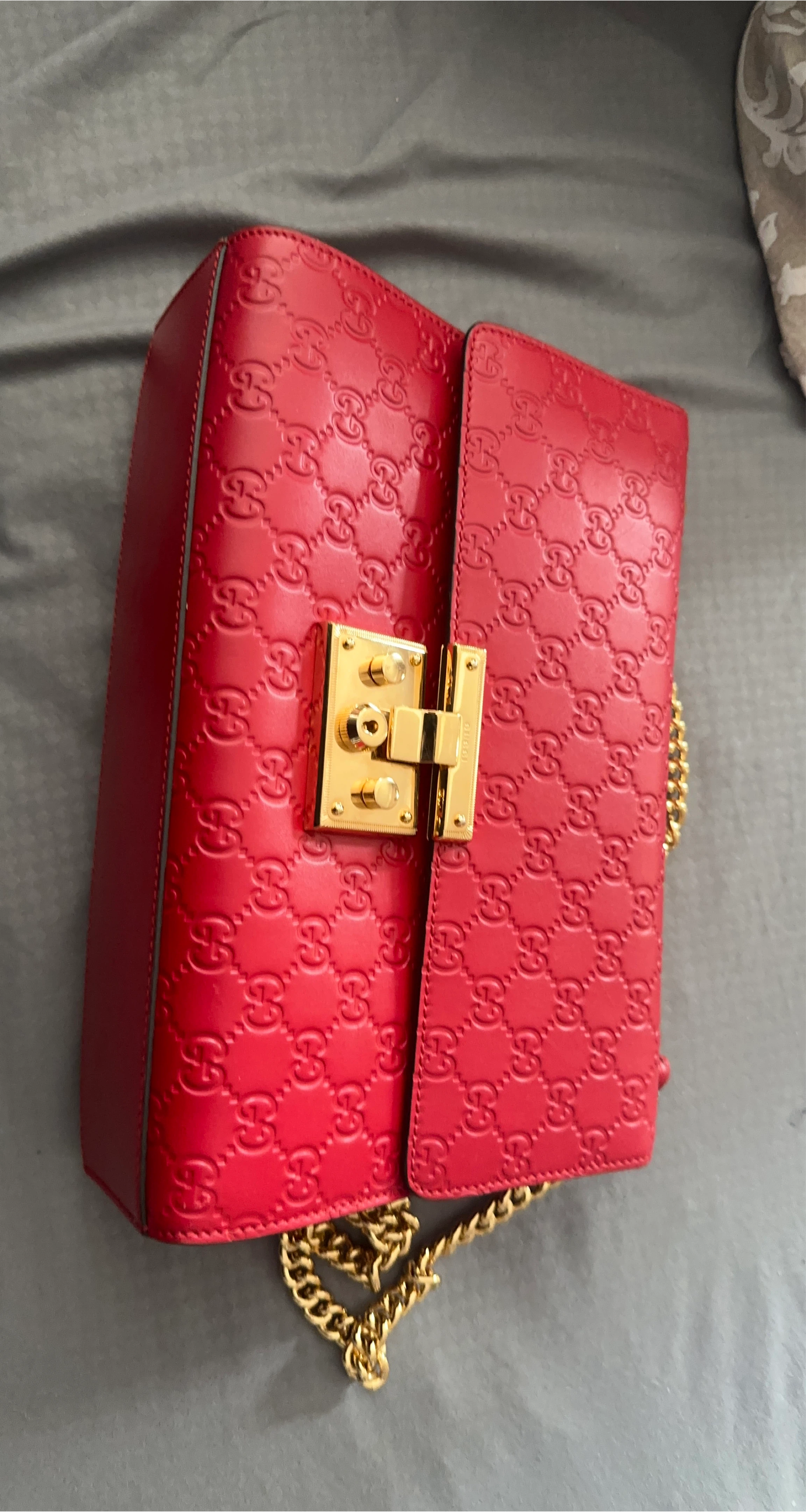 60Selling a beautiful Gucci shoulder bag in red embossed leather. It features a gold chain strap and a unique lock closure. It's in great condition and ready for a new home!