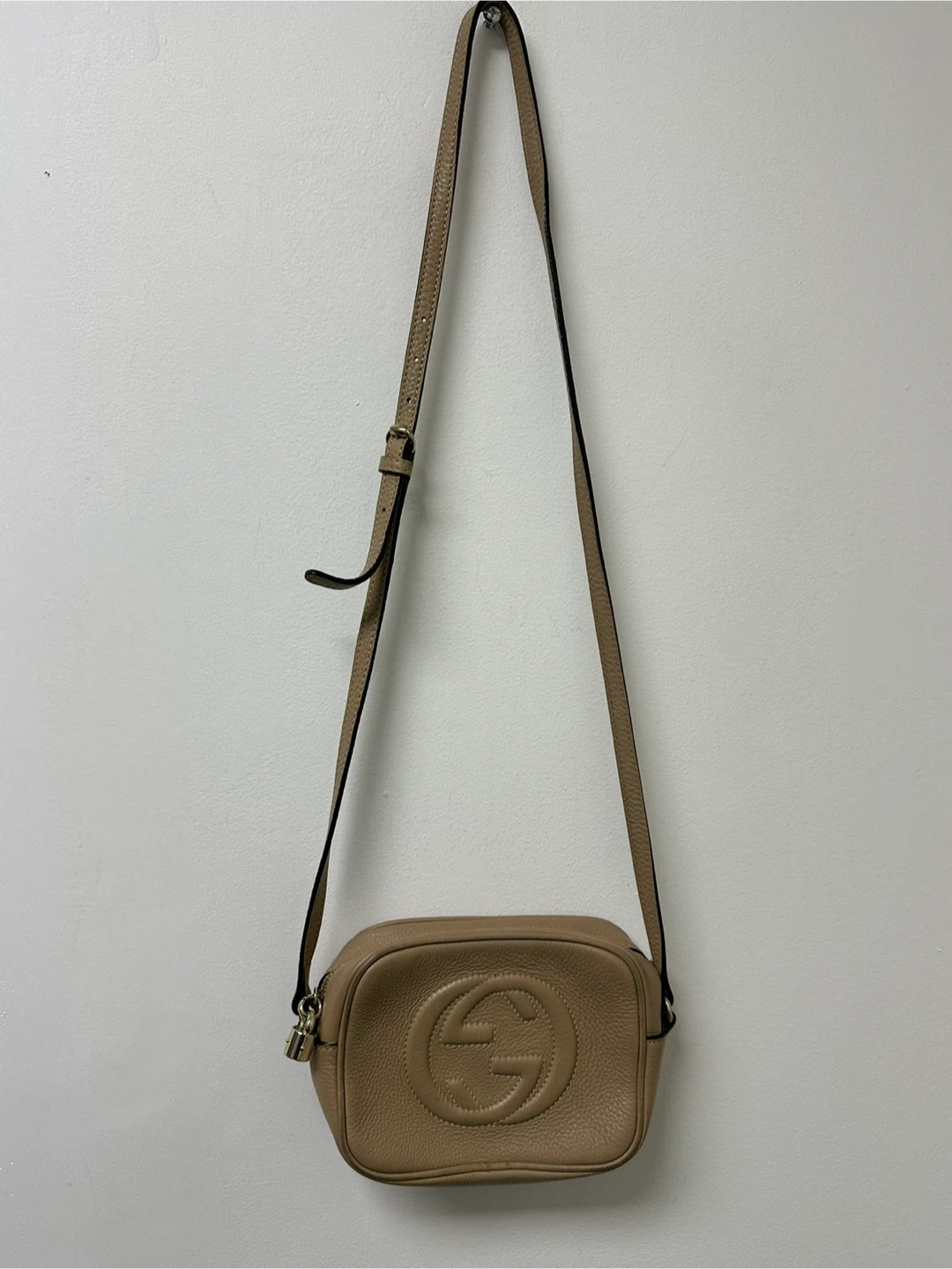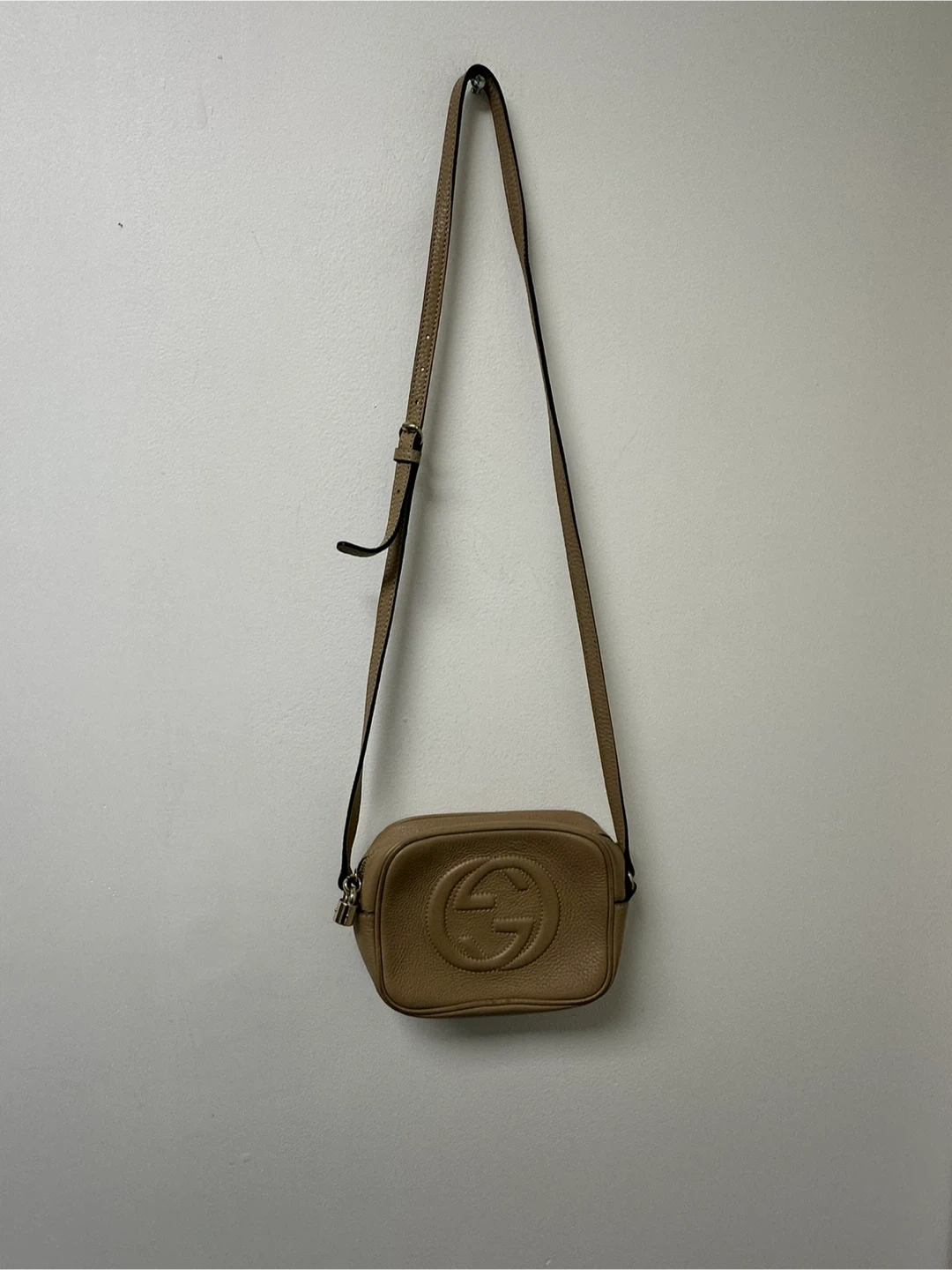 199Selling a Gucci Soho Disco Bag in beige. It's a stylish and compact crossbody bag, perfect for everyday use. The bag features the iconic embossed interlocking GG logo and a leather tassel detail. It's in good condition and ready for a new home!