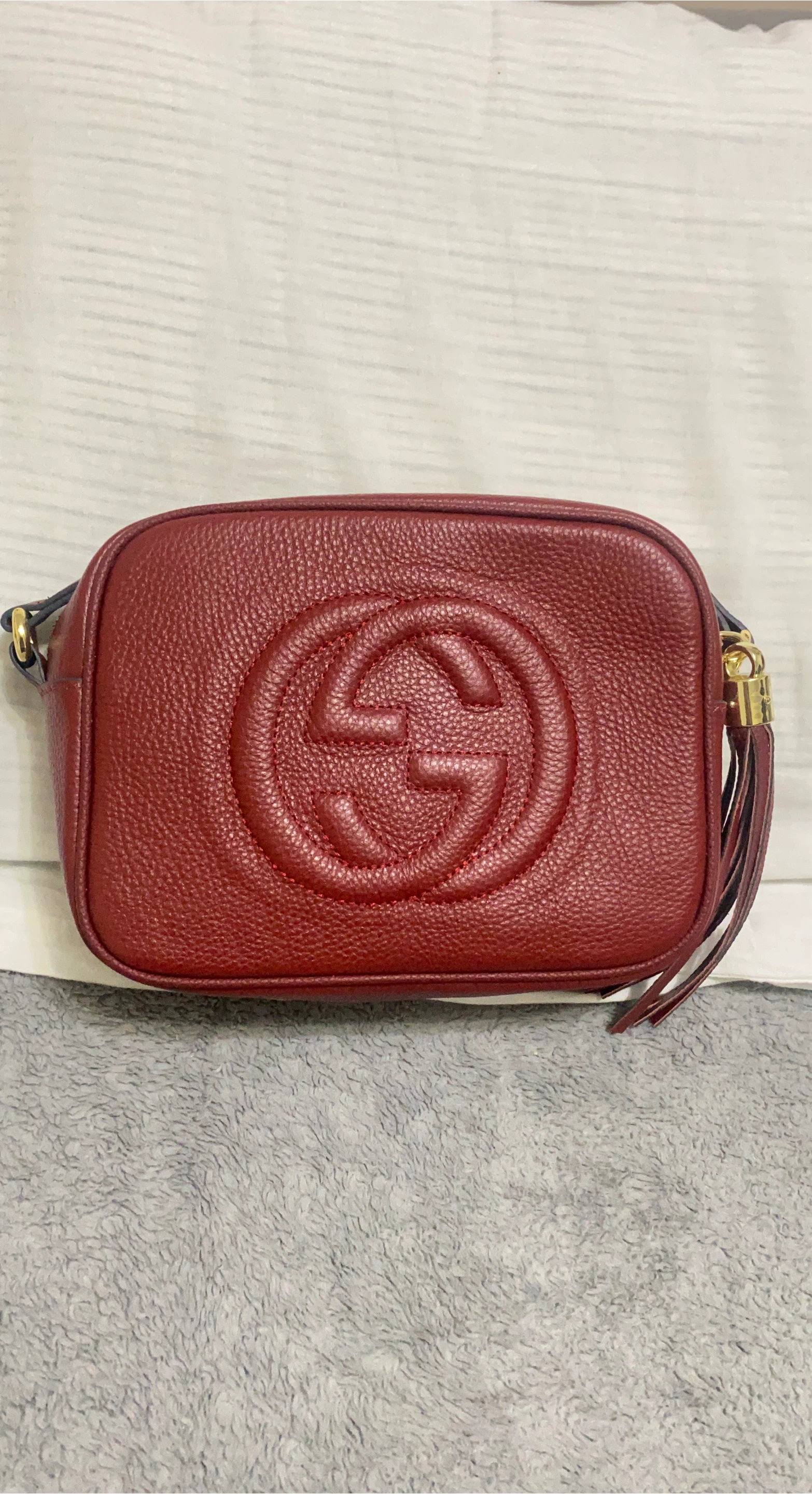 19Selling a Gucci Soho Disco Bag in red leather. It's in great condition and features the iconic GG logo embossed on the front. Perfect for everyday use!