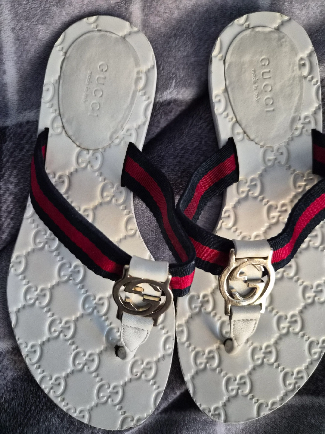100Selling a pair of Gucci thong sandals. They are white rubber with the classic Gucci pattern embossed all over. The straps are black and red. Perfect for the summer