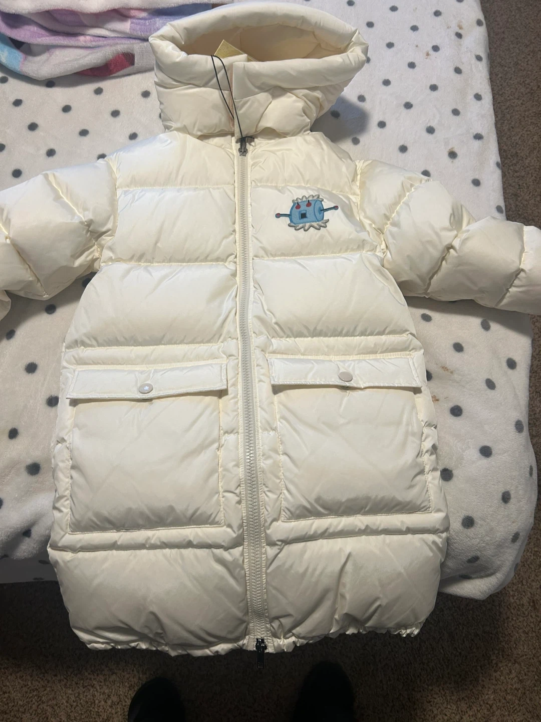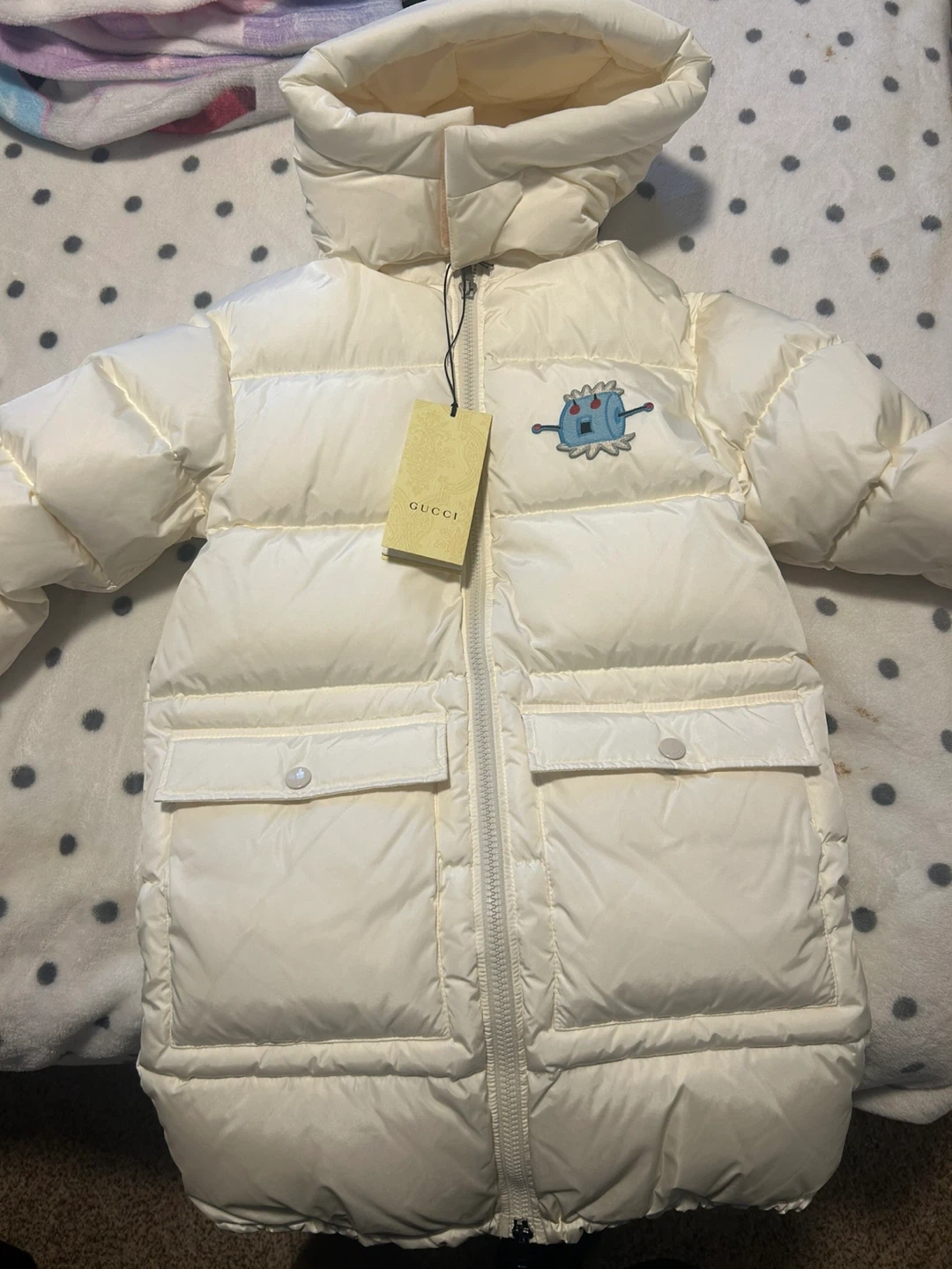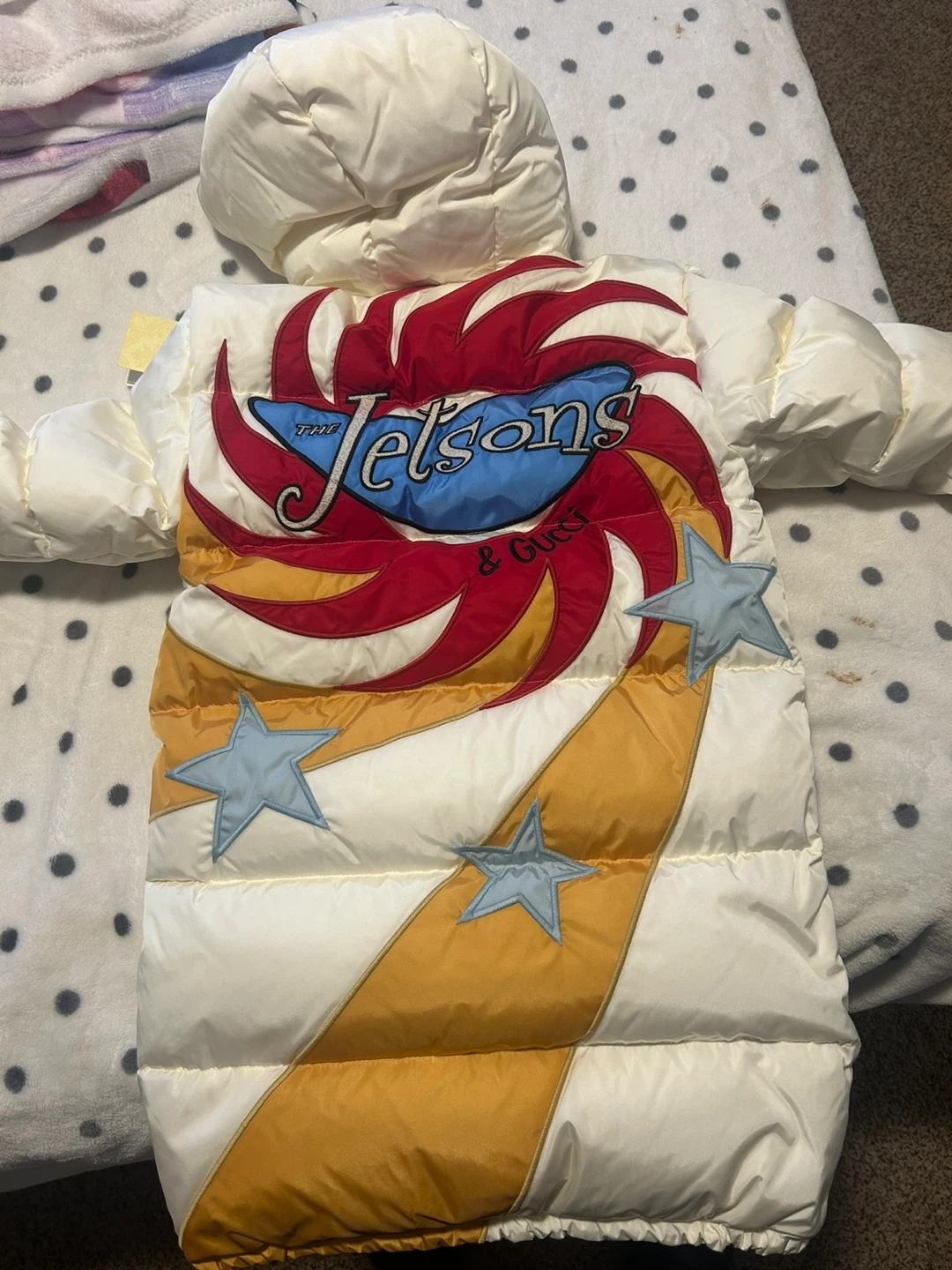 Selling a Gucci x The Jetsons padded down jacket. It's in great condition and features a fun design on the back. Perfect for keeping warm and stylish during the colder months! Kids size 8