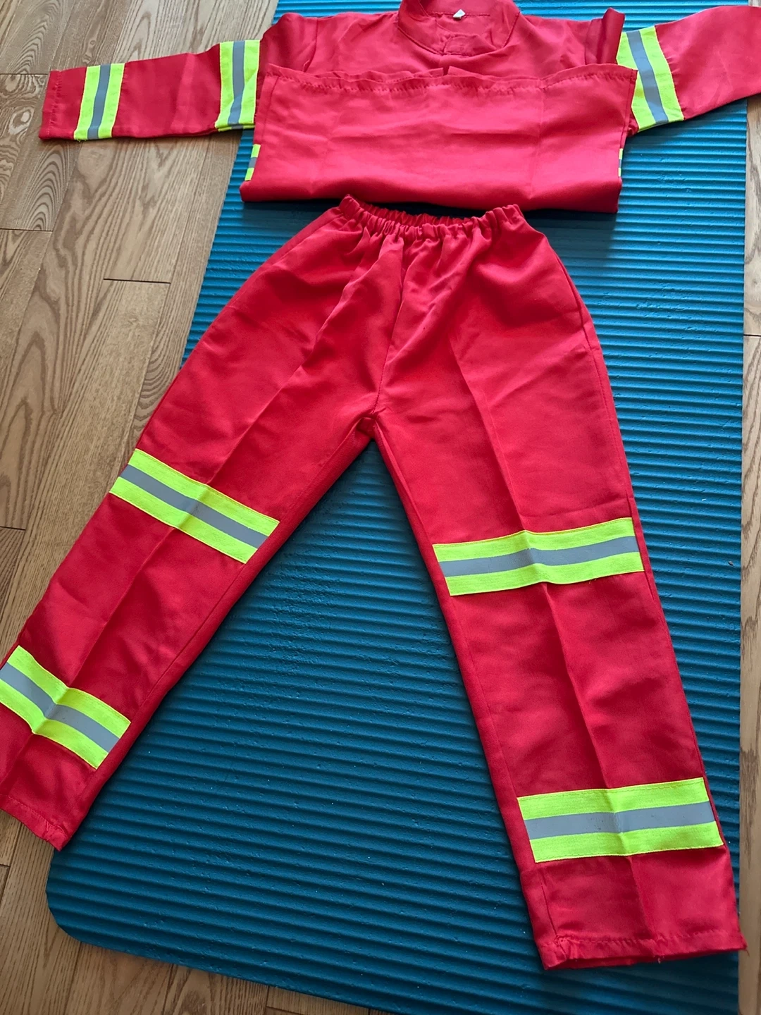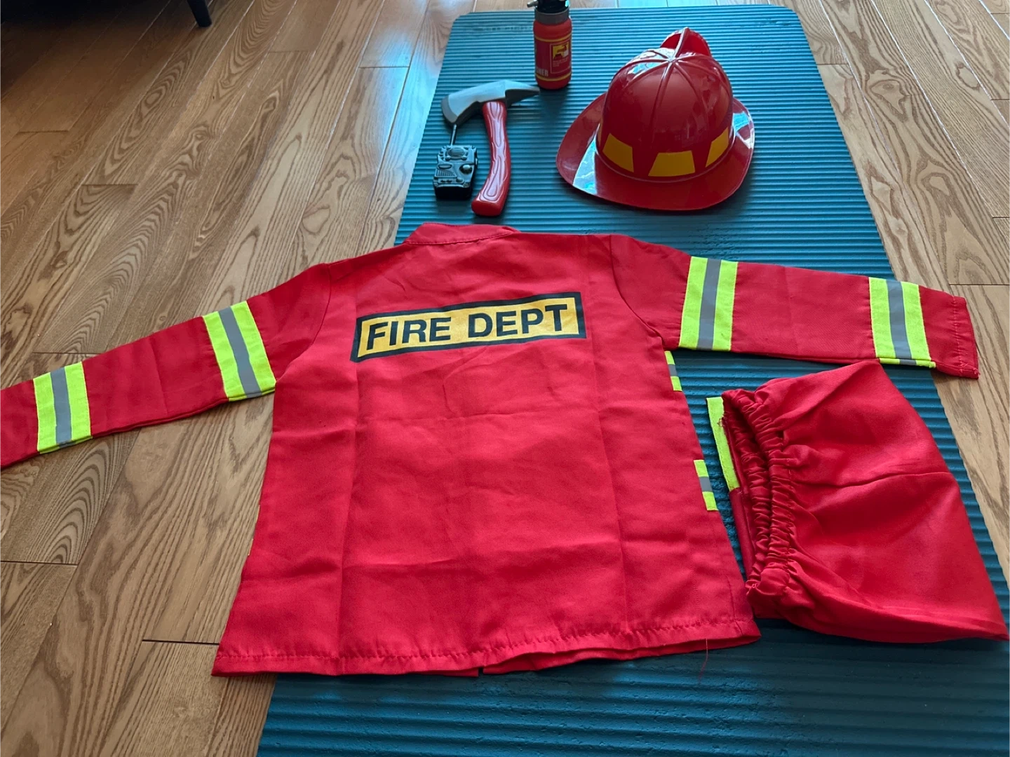 Get your little one ready for imaginative play with this firefighter costume set! It includes a jacket, pants, helmet, toy axe, extinguisher, and walkie-talkie. Perfect for dress-up and pretend play or Halloween π!!! Washed and ready to use. From a pet-less, non-smoking and clean home.