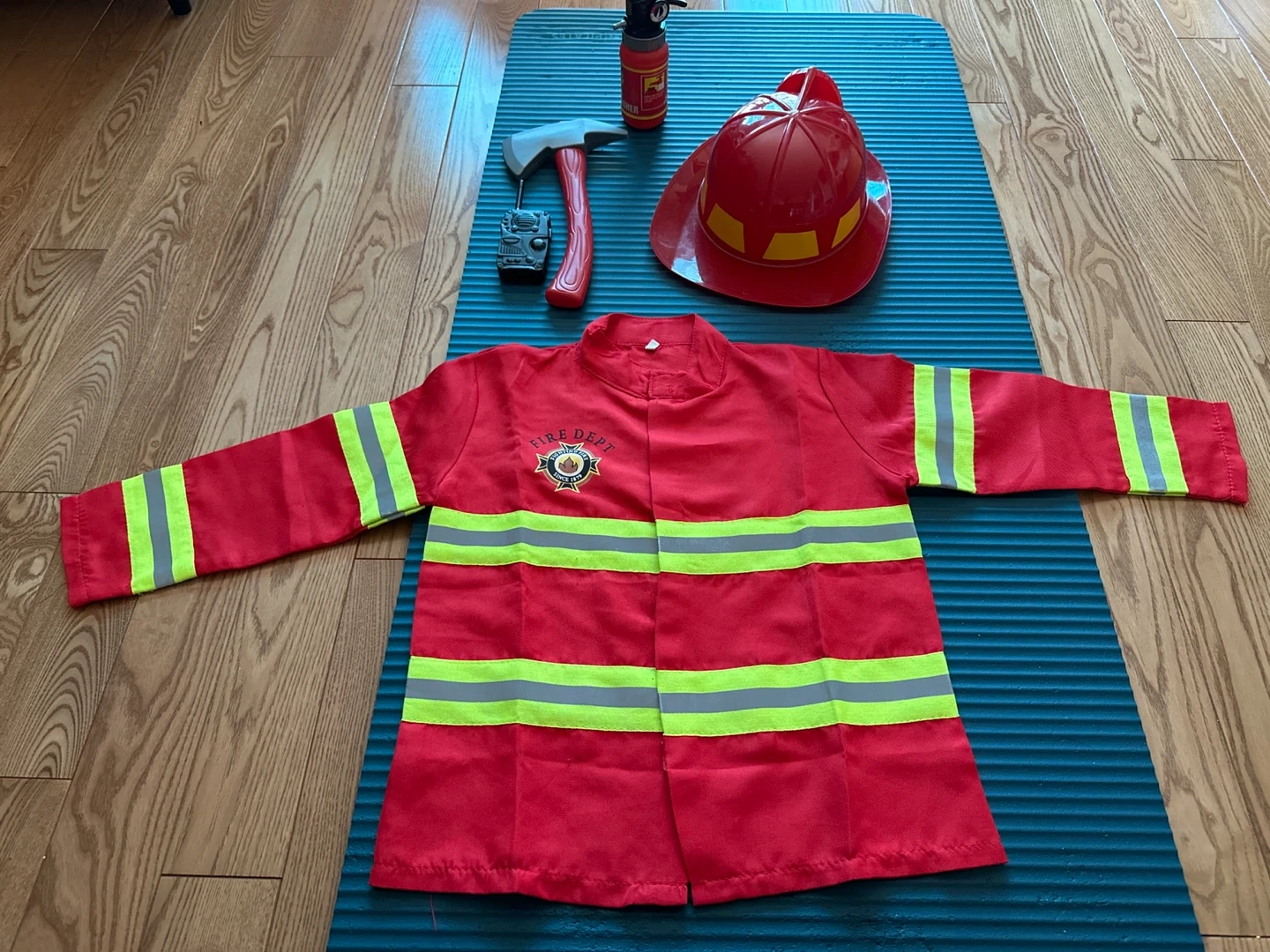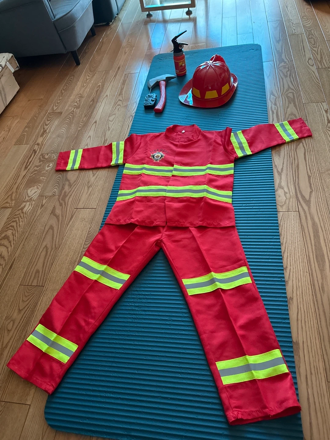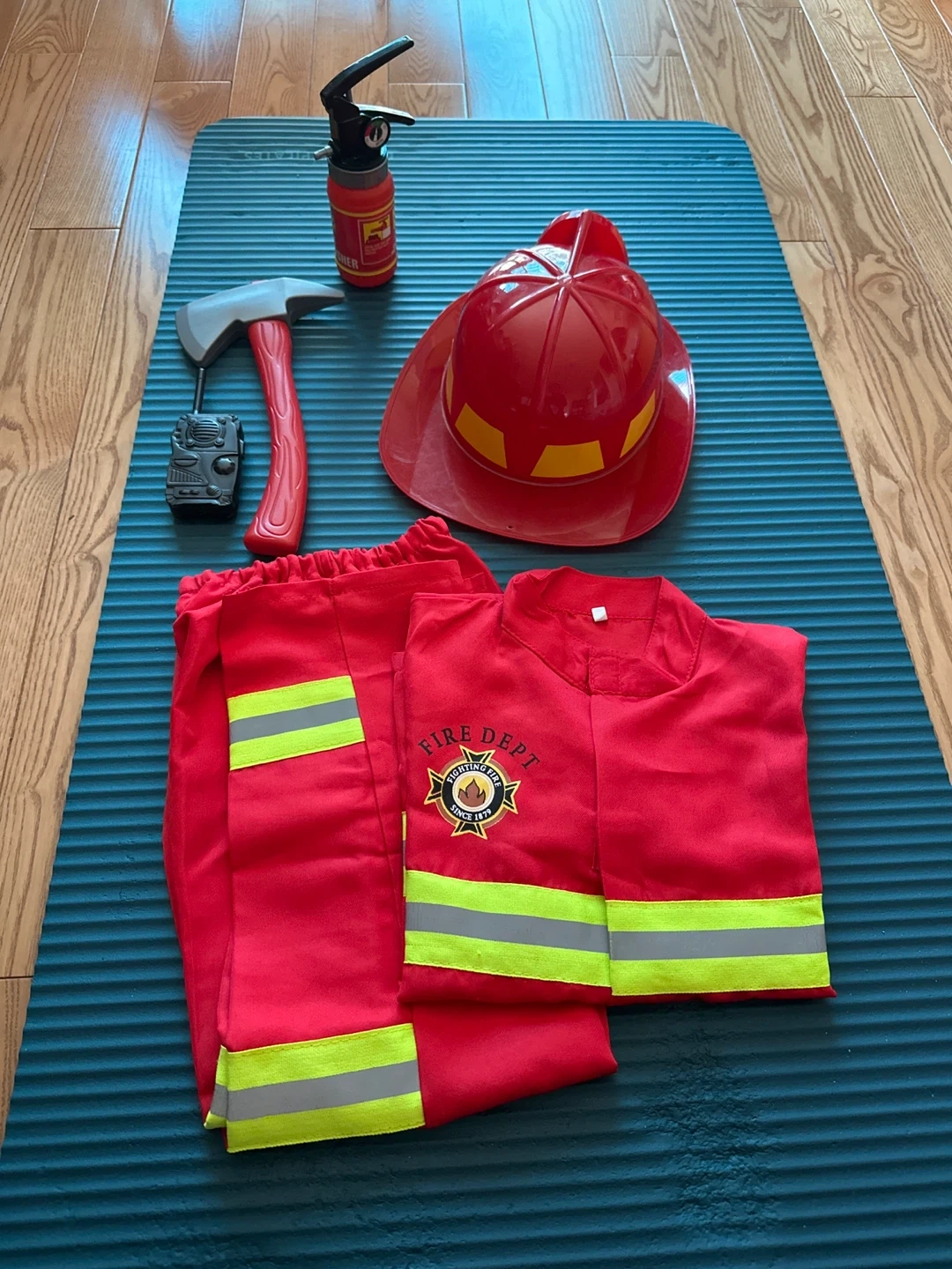 Get your little one ready for imaginative play with this firefighter costume set! It includes a jacket, pants, helmet, toy axe, extinguisher, and walkie-talkie. Perfect for dress-up and pretend play or Halloween π!!! Washed and ready to use. From a pet-less, non-smoking and clean home.
