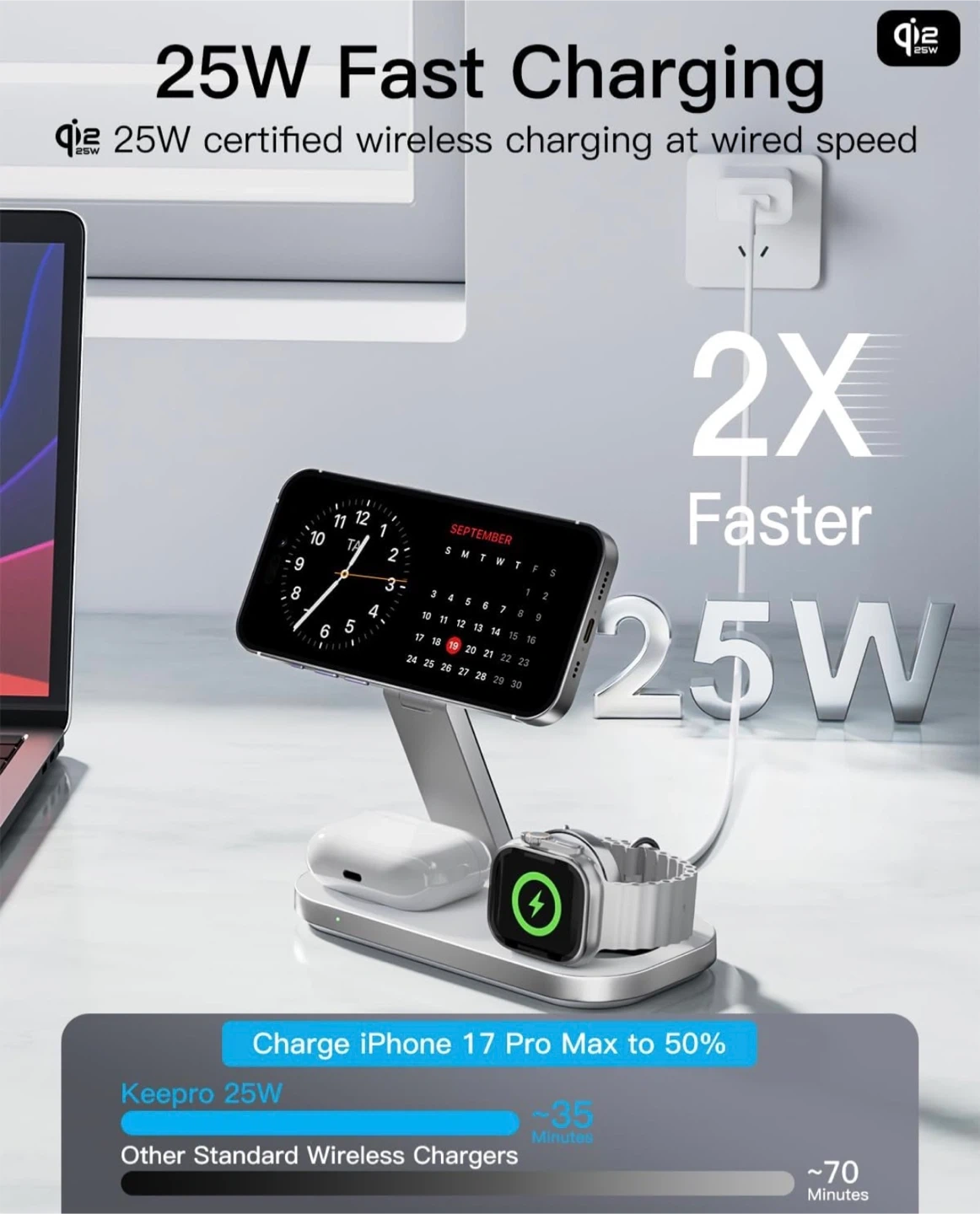 This is a Keepro 3-in-1 wireless charging station. It's designed for Apple devices and offers 25W fast charging. Dimensions are 5.9in x 2.9in x 1.2in when folded.