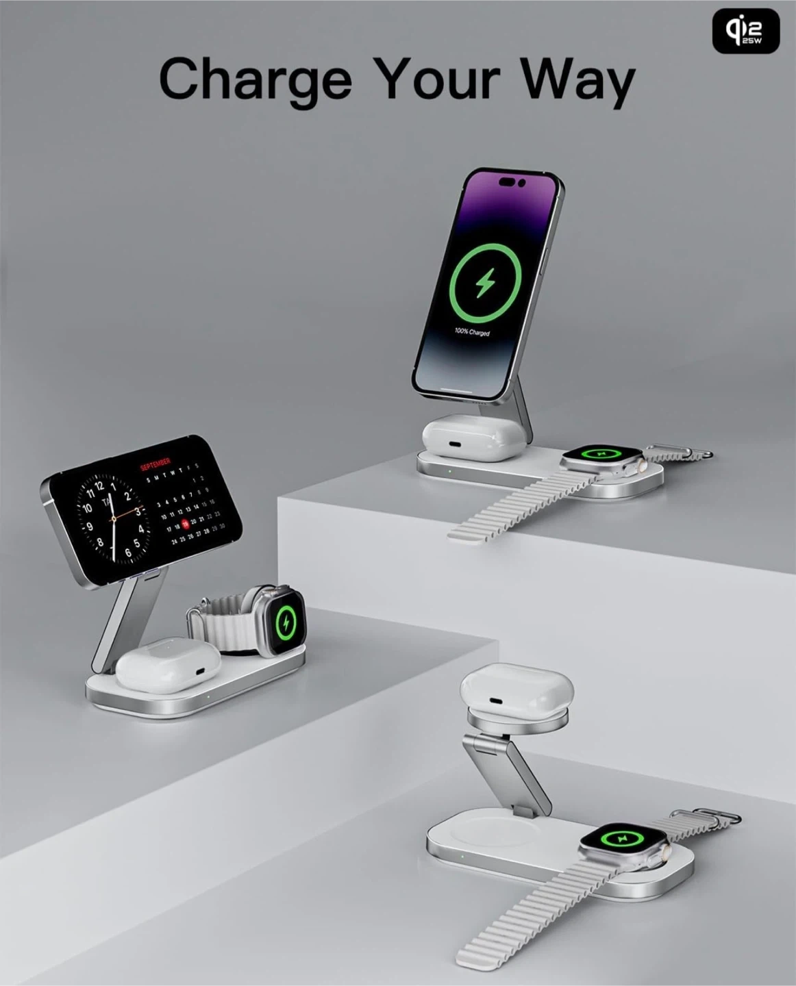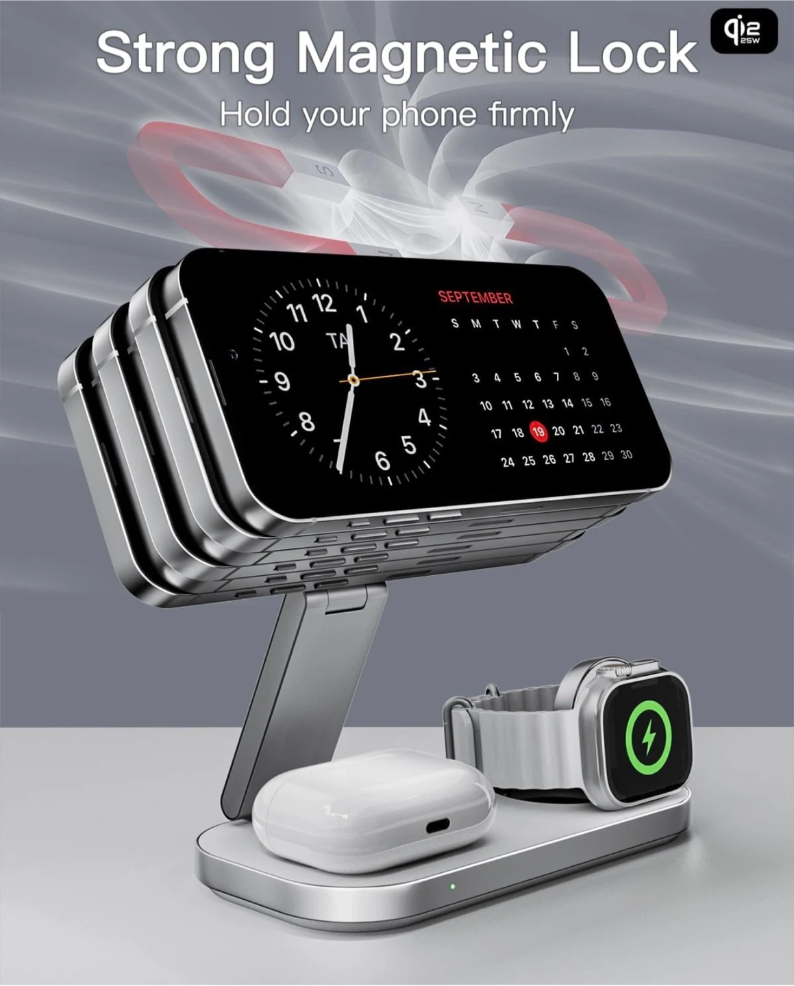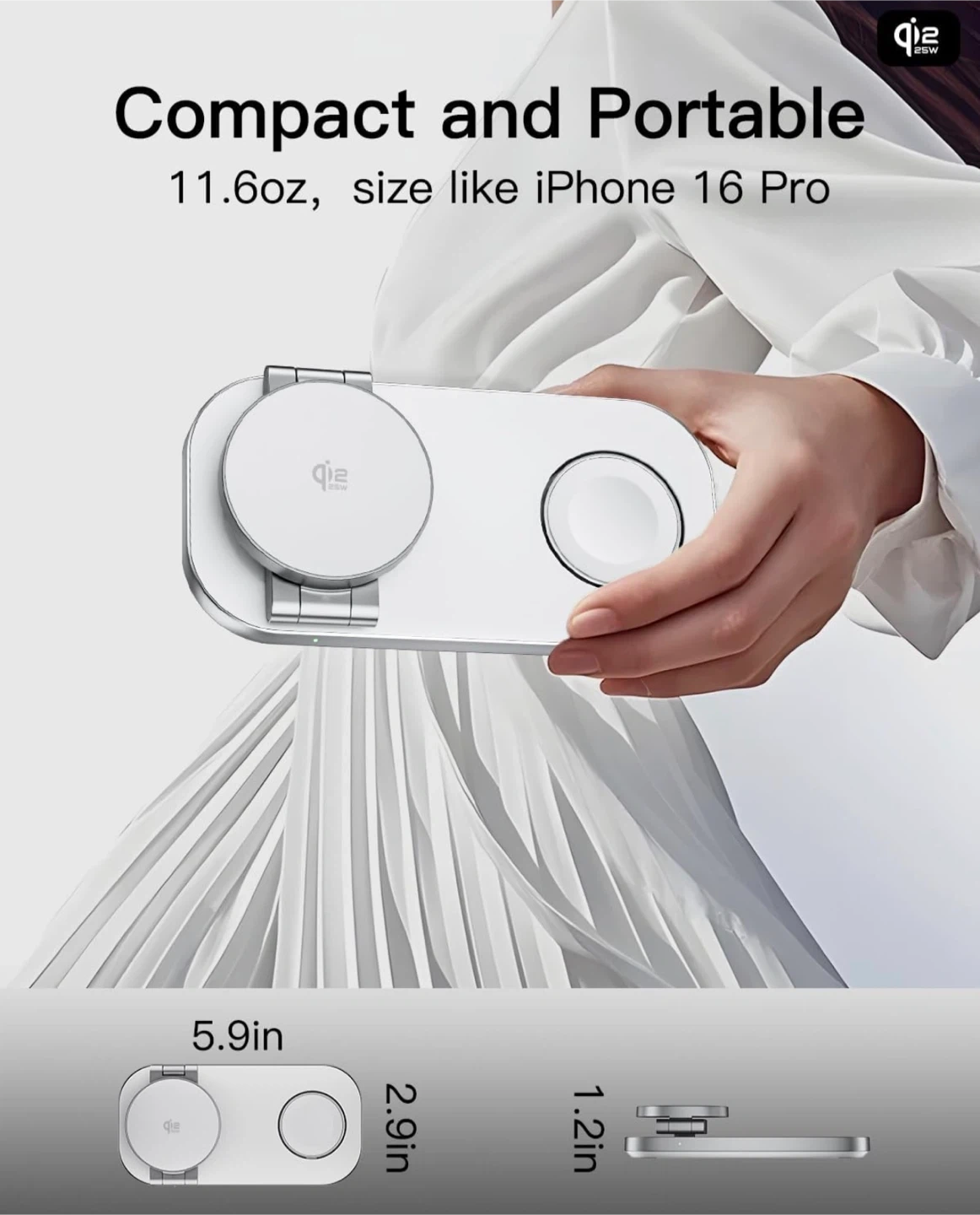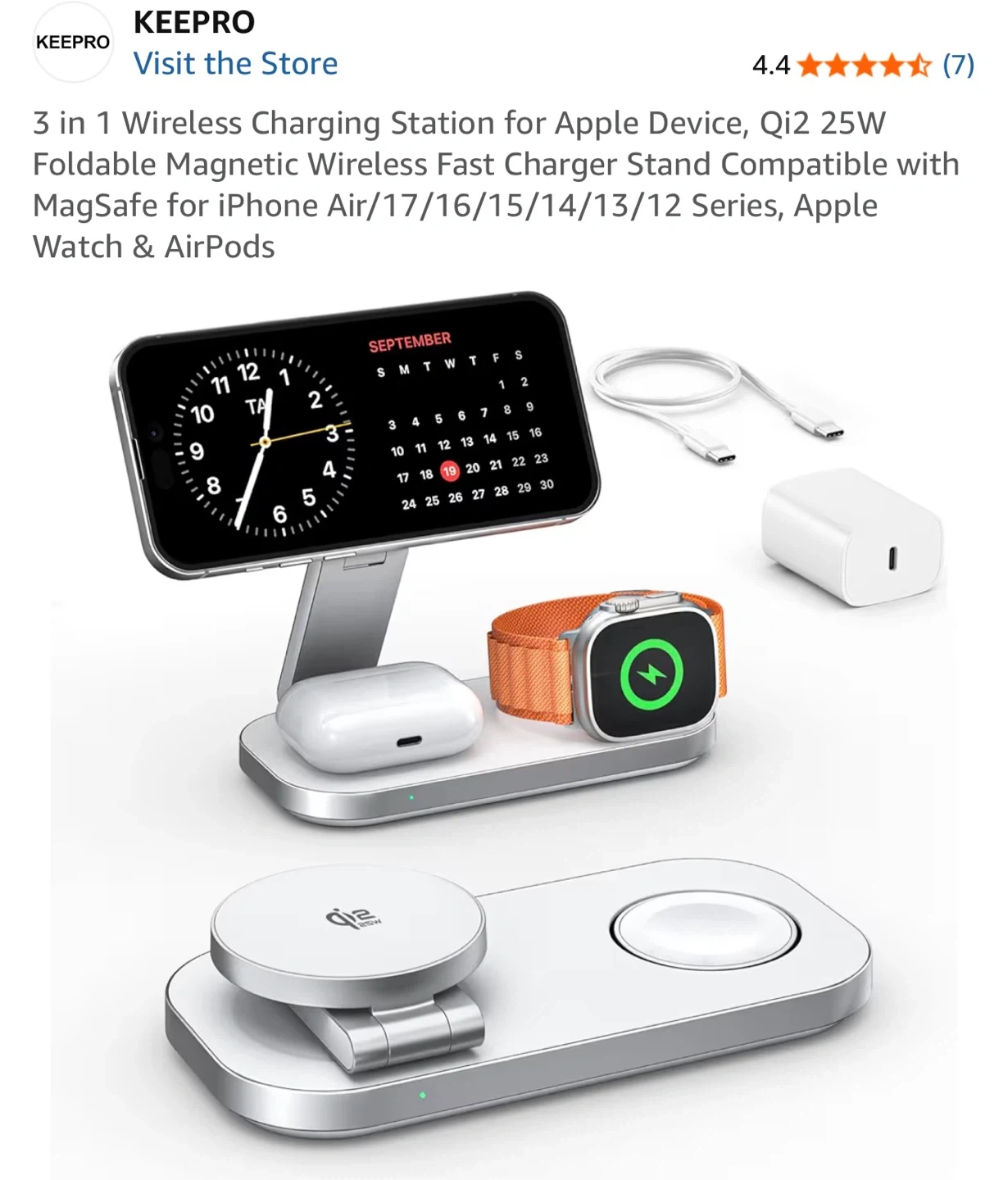 This is a Keepro 3-in-1 wireless charging station. It's designed for Apple devices and offers 25W fast charging. Dimensions are 5.9in x 2.9in x 1.2in when folded.