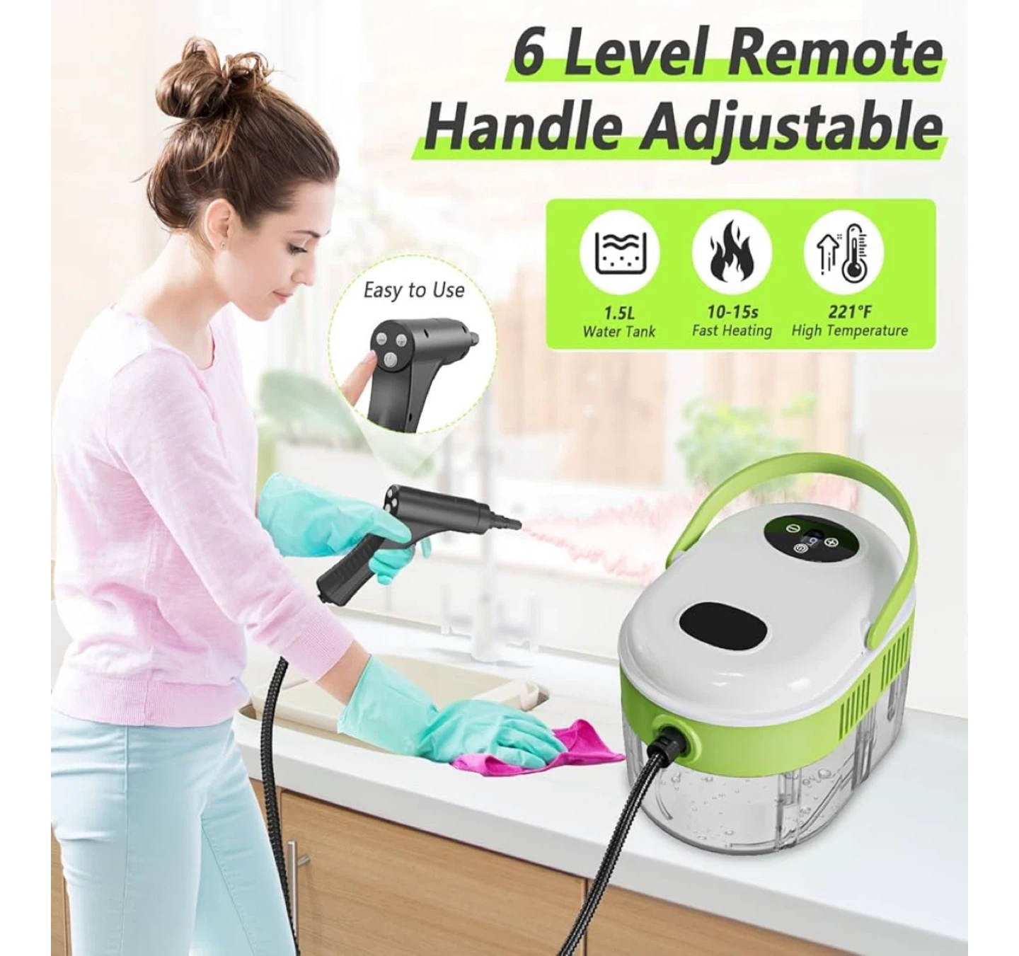 It also has a 1.5L water tank, fast heating in 10-15 seconds, and reaches a high temperature of 221°F