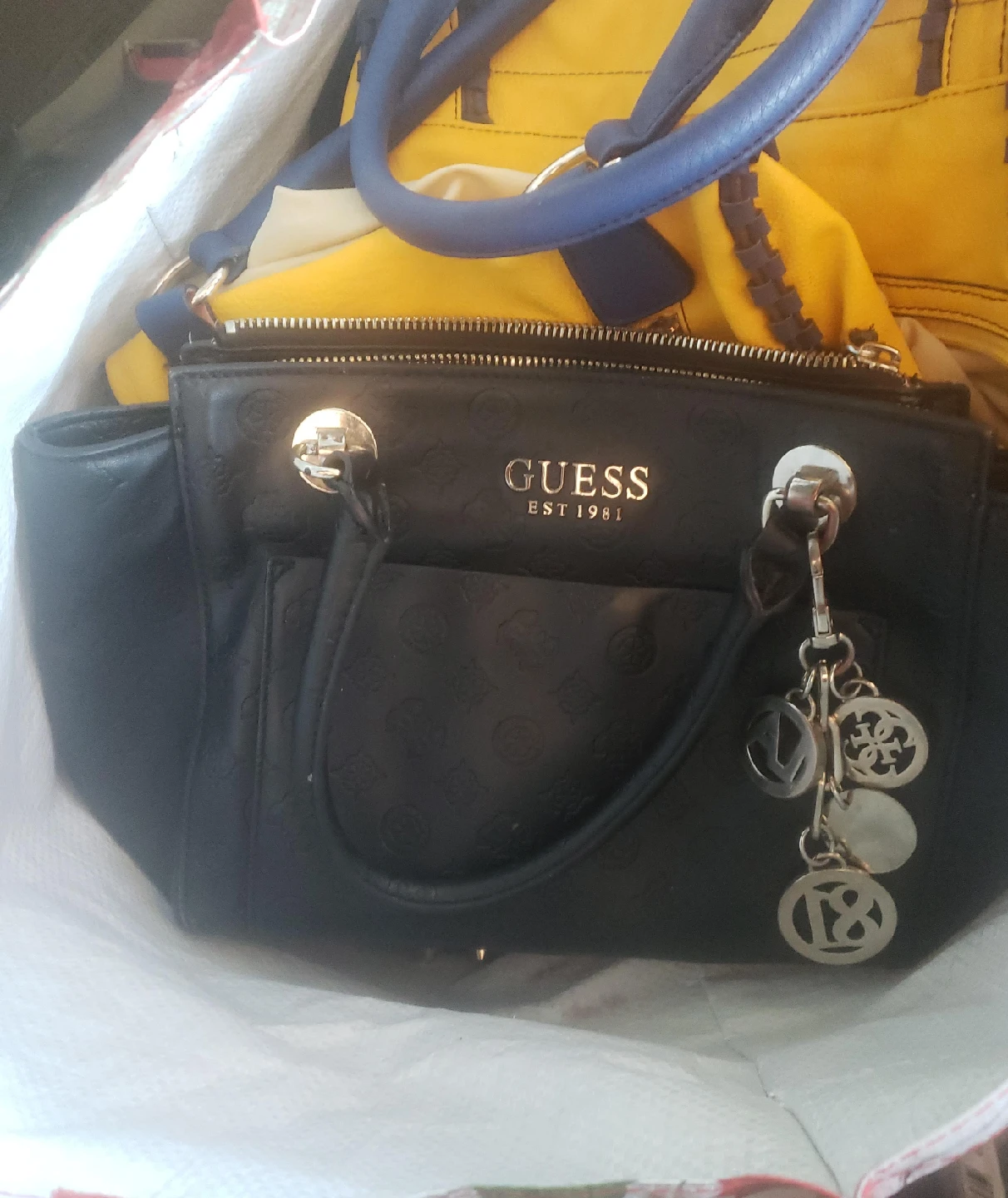 65Selling a Guess handbag in black. It's in great condition and features the classic Guess logo design. Perfect for everyday use!