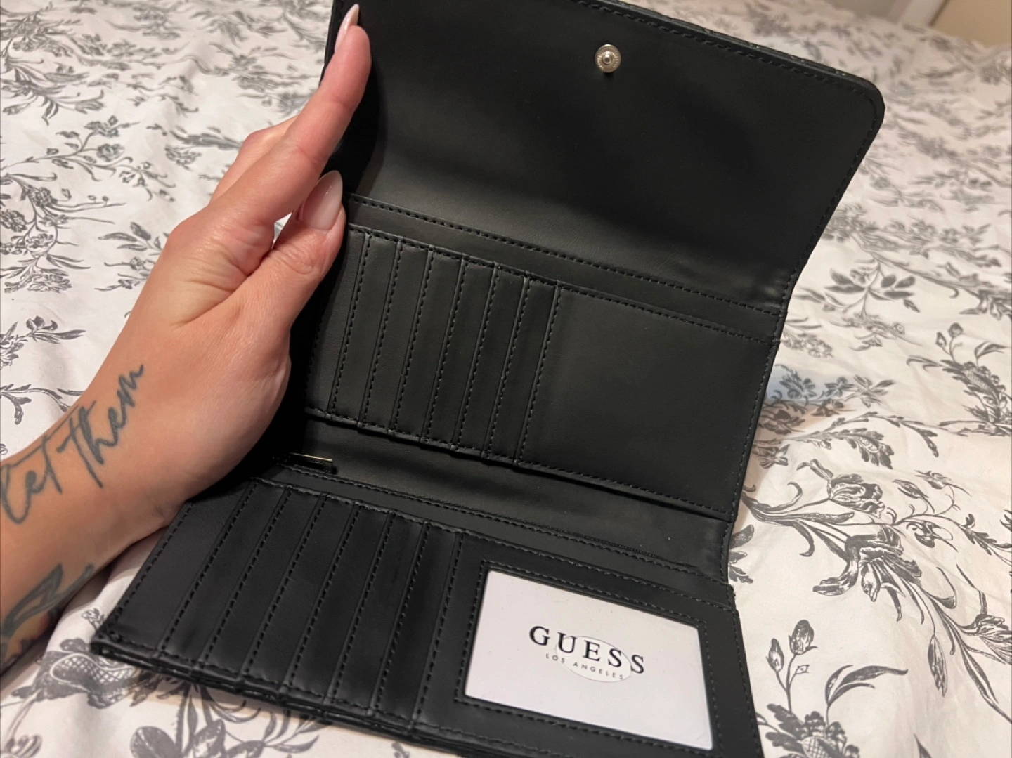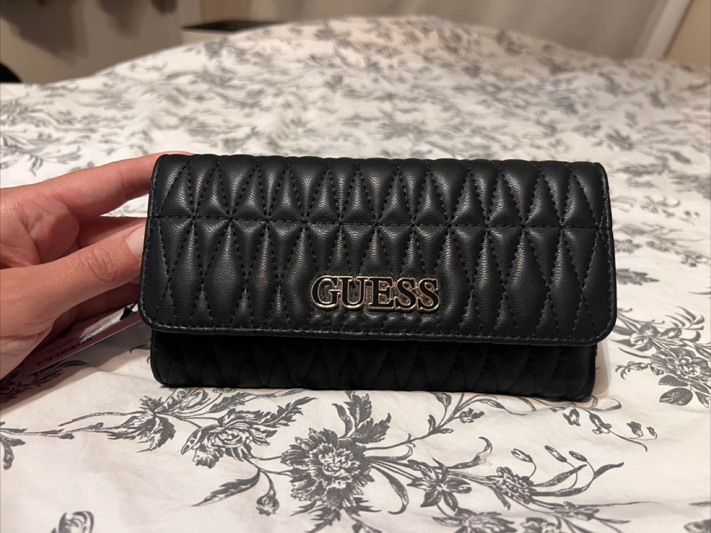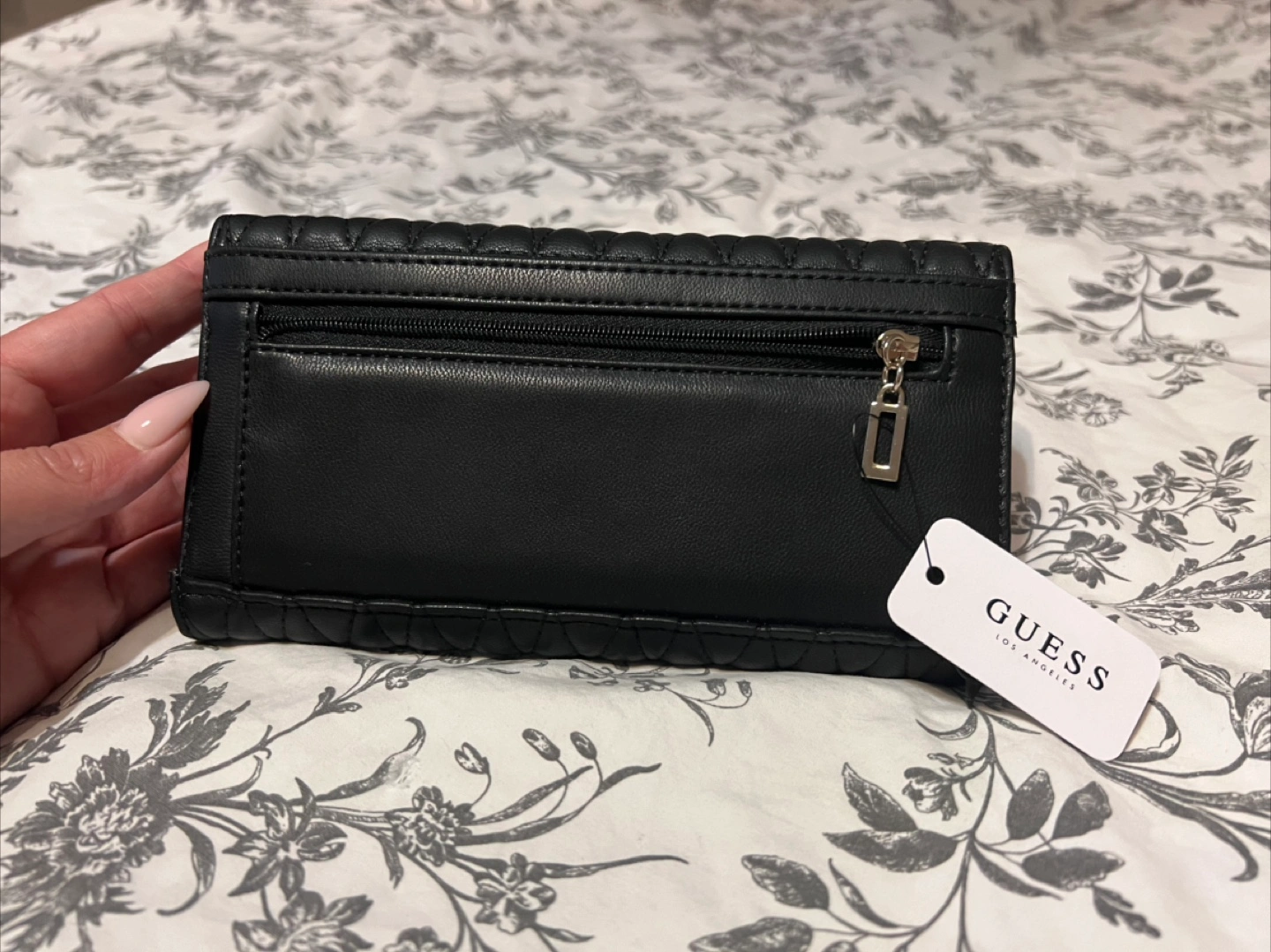 Selling a Guess black quilted wallet. It's in great condition and has lots of room for cards and cash. The wallet features a quilted design and the Guess logo on the front. Perfect for everyday use! New with Tag.