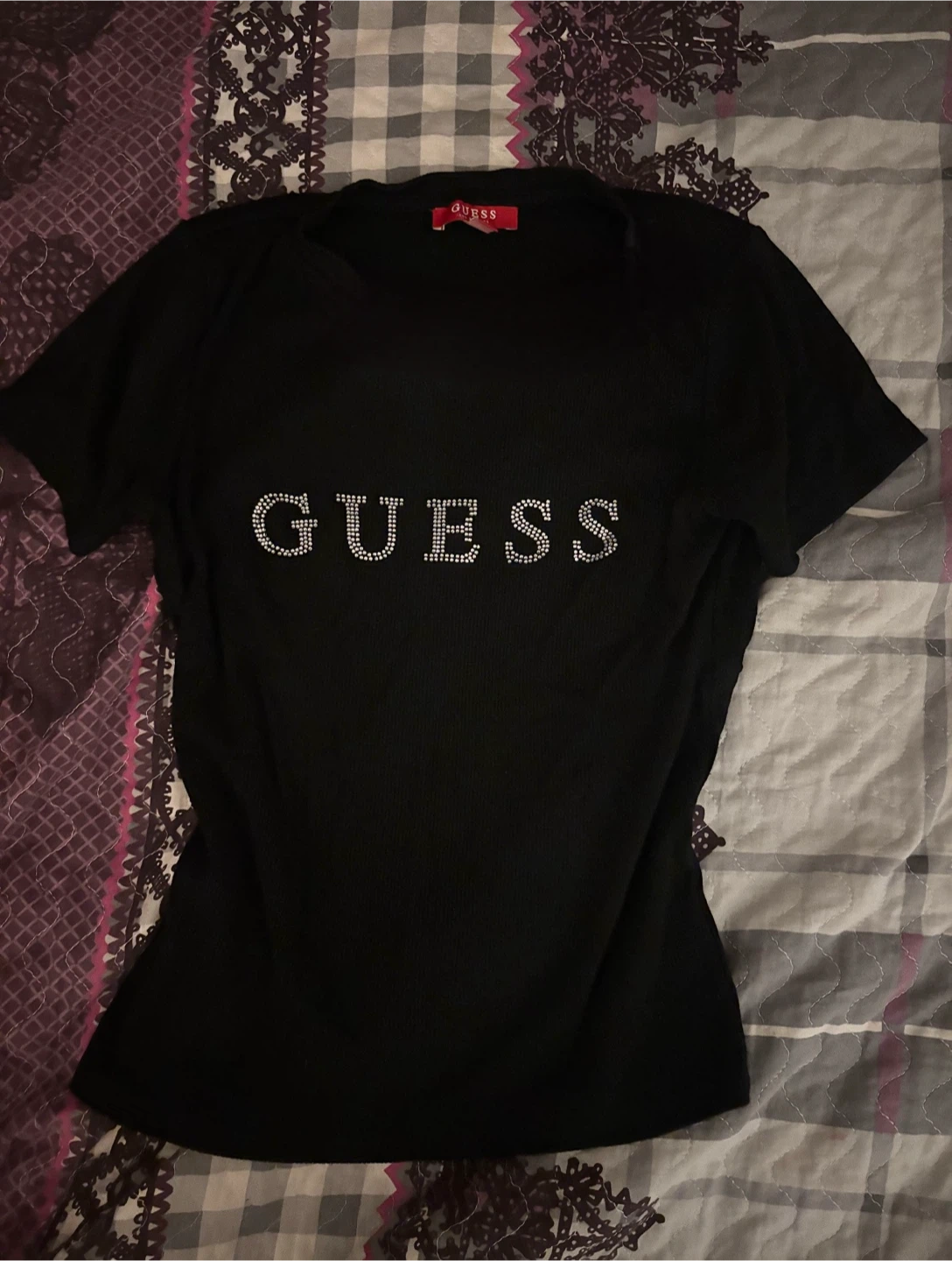 10Selling a cute black T-shirt from Guess! It has the Guess logo spelled out in rhinestones. Great for adding a bit of sparkle to your outfit. M size.