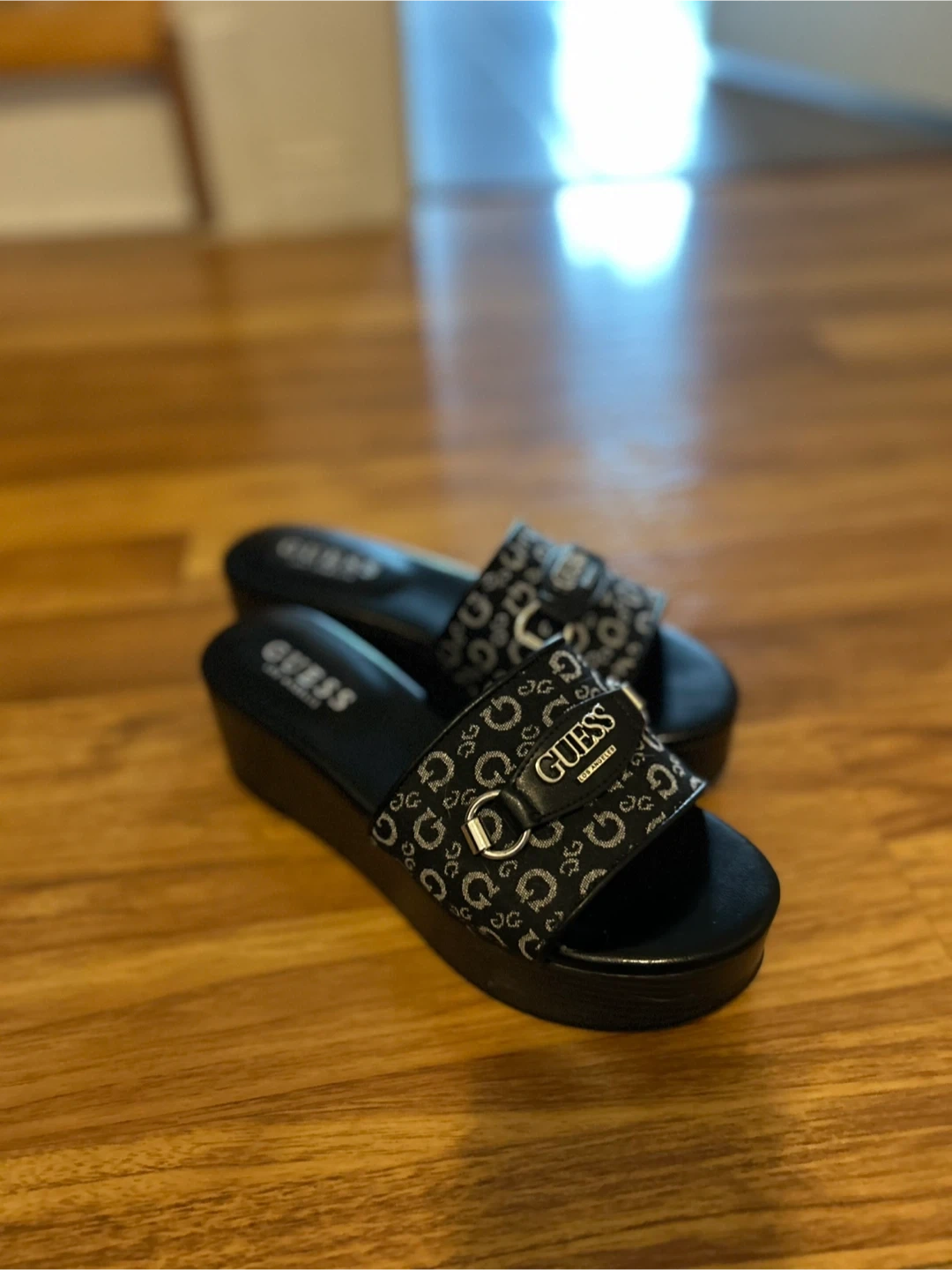 Cute Guess wedge sandals in black with the 'G' logo pattern! These are in great condition and would be a stylish addition to any wardrobes very good condition. Size 5