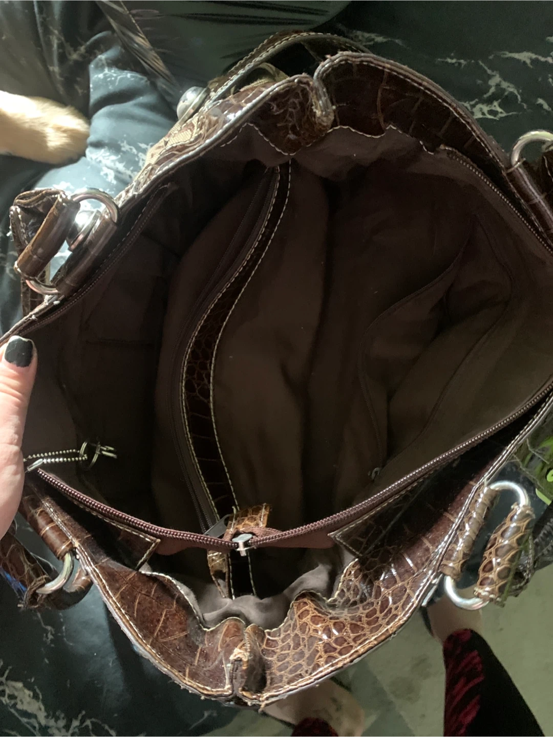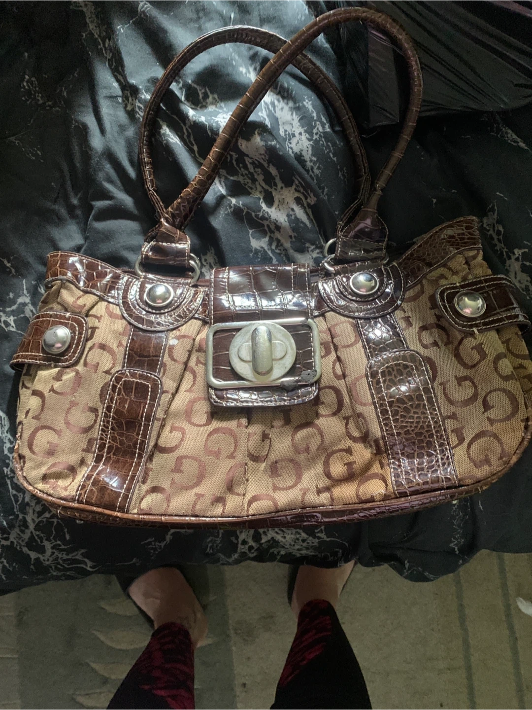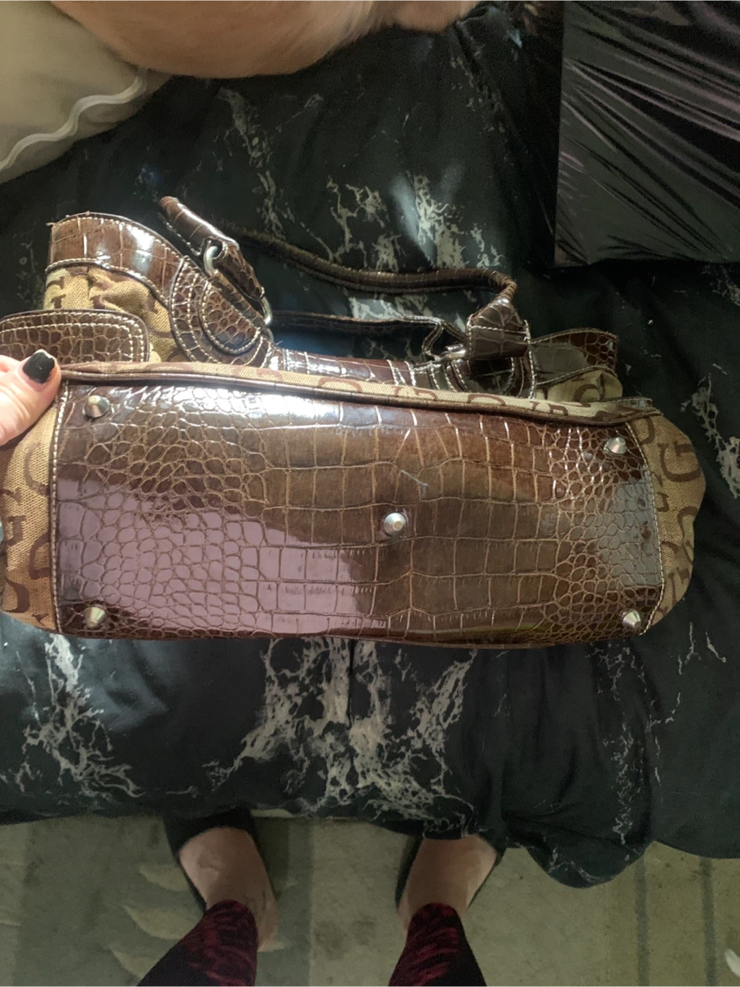 Selling a Guess brown purse. It features a brown "G" logo pattern on the front and sides with faux crocodile skin accents. The interior is brown fabric with multiple compartments.