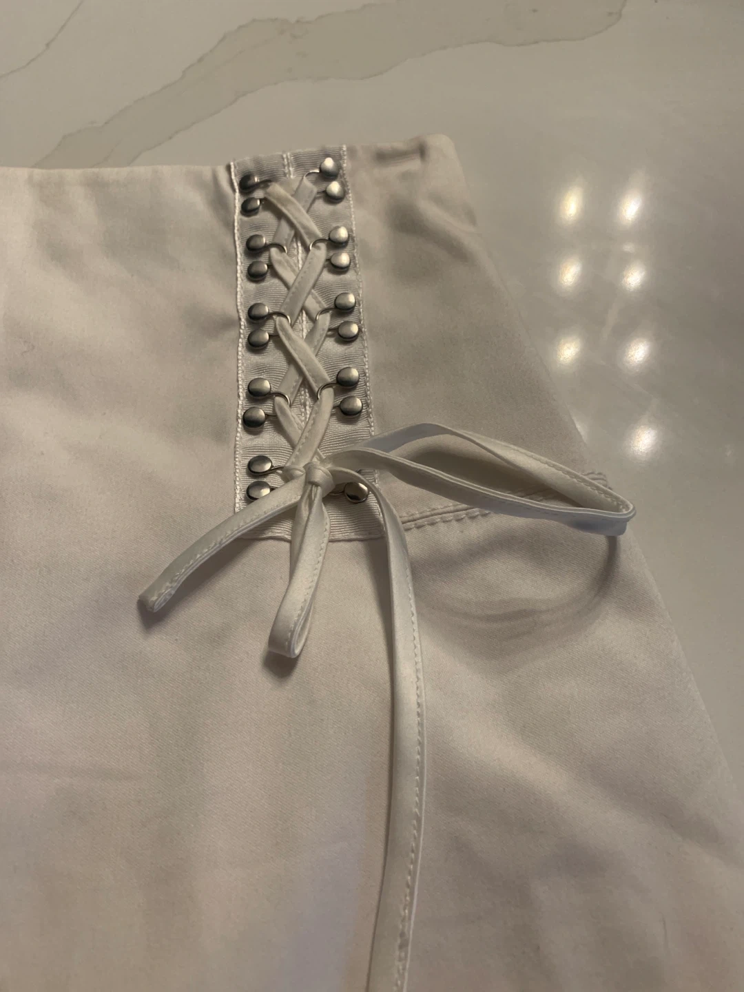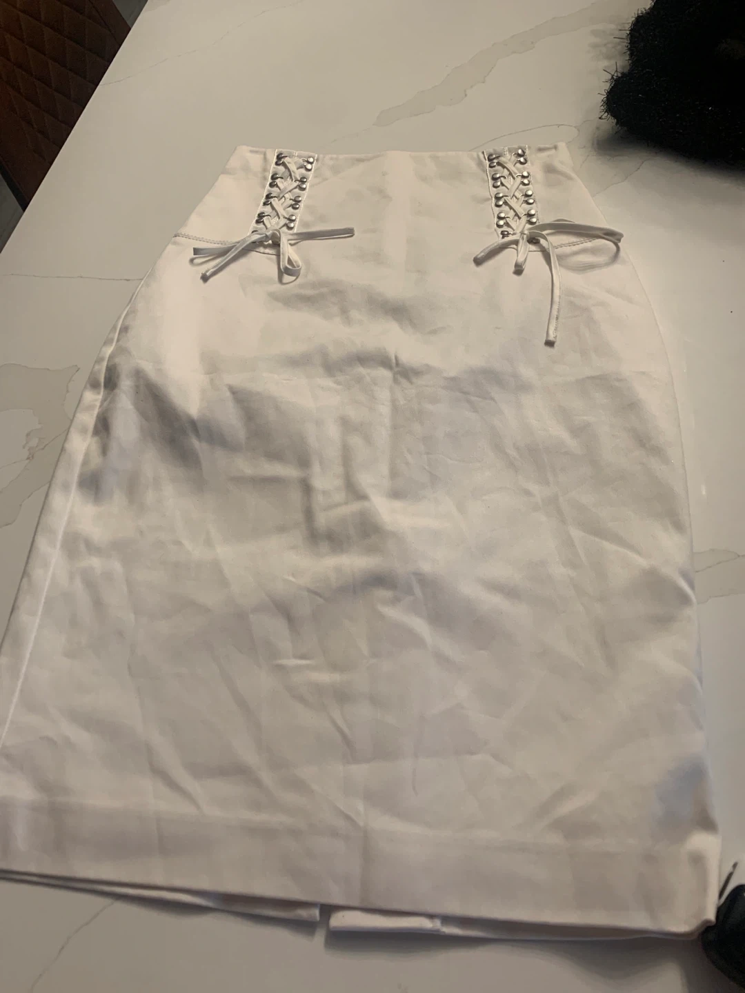 Selling a cute white skirt from Guess by Marciano! It's a size 0 and features a unique lace-up design on the front. Perfect for dressing up or down, this skirt is a stylish addition to any wardrobe