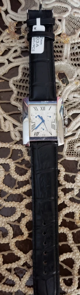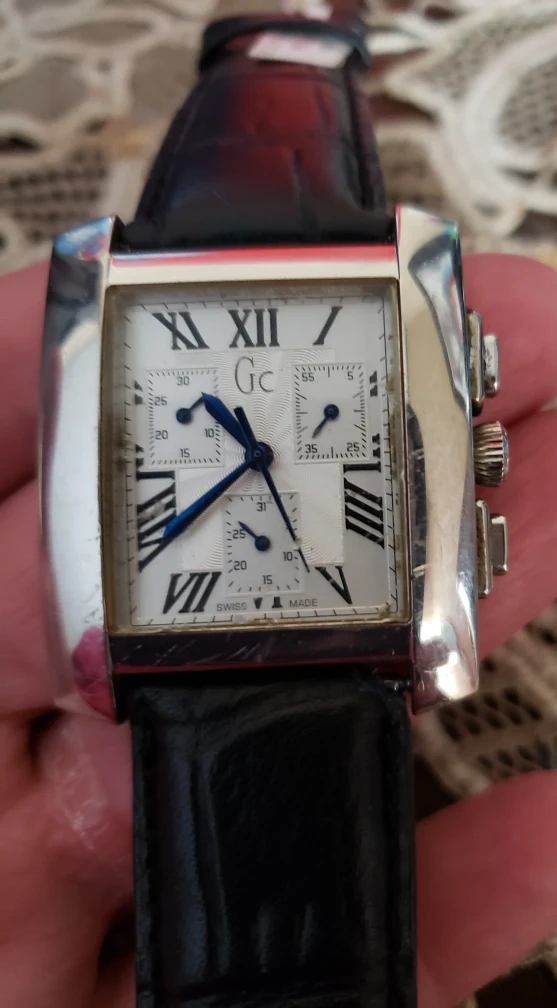 Selling a Guess Collection GC20000 watch. It has a black leather strap and a silver-tone case. The watch face features Roman numerals and chronograph subdials. It's water resistant to 50 meters / 165 feet and Swiss made.