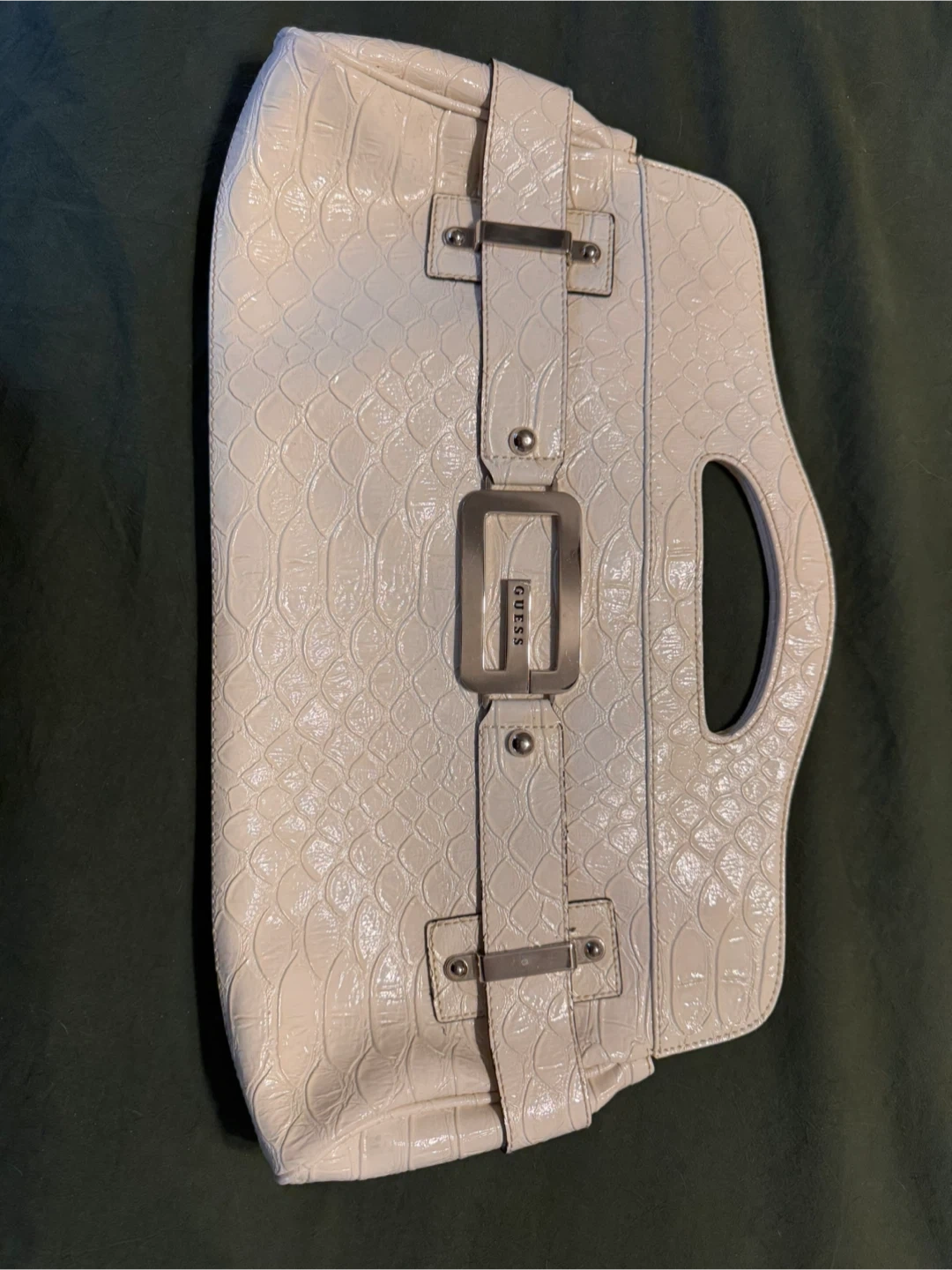 10Selling a cute Guess clutch purse in a cream colour. It has a unique handle and a stylish design that would be great for a night out or special occasion. It's in good condition!