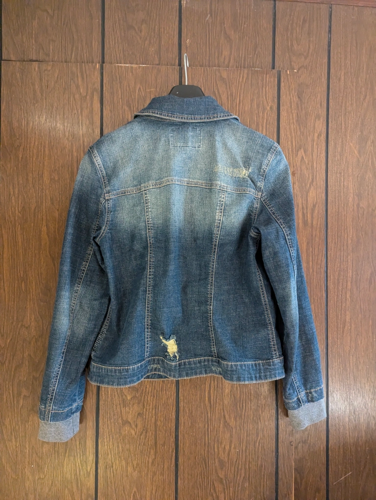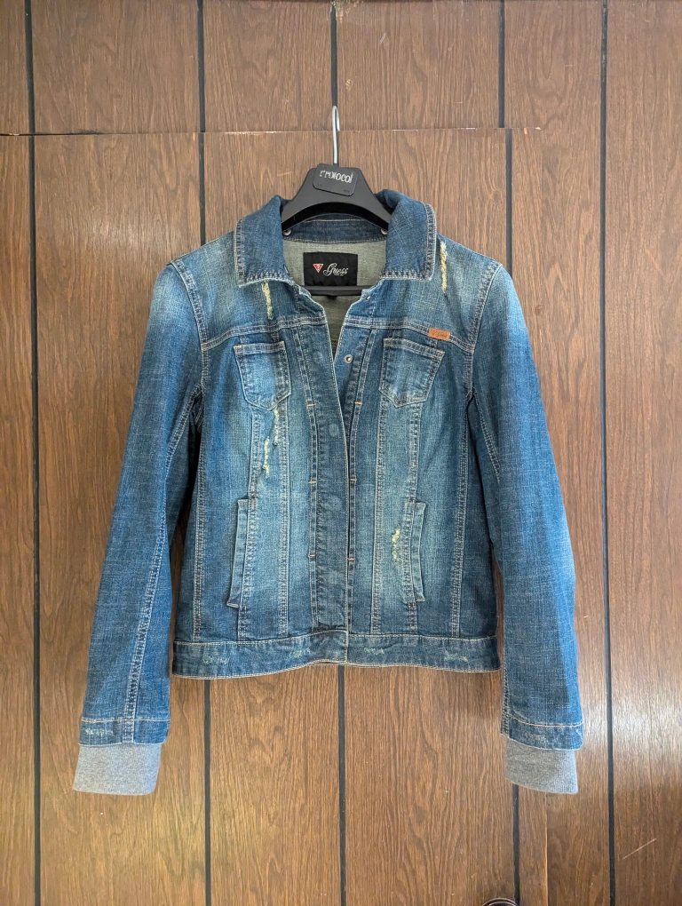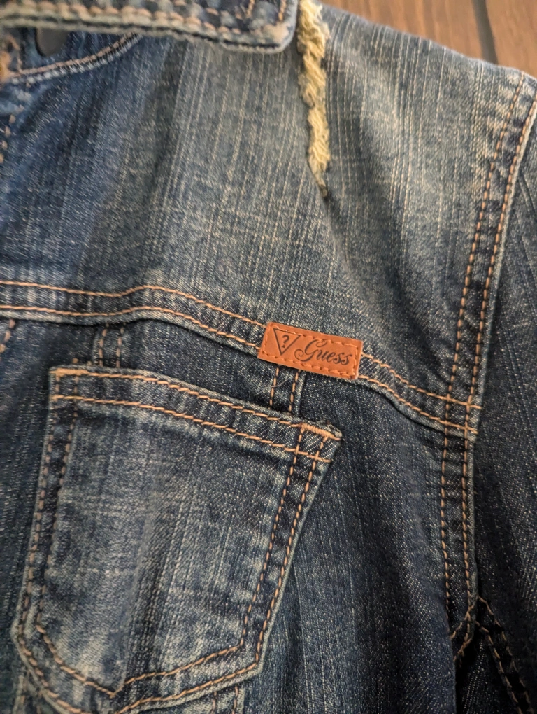 130Selling an authentic Guess denim jacket in size L, but sleeves are a bit tight. It's in great condition and has a stylish, slightly distressed Y2K look. Perfect for layering!