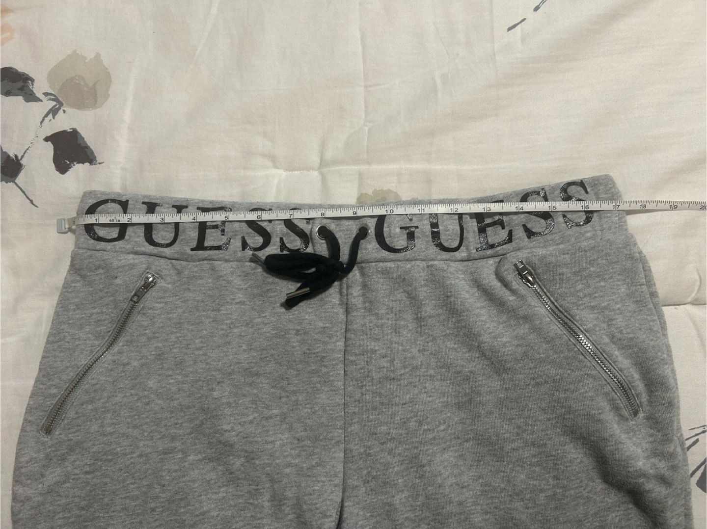Selling a pair of Guess grey joggers in size L. They feature a drawstring waist and zippered pockets. The waist measures approximately 17.5 inches across and the length is about 37.5 inches. Perfect for lounging or casual wear! Only worn a few times! Smoke Free/Pet Free home Check my other listings for more clothing items!