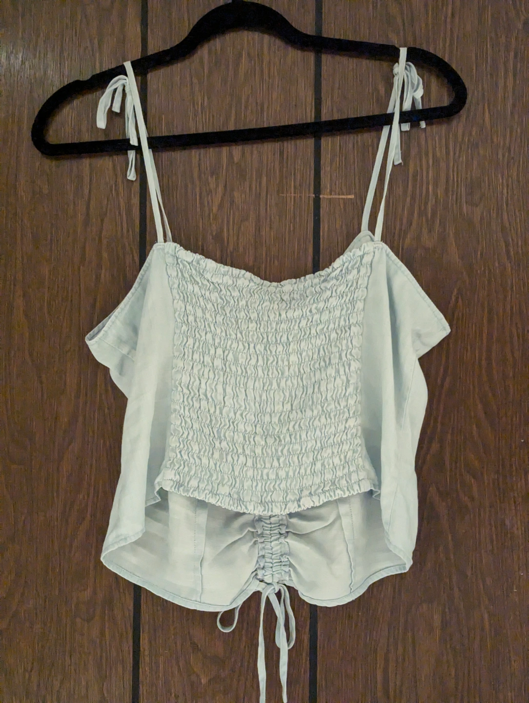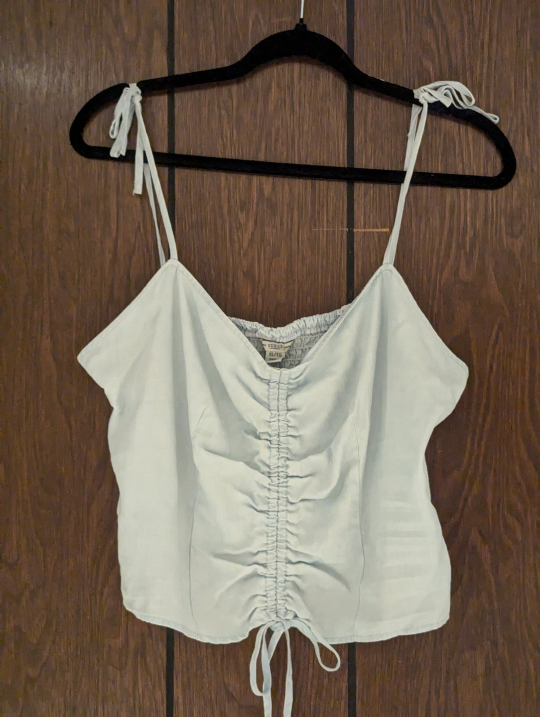 130Cute light blue crop top by Guess. Adjustable straps. Ruched detail at the front. Drawstring at the waist. Size XL. True to size !
