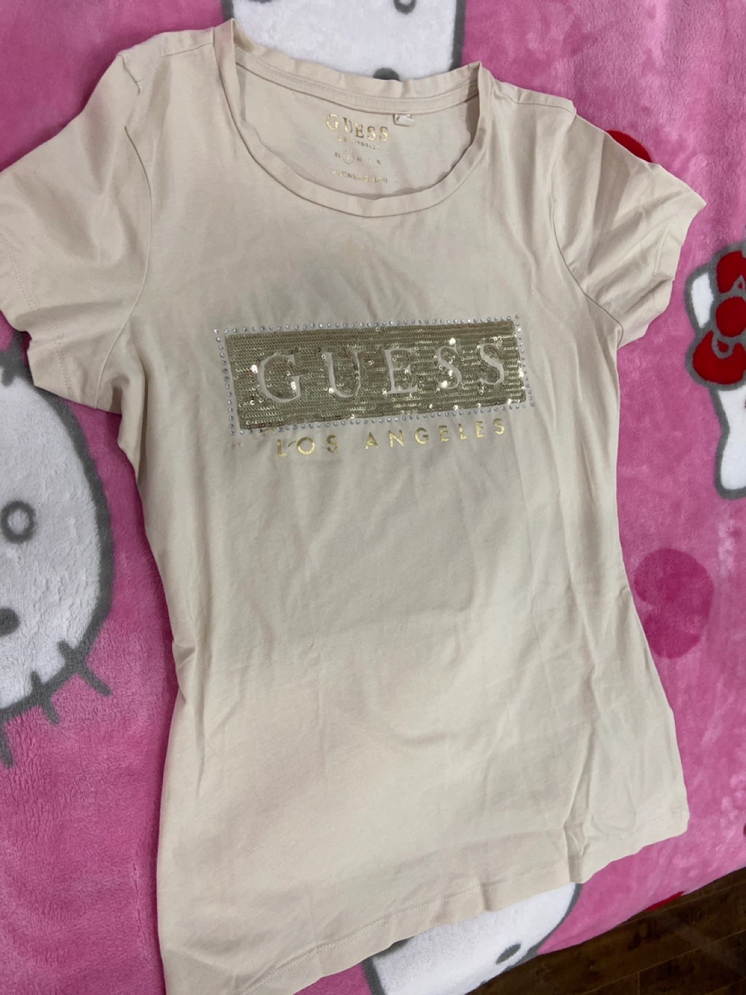 65Selling a cute Guess Los Angeles t-shirt. It's a size XS and in great condition. The shirt is a light beige colour with a sequined 'GUESS' logo. Perfect for casual wear!