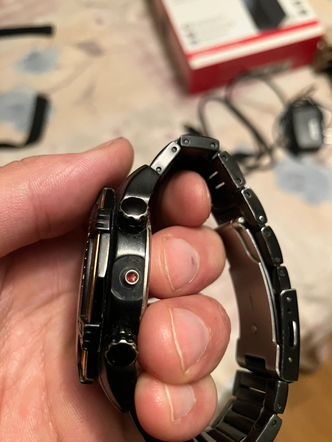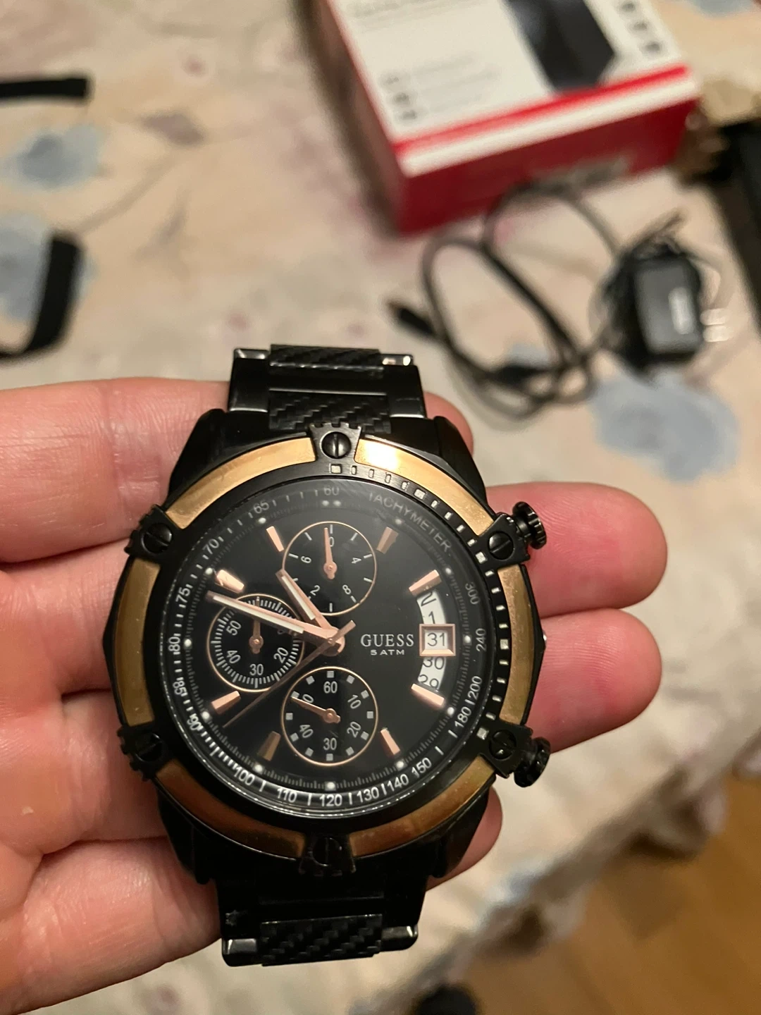 Selling a Guess men's watch in black and gold. It's in good condition and has a stylish design. The watch features a tachymeter and a date display. Perfect for adding a touch of sophistication to your look! Needs battery and a black nut