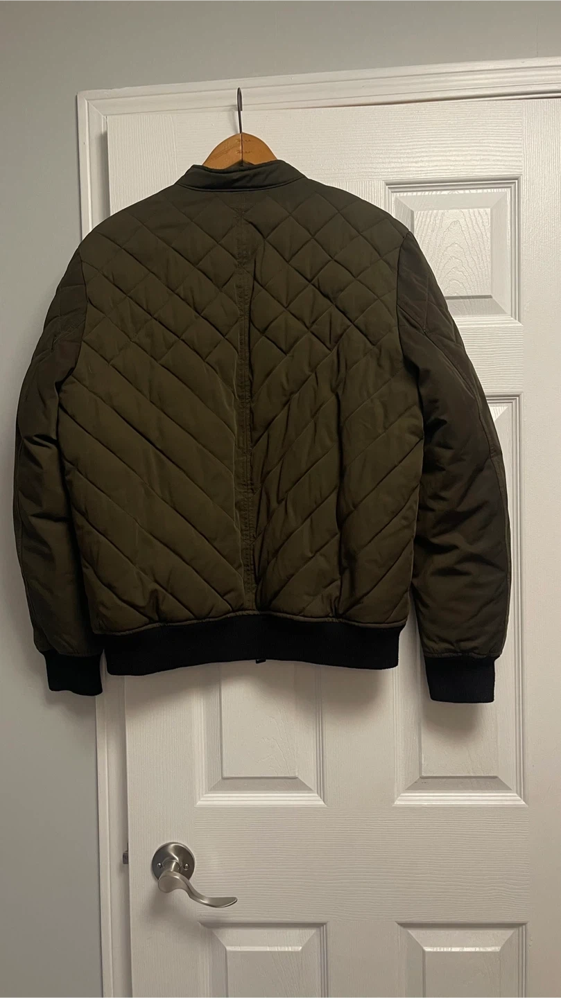 34Here's a stylish Guess bomber jacket in olive green! It features a quilted design and is perfect for adding a touch of cool to your wardrobe. It's in great condition and ready for a new home!