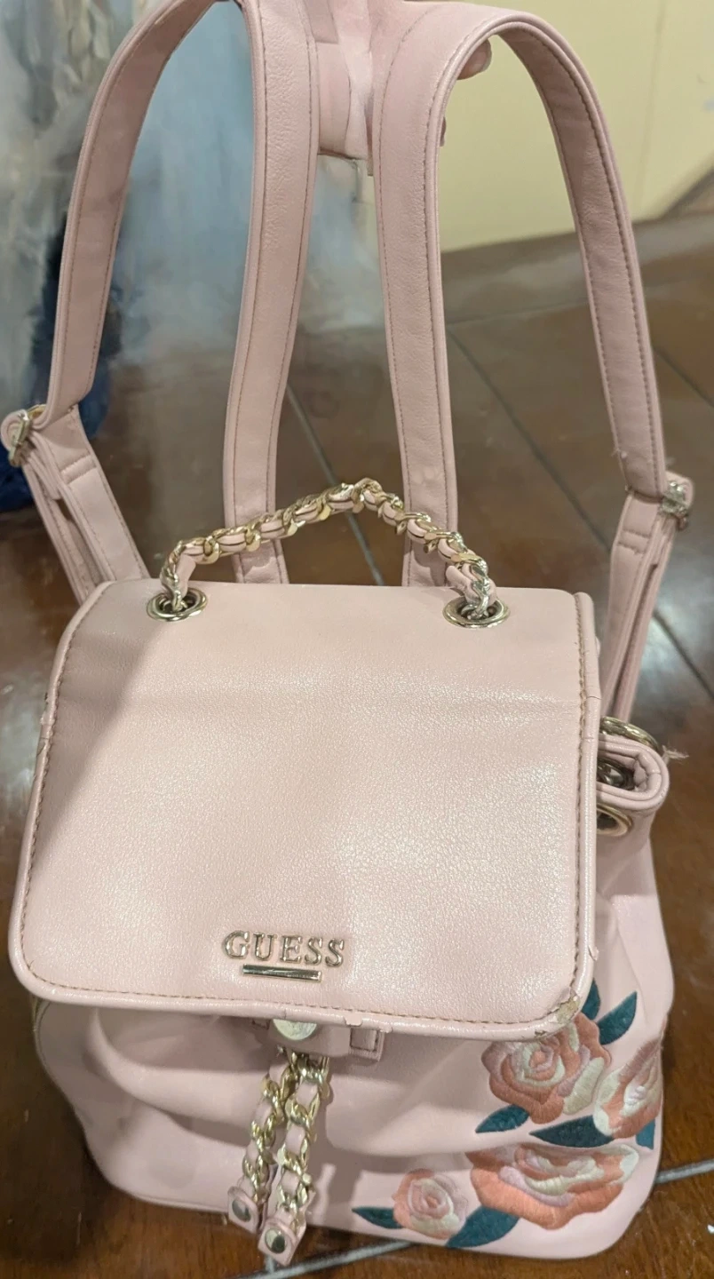 20Selling a cute Guess backpack in a light pink colour. It features floral embroidery and chain detailing. It's perfect for adding a touch of style to your everyday look!
