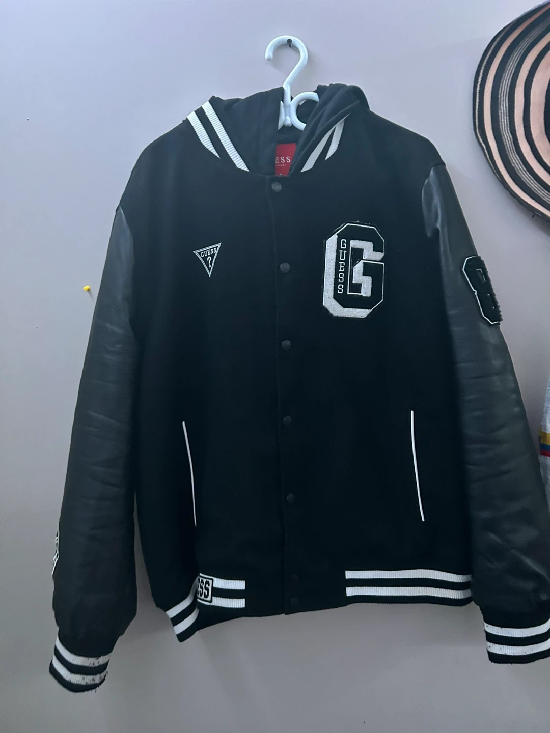 49Selling a Guess varsity jacket in size XXL. It's black with leather sleeves and has a hood. It's in great condition!
