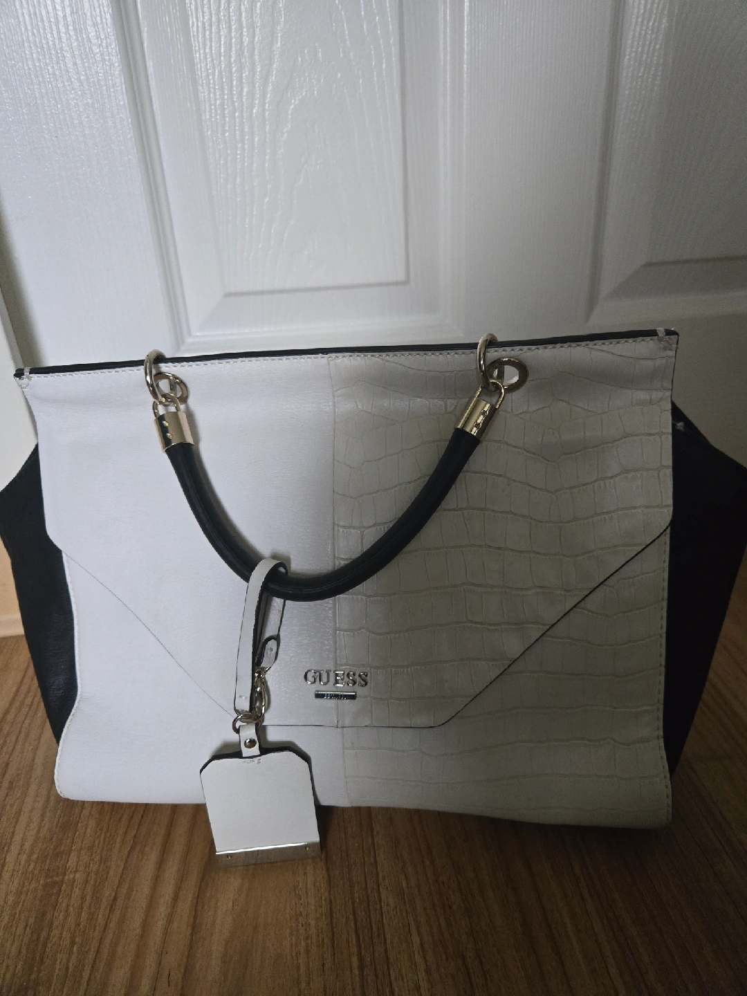 10Selling a stylish Guess tote bag in white and black. It features a unique design with a mix of smooth and textured panels. Perfect for everyday use!