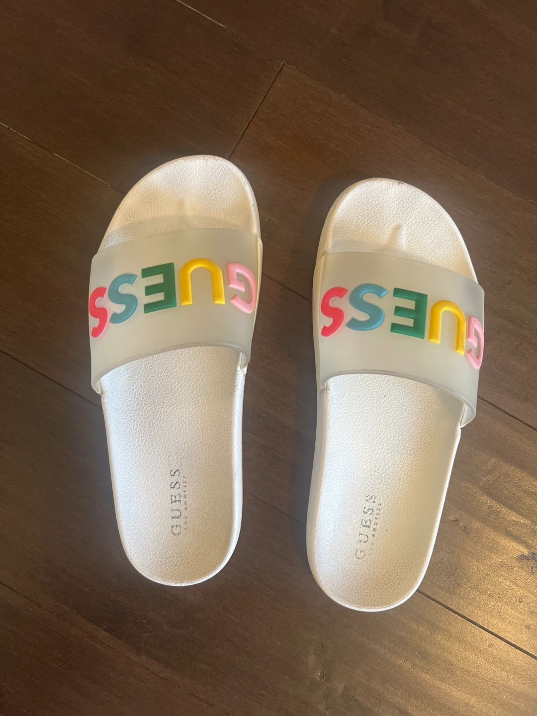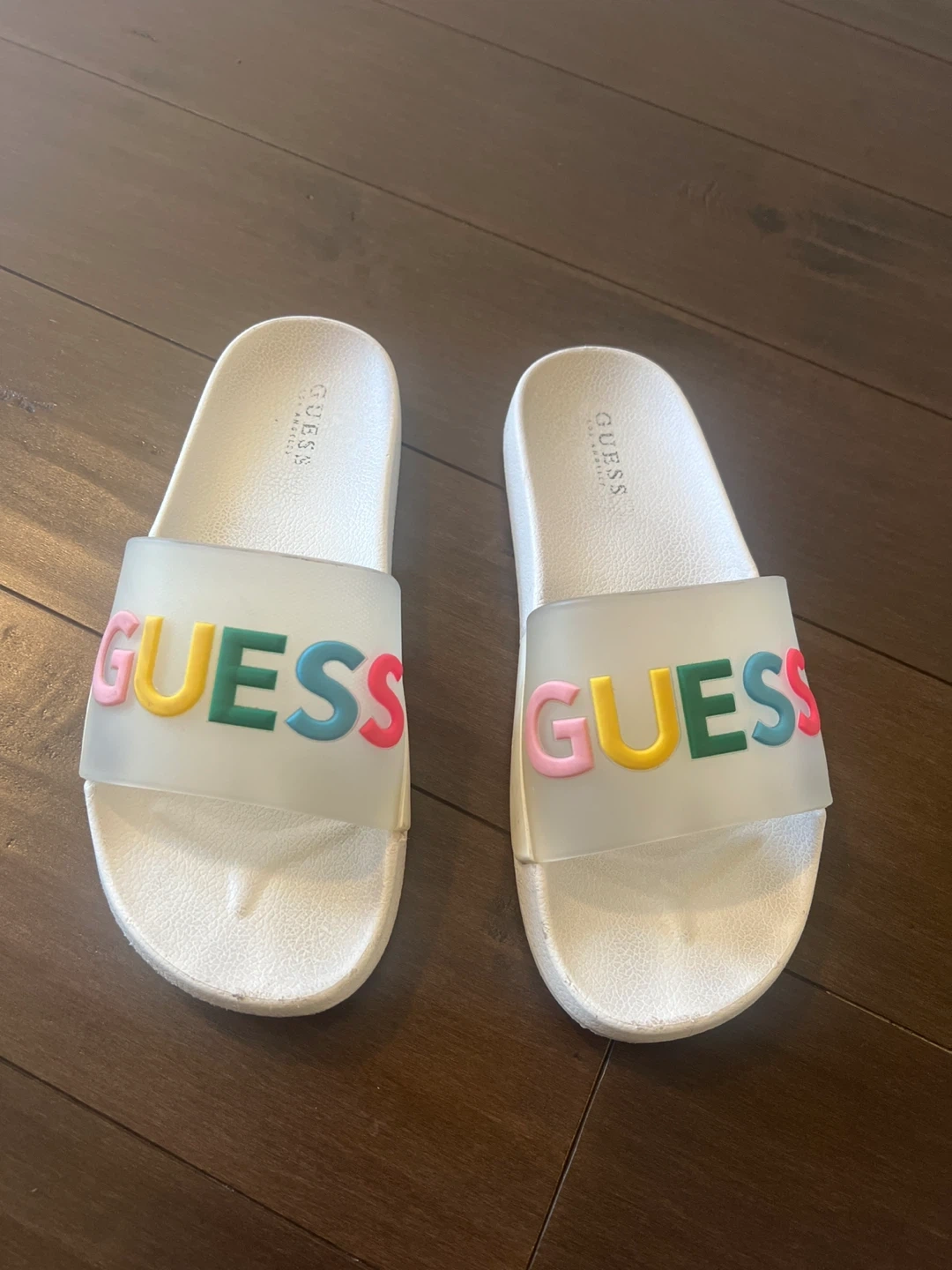 10Cute Guess slides in a size 8! They're white with the Guess logo in colourful letters across the top. Perfect for summer!