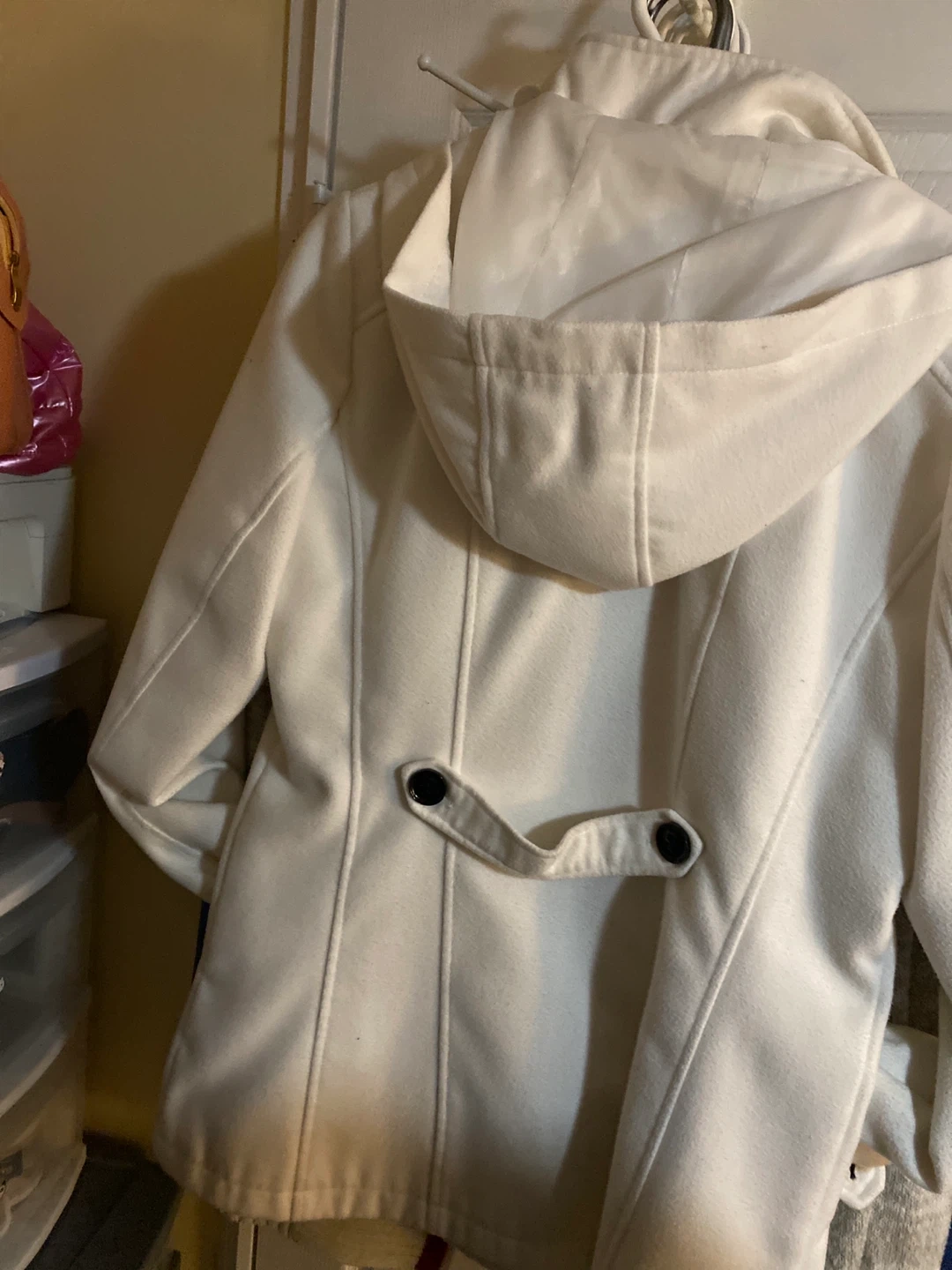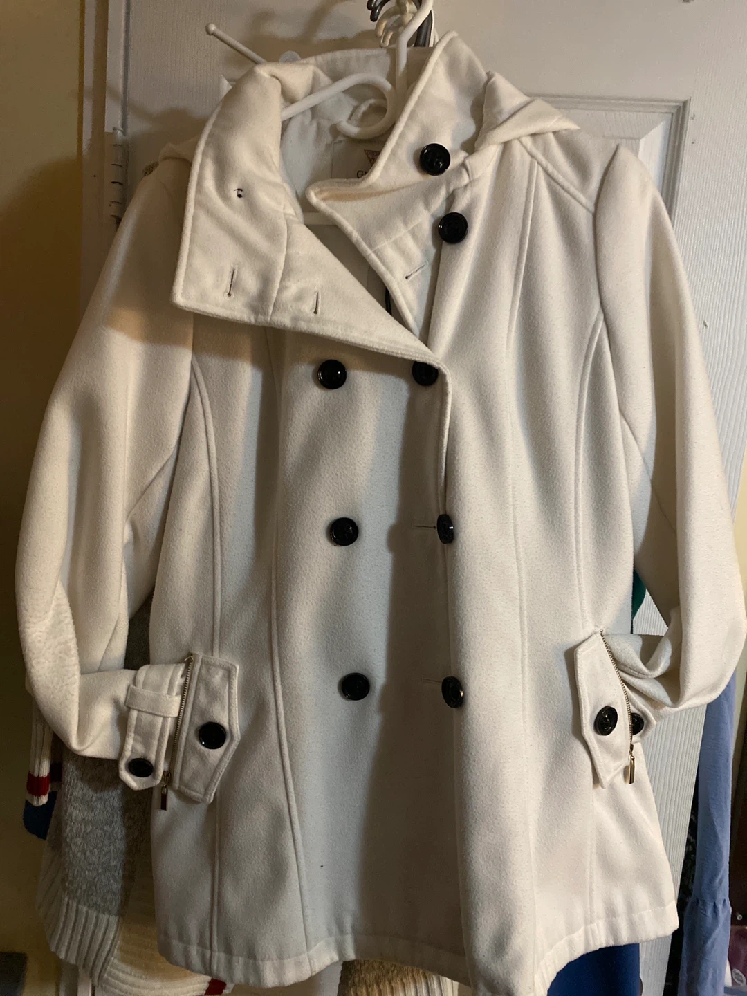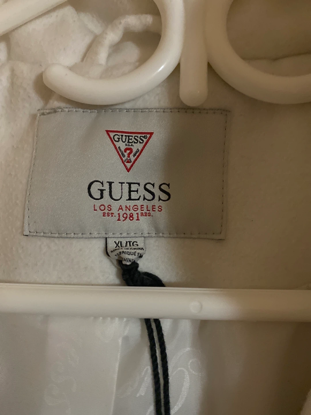 Selling a Guess women's fall coat in white, size XL/TG! It's in great condition and perfect for staying warm and stylish. The coat features a hood and button details. A great addition to your wardrobe! Worn twice What are you waiting for!