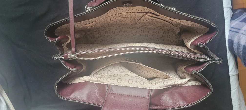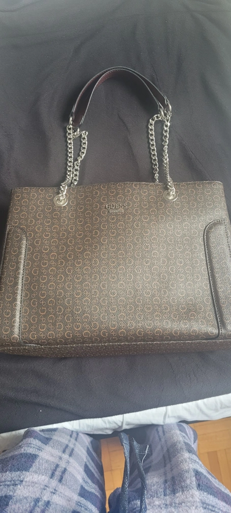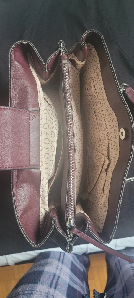 71Brown tote bag with silver chain straps and a burgundy interior. Features several pockets and a zippered closure.