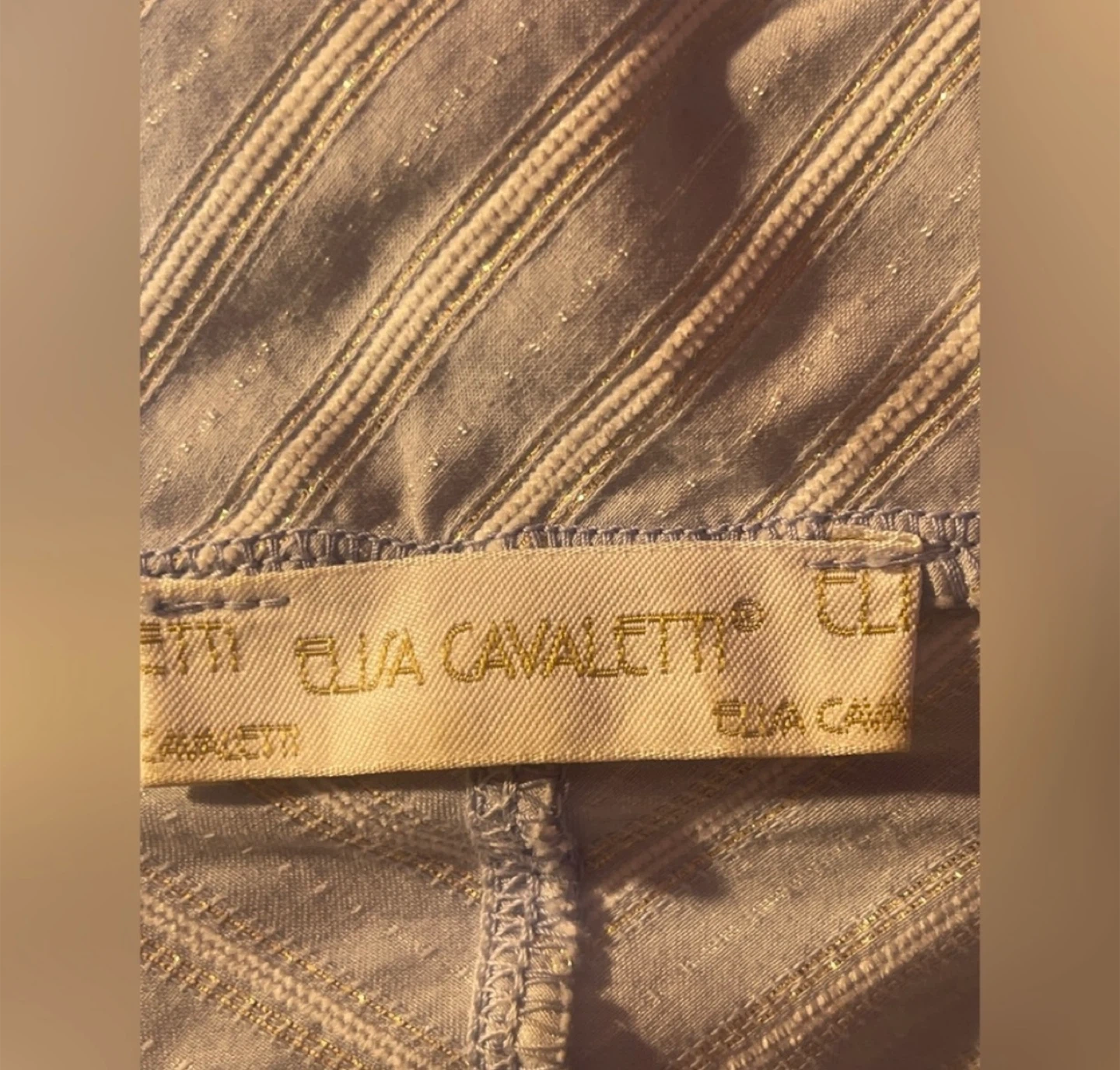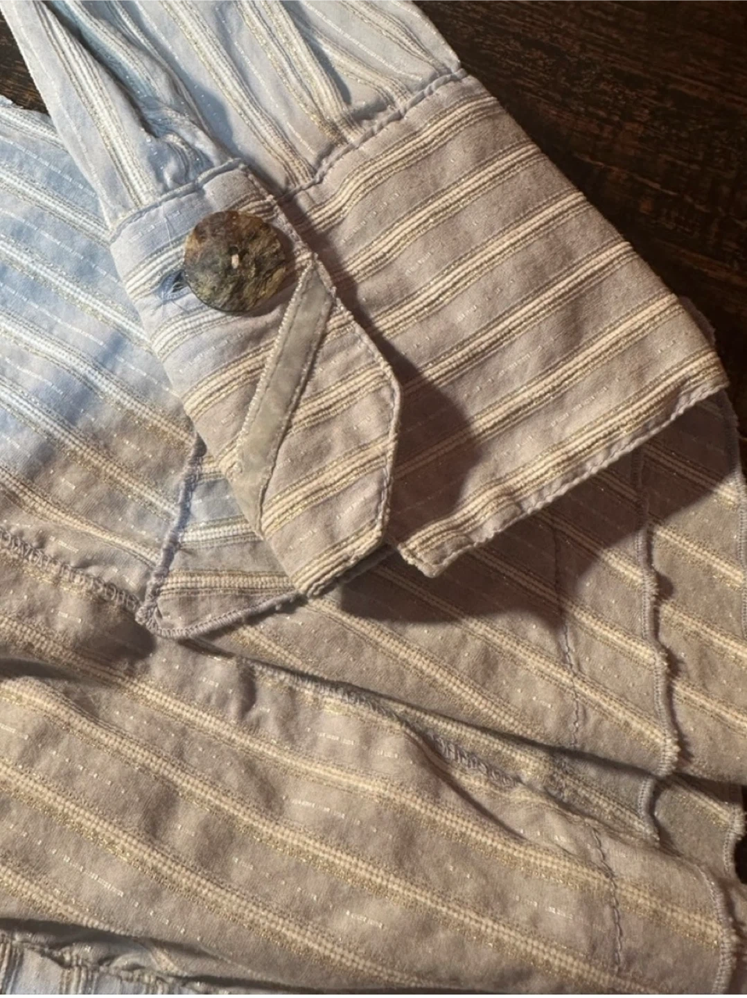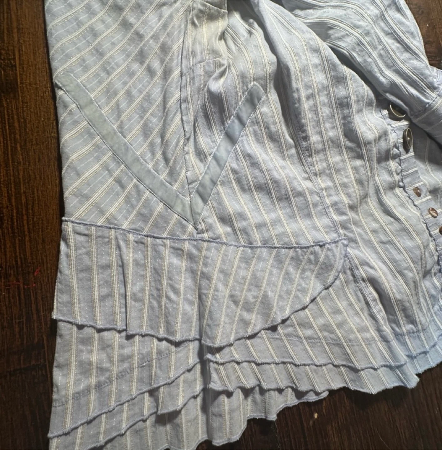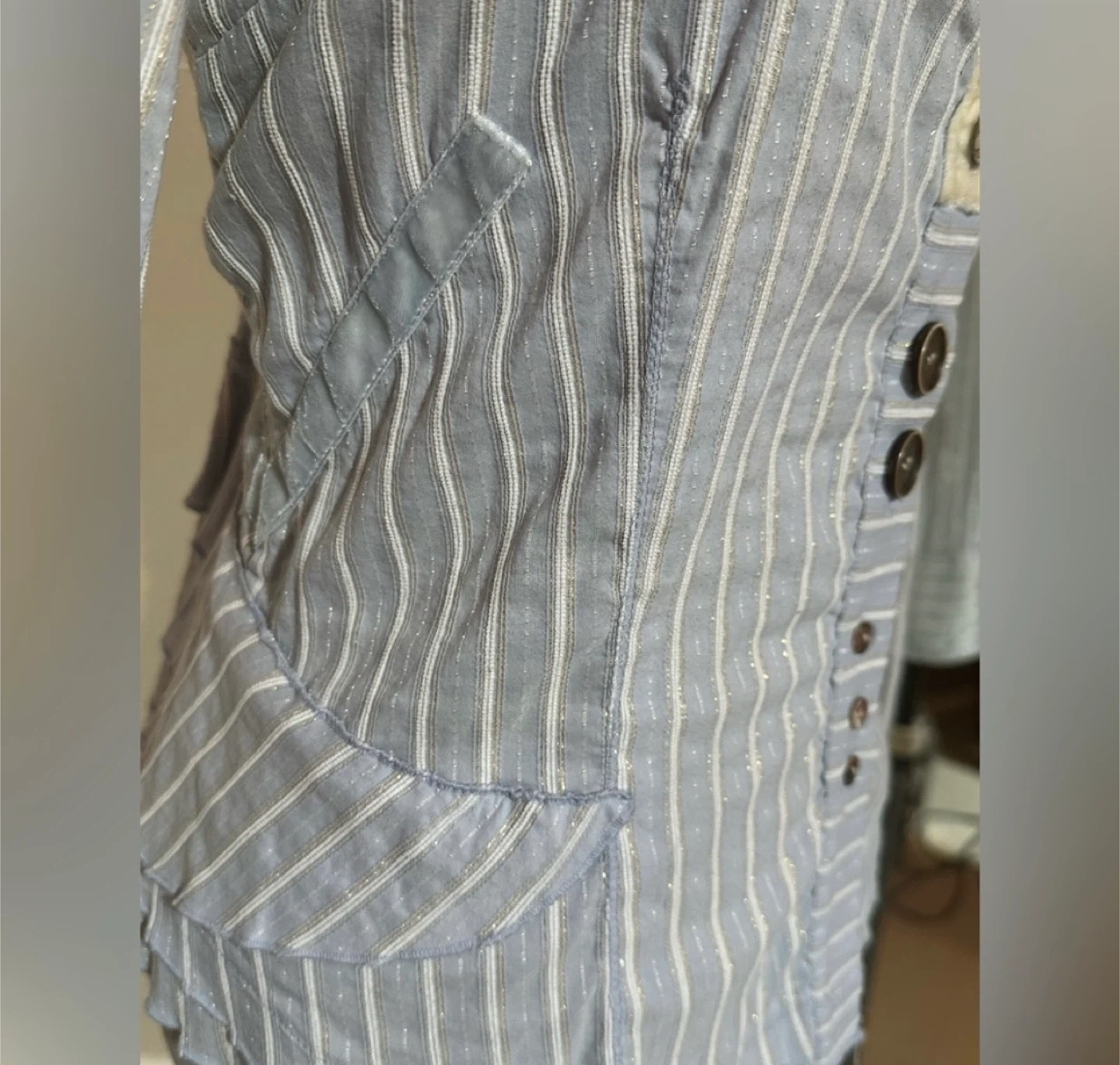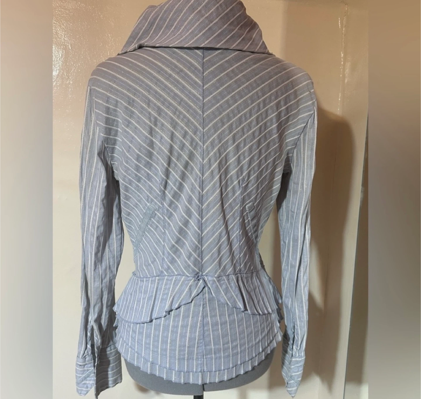 Beautiful Elisa Cavaletti blouse in a soft blue tone with delicate vertical stripes and subtle shimmer woven throughout the fabric. This piece has a tailored, jacket-style silhouette with romantic and architectural details typical of the brand’s Italian aesthetic.
