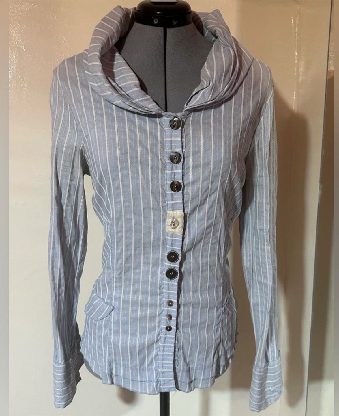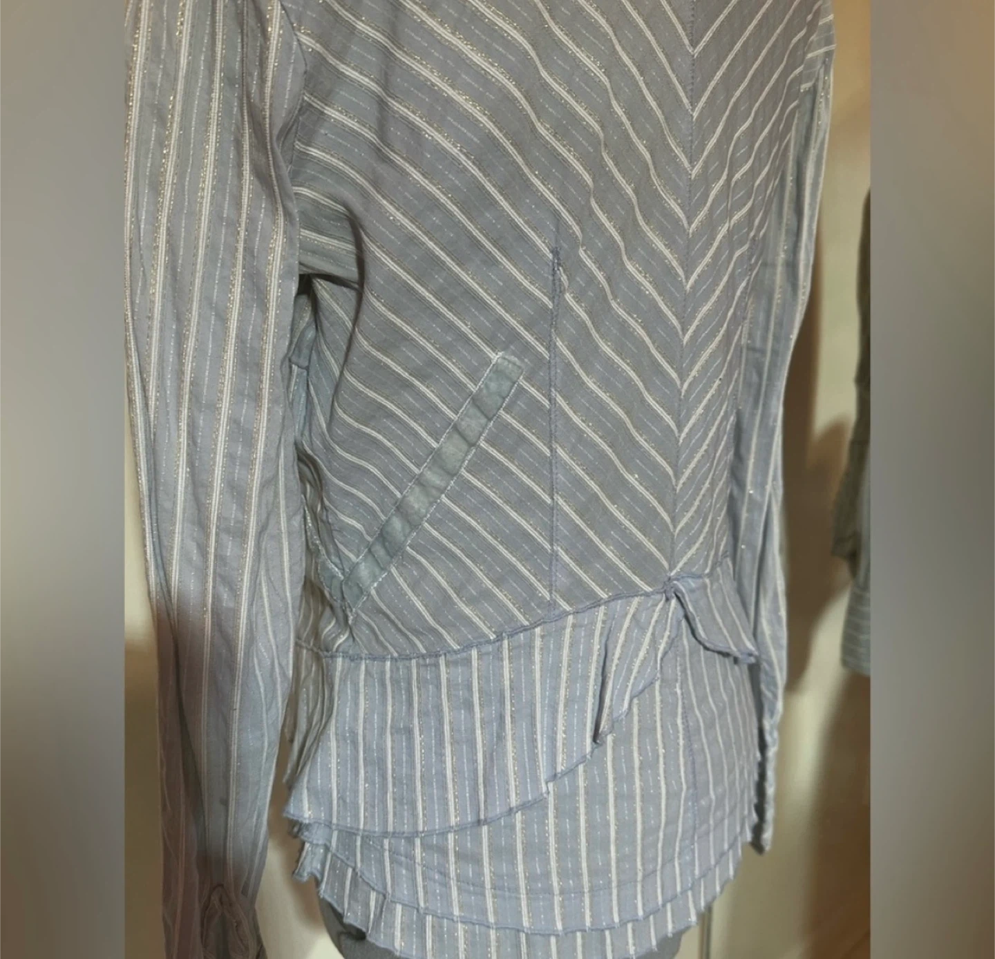 Beautiful Elisa Cavaletti blouse in a soft blue tone with delicate vertical stripes and subtle shimmer woven throughout the fabric. This piece has a tailored, jacket-style silhouette with romantic and architectural details typical of the brand’s Italian aesthetic.
