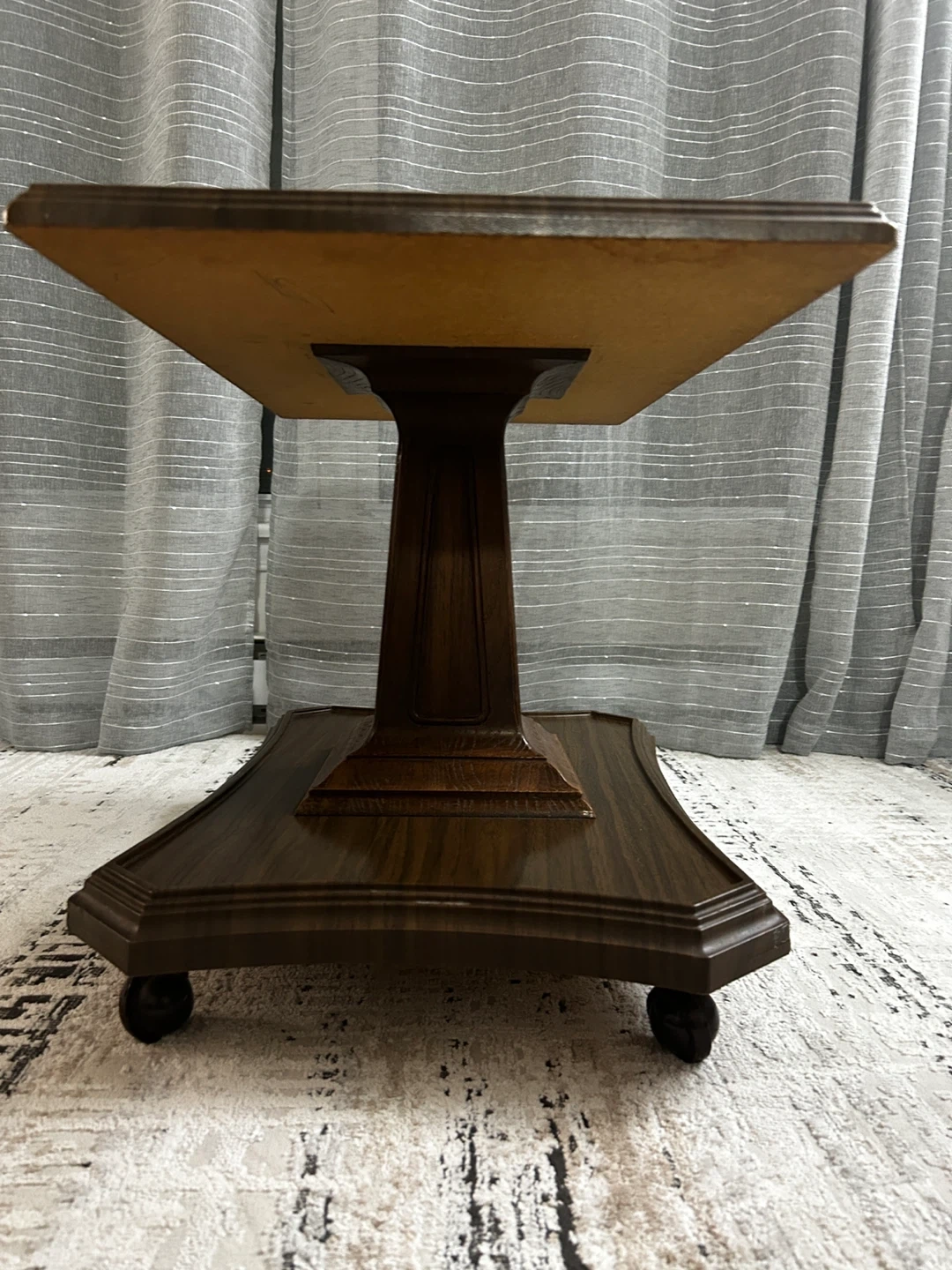 A dark wood accent table with a pedestal base and a wide, decorative bottom. It has a rich, polished wood finish and sits on four small wheels for easy movement. This table is a handsome addition to any room.