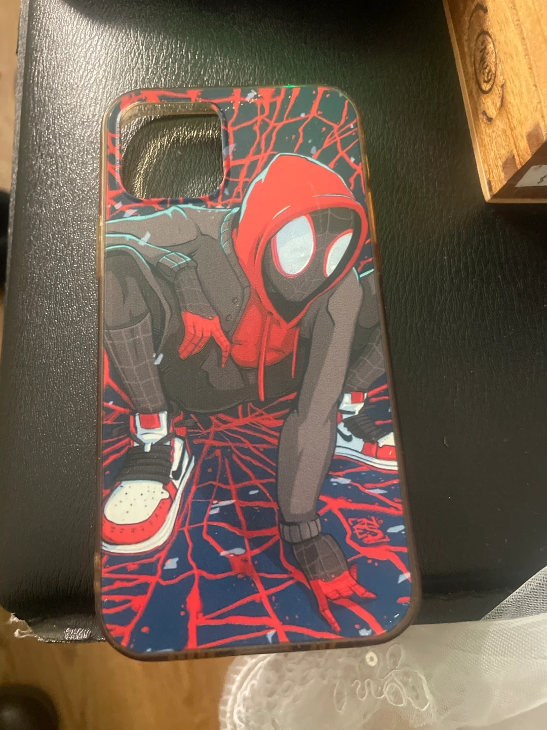 Cool Spider-Man themed phone case! It features a design of Miles Morales in his Spider-Man suit. Perfect for any Spider-Man fan!