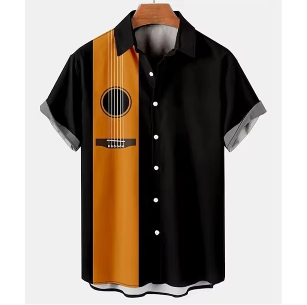 74This is a short sleeve button up shirt with a guitar print design. It features a black and orange colour scheme, perfect for adding a unique touch to your wardrobe