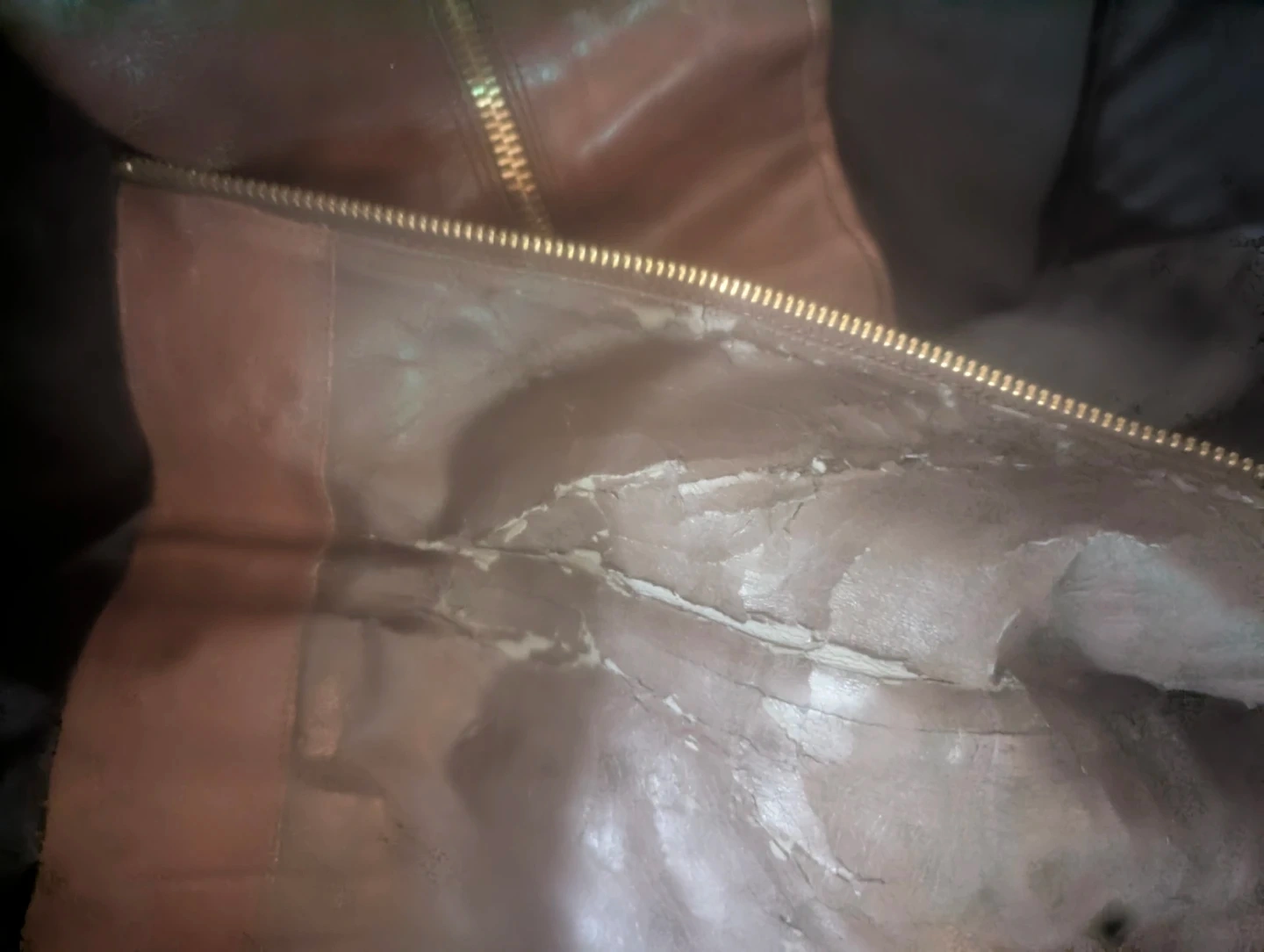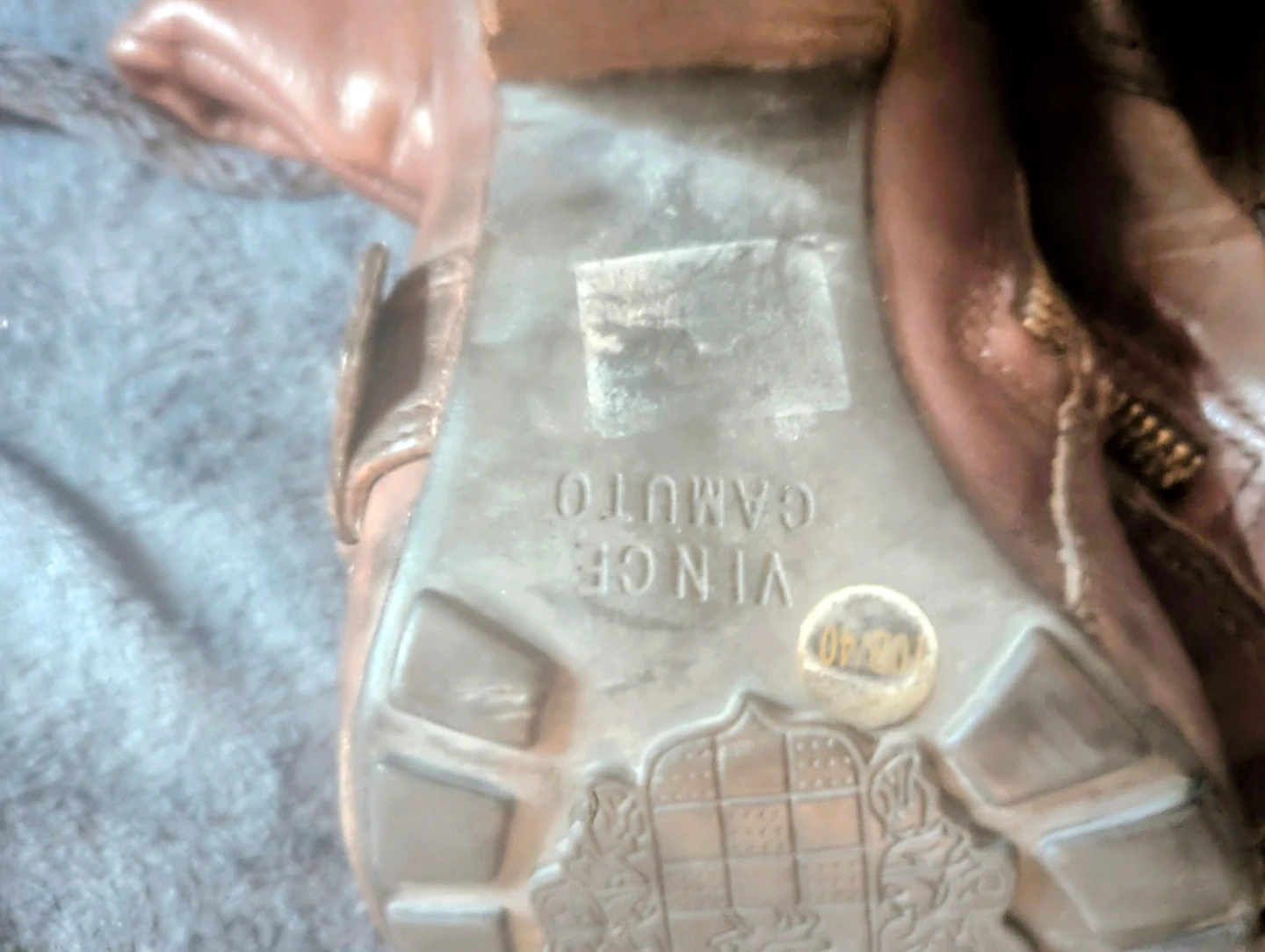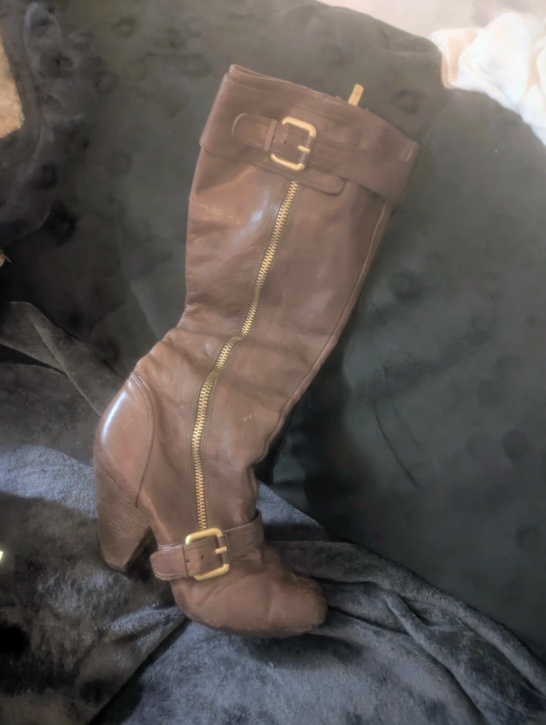 Brown leather knee-high boots with side zippers and buckle details. Heel height is approximately 3 inches. Shaft height is approximately 15 inches. Some signs of wear on the interior lining.