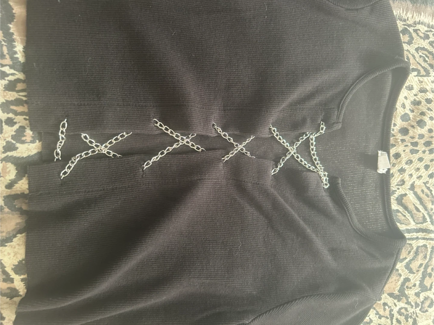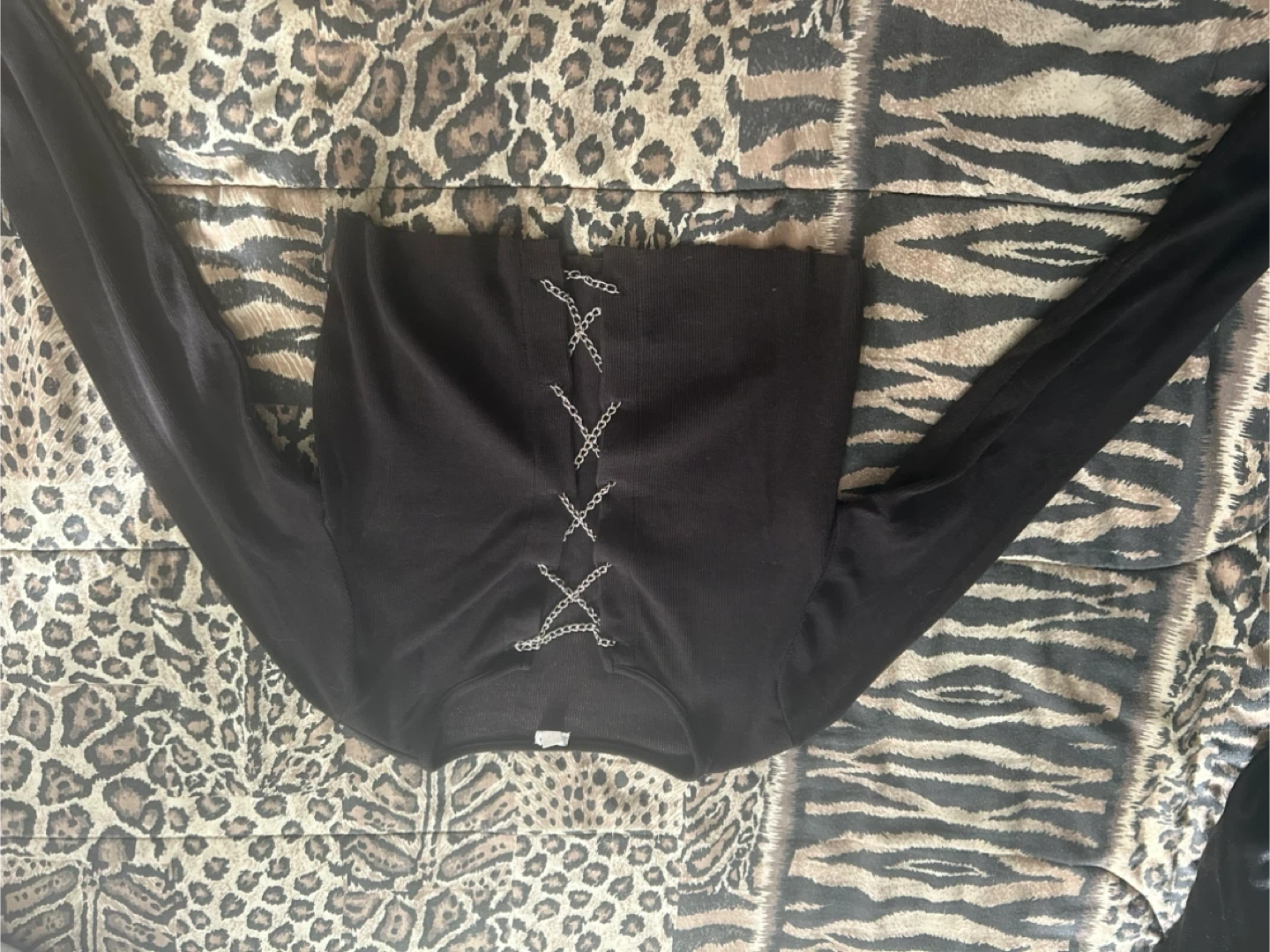 This Garage black long-sleeve top features a unique chain detailing across the front. It's a size P/S. The material feels like a soft ribbed knit.