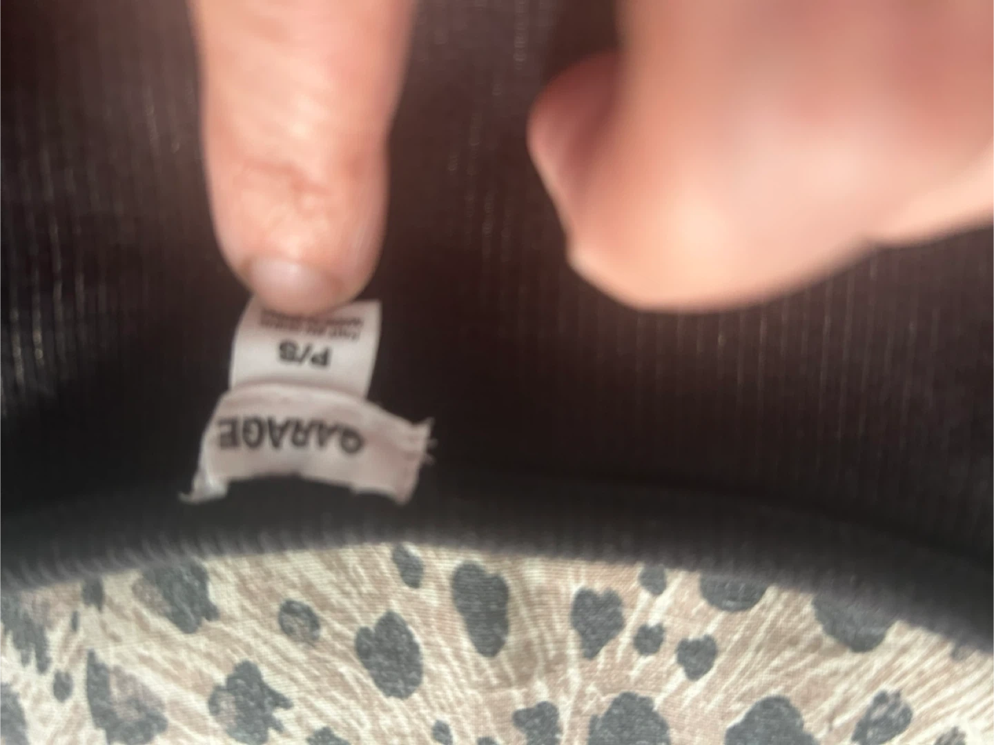 This Garage black long-sleeve top features a unique chain detailing across the front. It's a size P/S. The material feels like a soft ribbed knit.